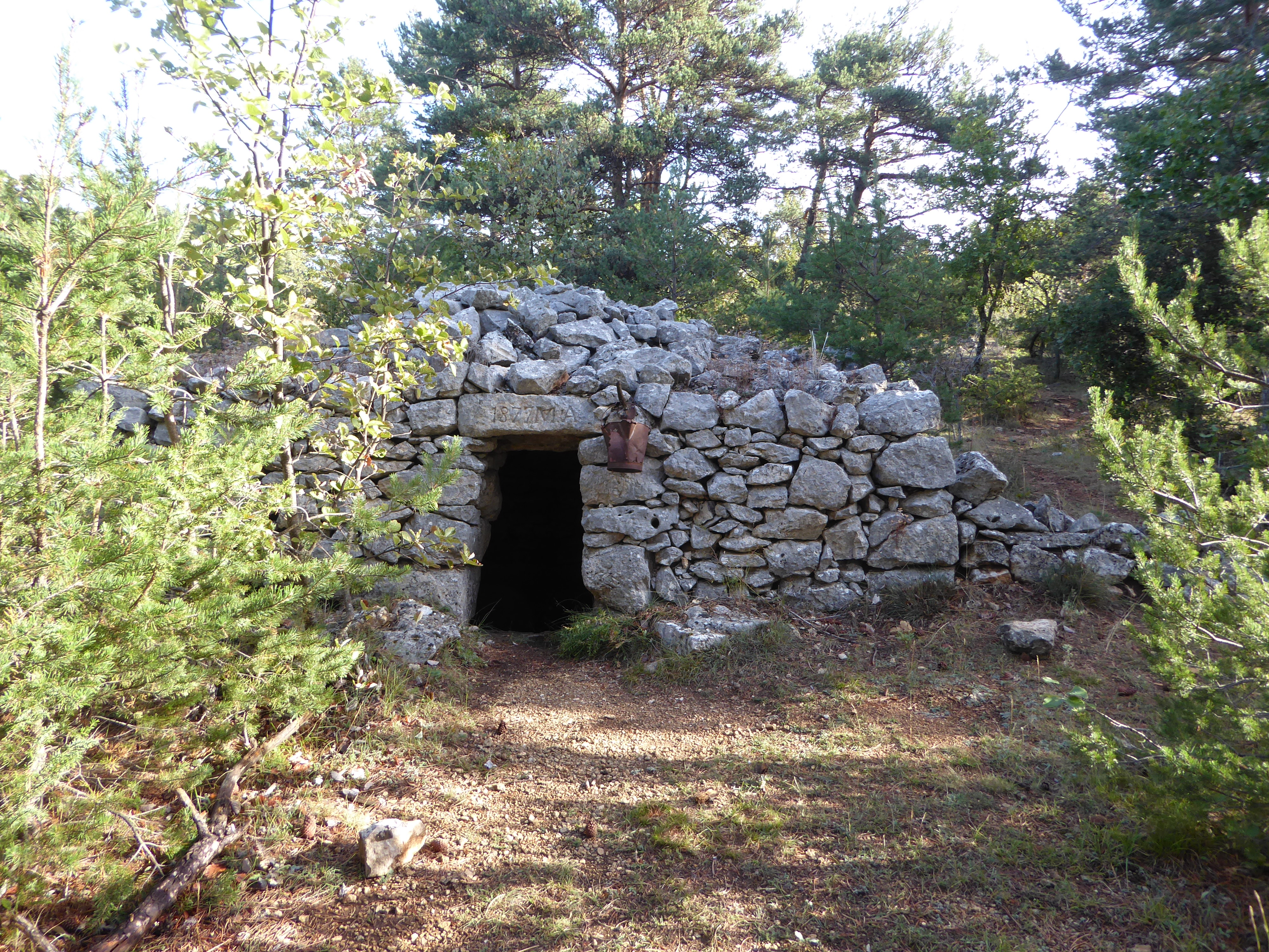 Au niveau d'une borie située juste avant une épingle, suivre le chemin raccourci de gauche direction Saint-Saturnin-lès-Apt, balisé en jaune et points verts (n°5)