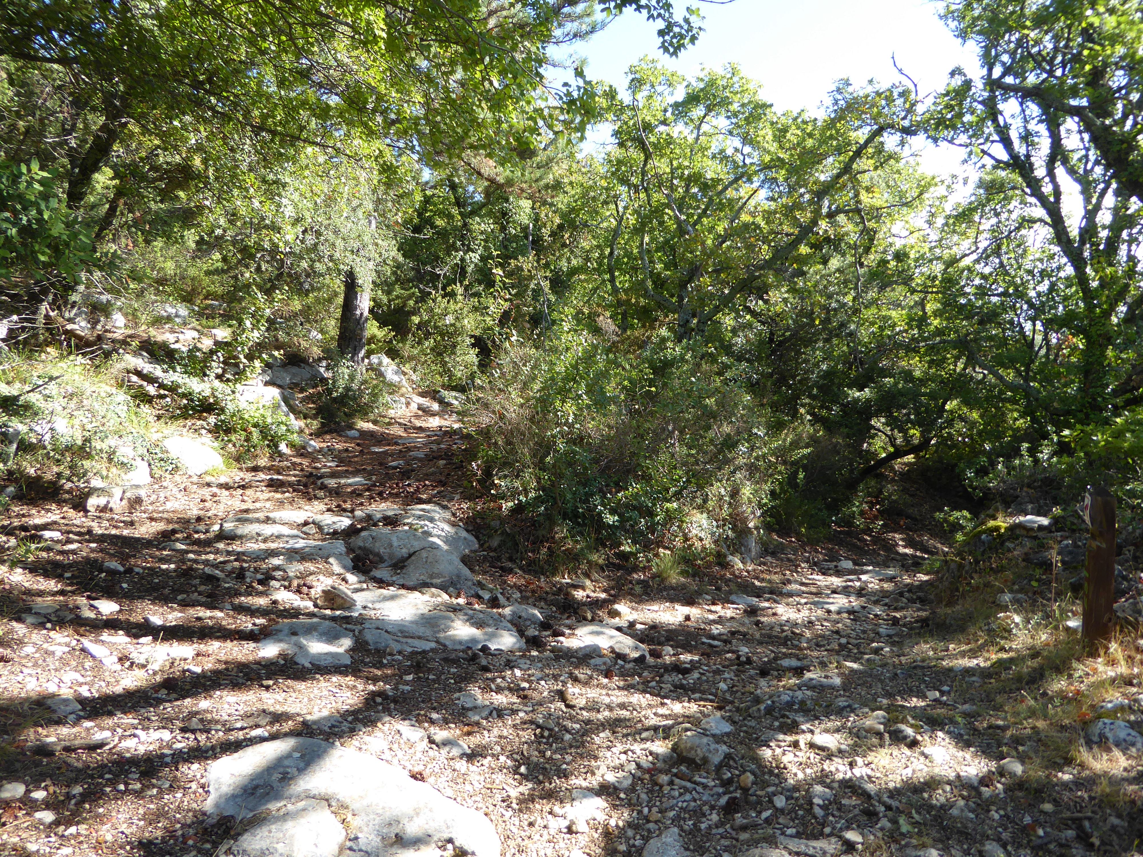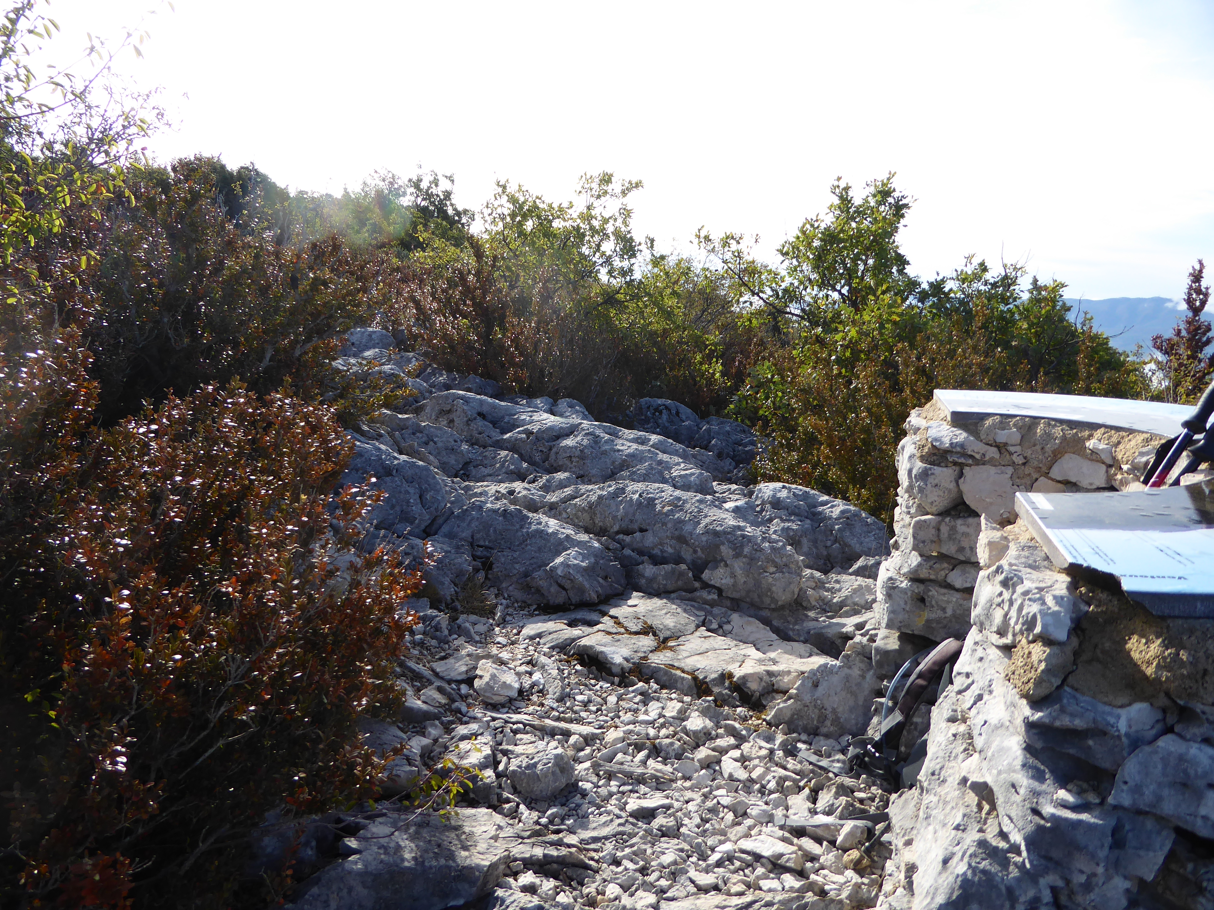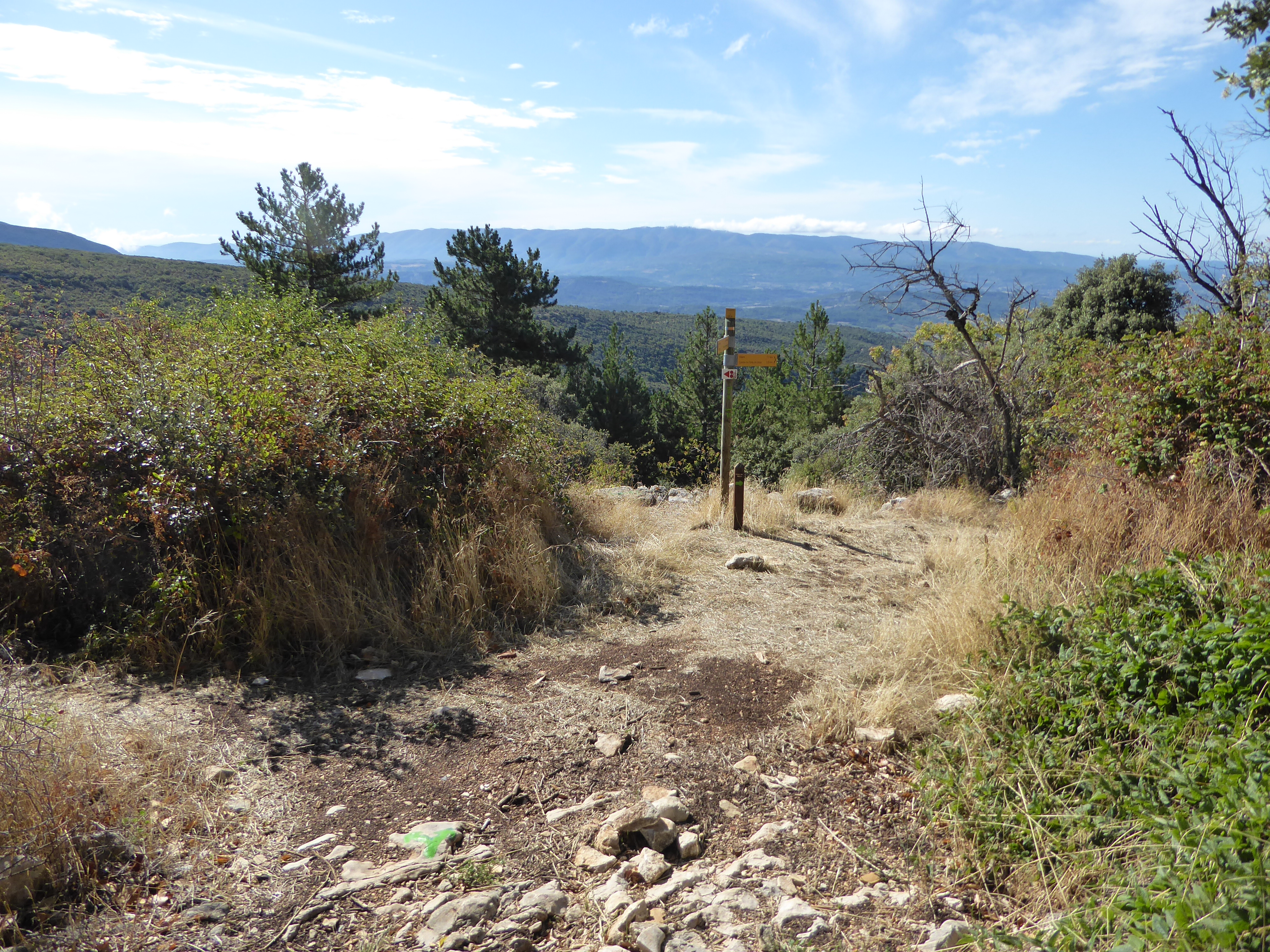 Redescendre du sommet par le même chemin que celui de l'aller direction Saint-Saturnin-lès-Apt, balisé en points verts (n°5)