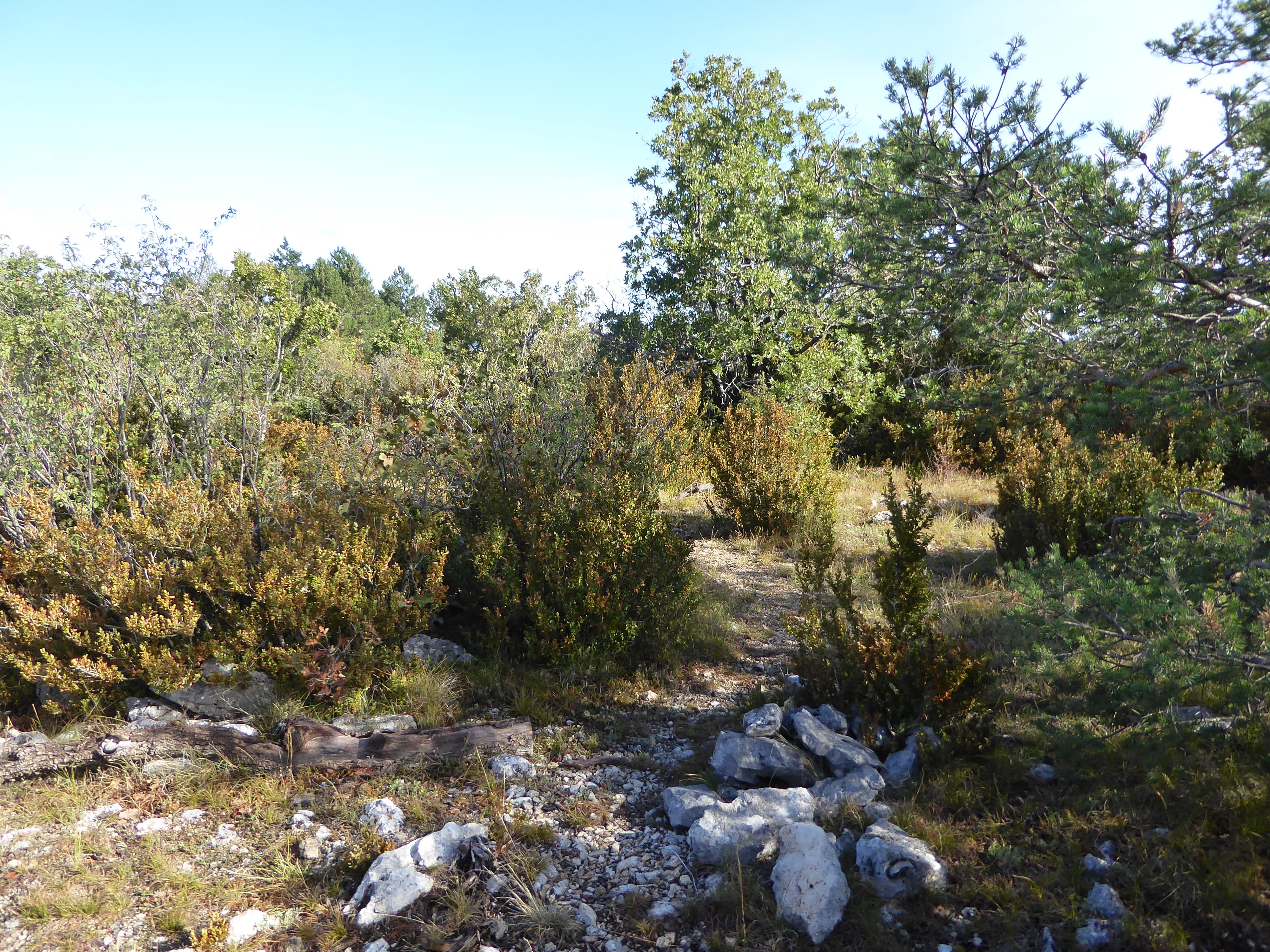 Croix de Bonnefoy (899 m) : suivre le chemin montant sur la gauche direction Travignon, balisé en rouge et blanc et points verts (n°5)