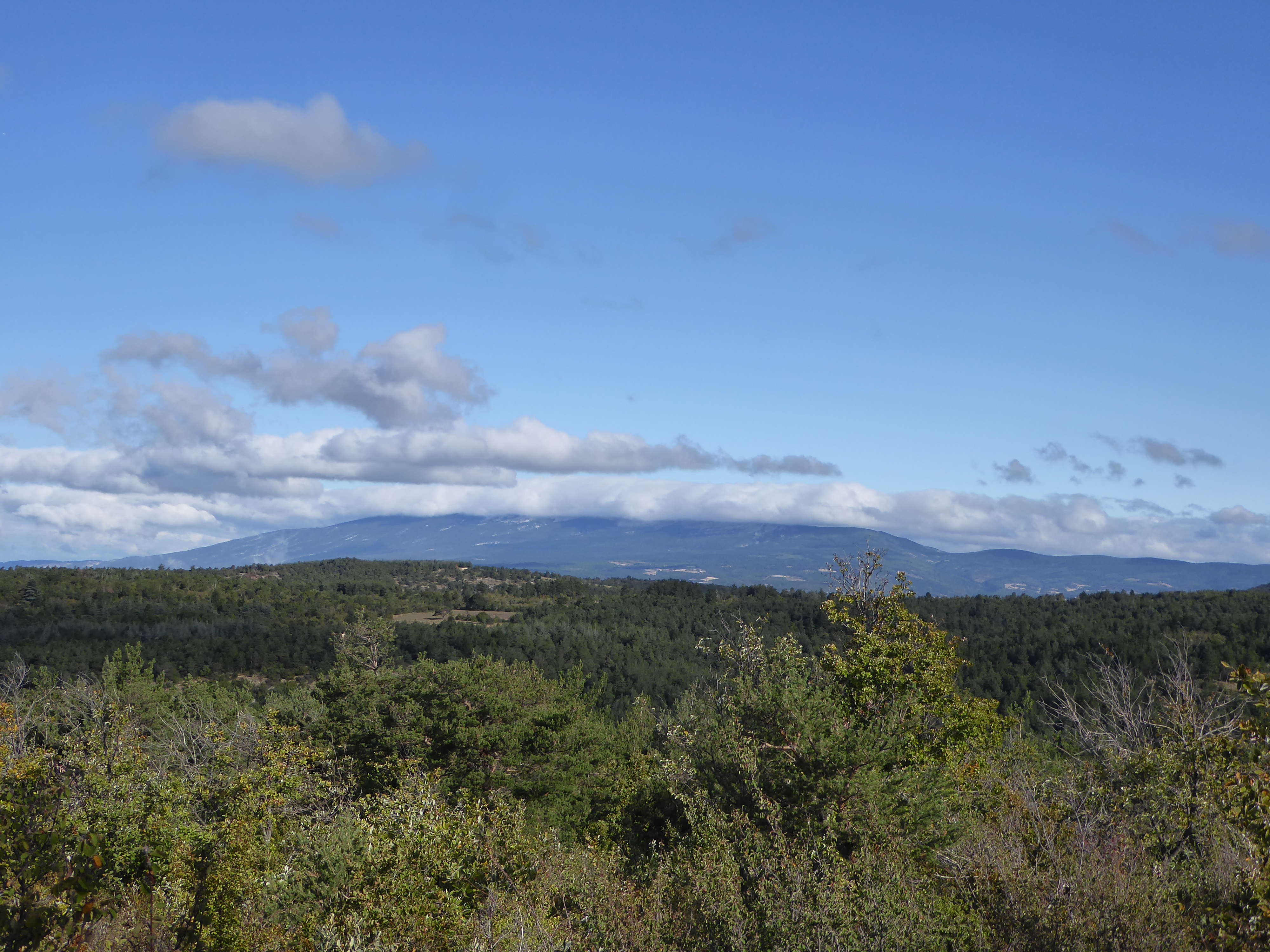 Arrivée au sommet du Cluyer (1054 m) : panorama étendu sur le Luberon avec le Mourre Nègre, le Petit Luberon, le Ventoux masqué par les nuages ... et la plaine du Calavon jusqu'à Cavaillon