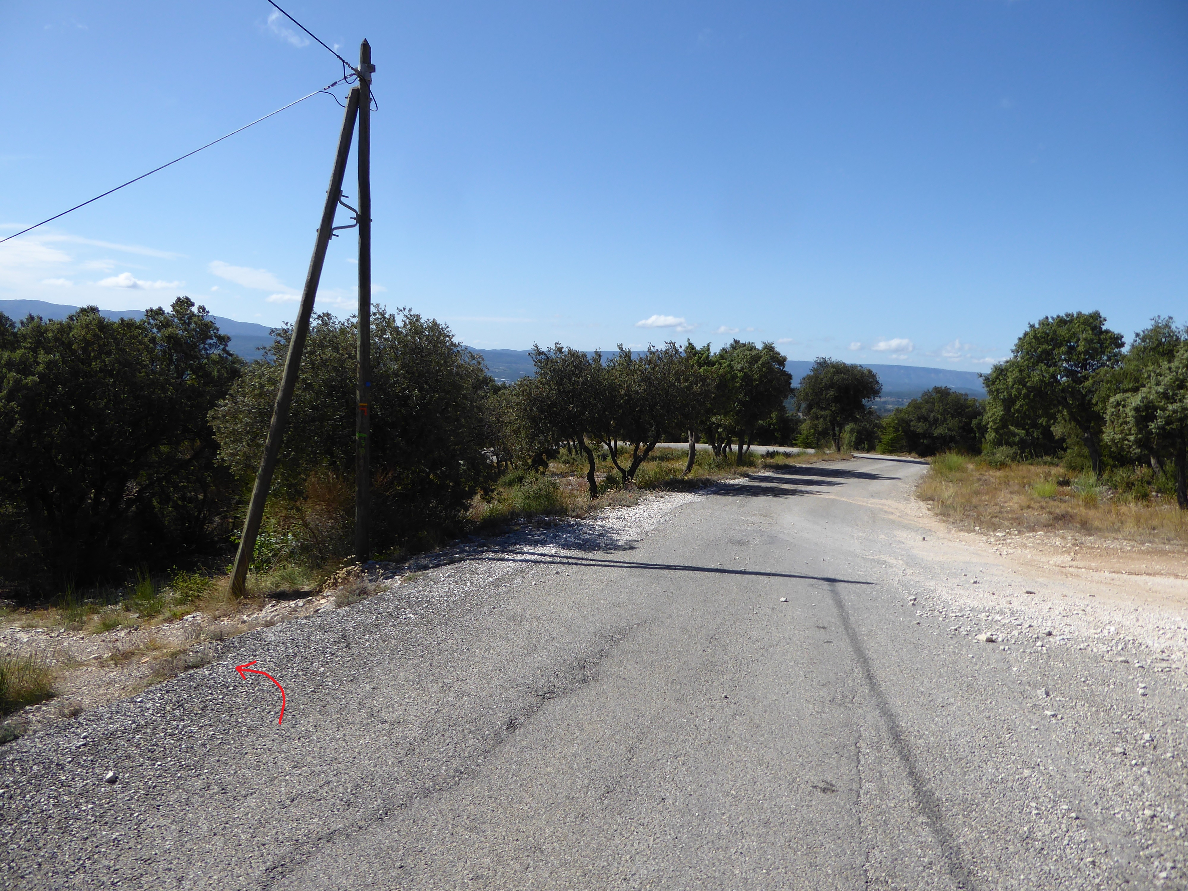 Romanet (558 m) : tourner à gauche et suivre la route goudronnée direction Saint-Saturnin-lès-Apt, balisé en jaune et points verts (n°5)