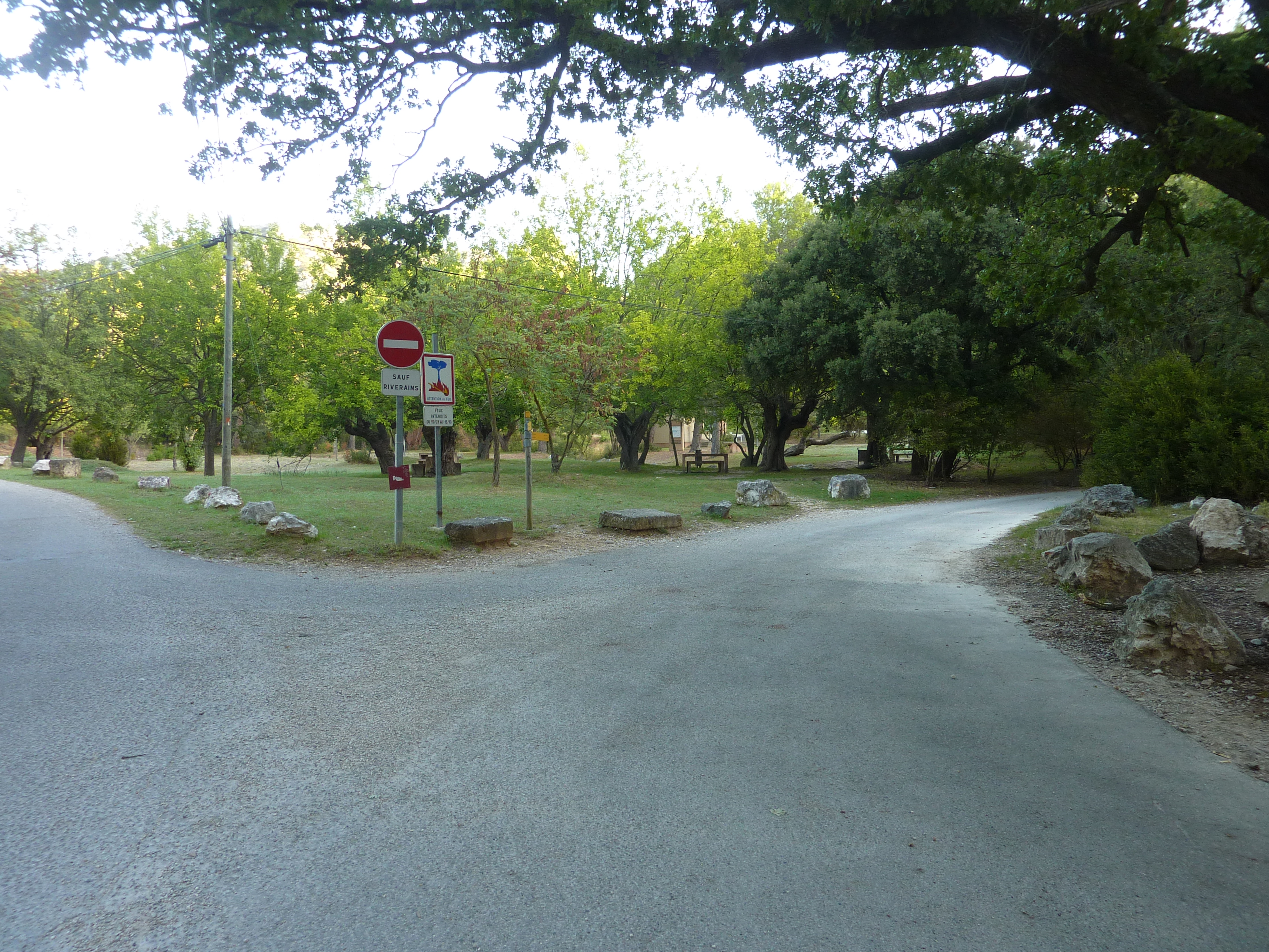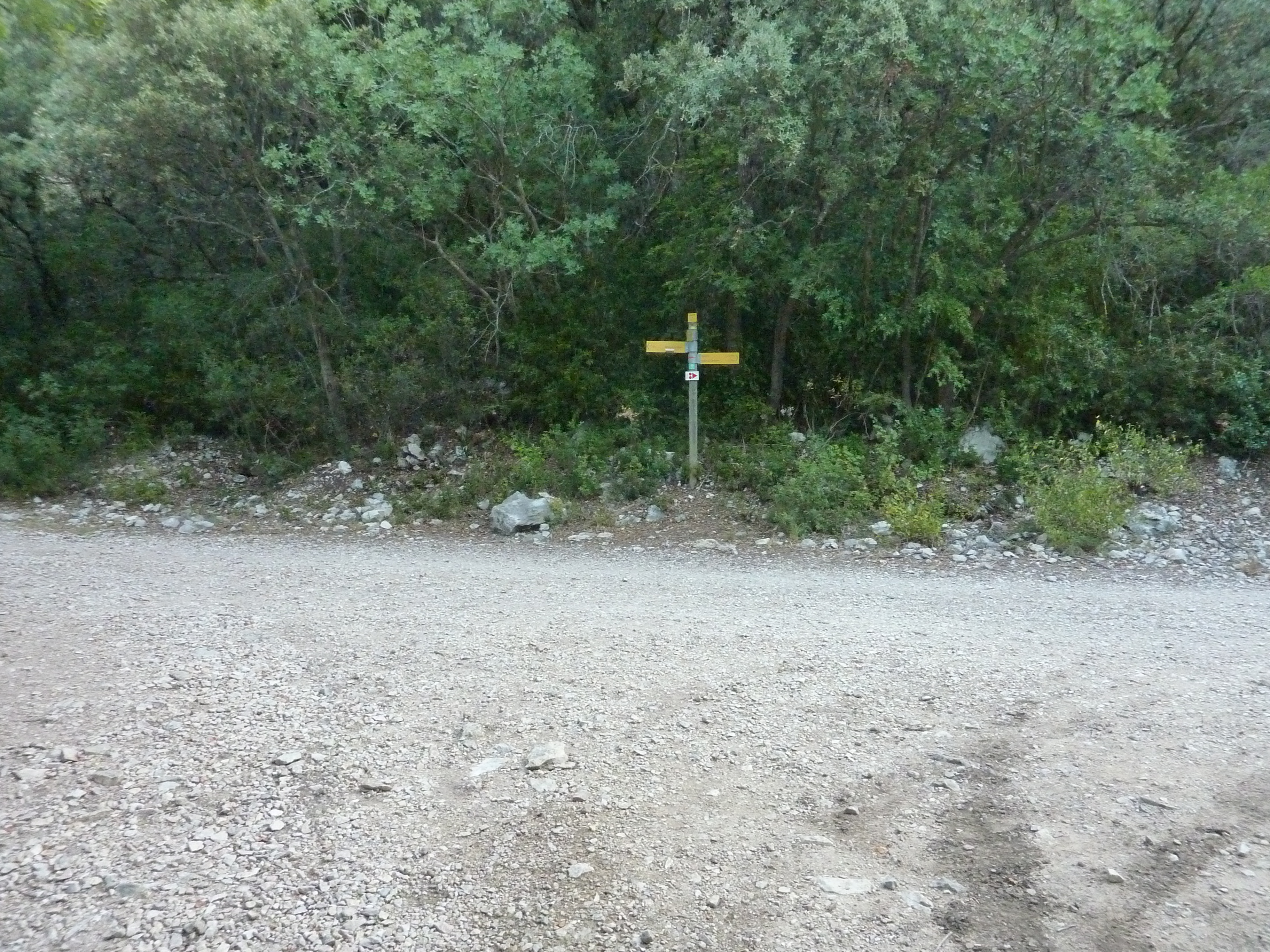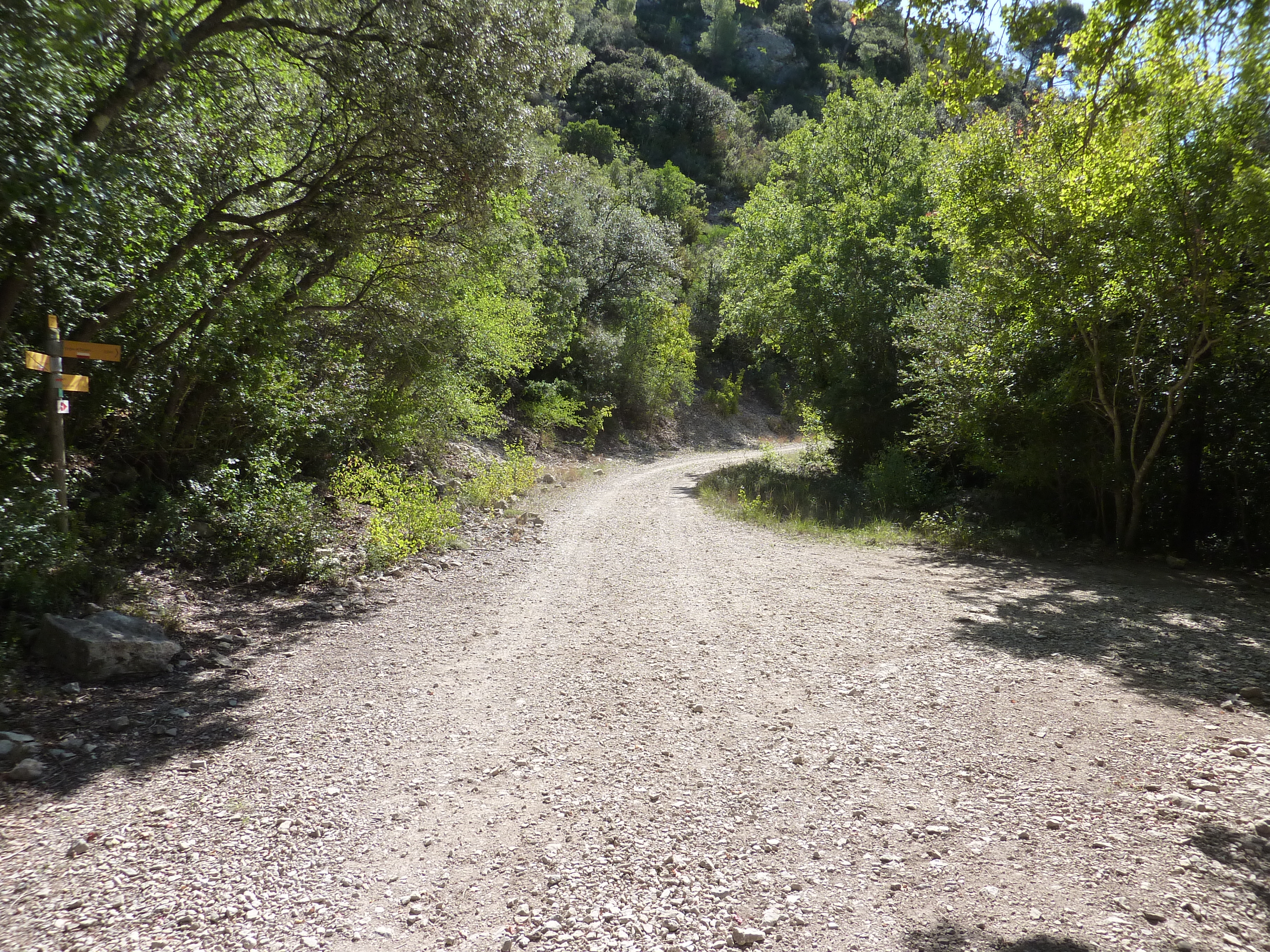 A ce croisement à l'entrée des Gorges de Régalon, suivre le chemin partant tout droit au fond des gorges direction Gorges de Régalon