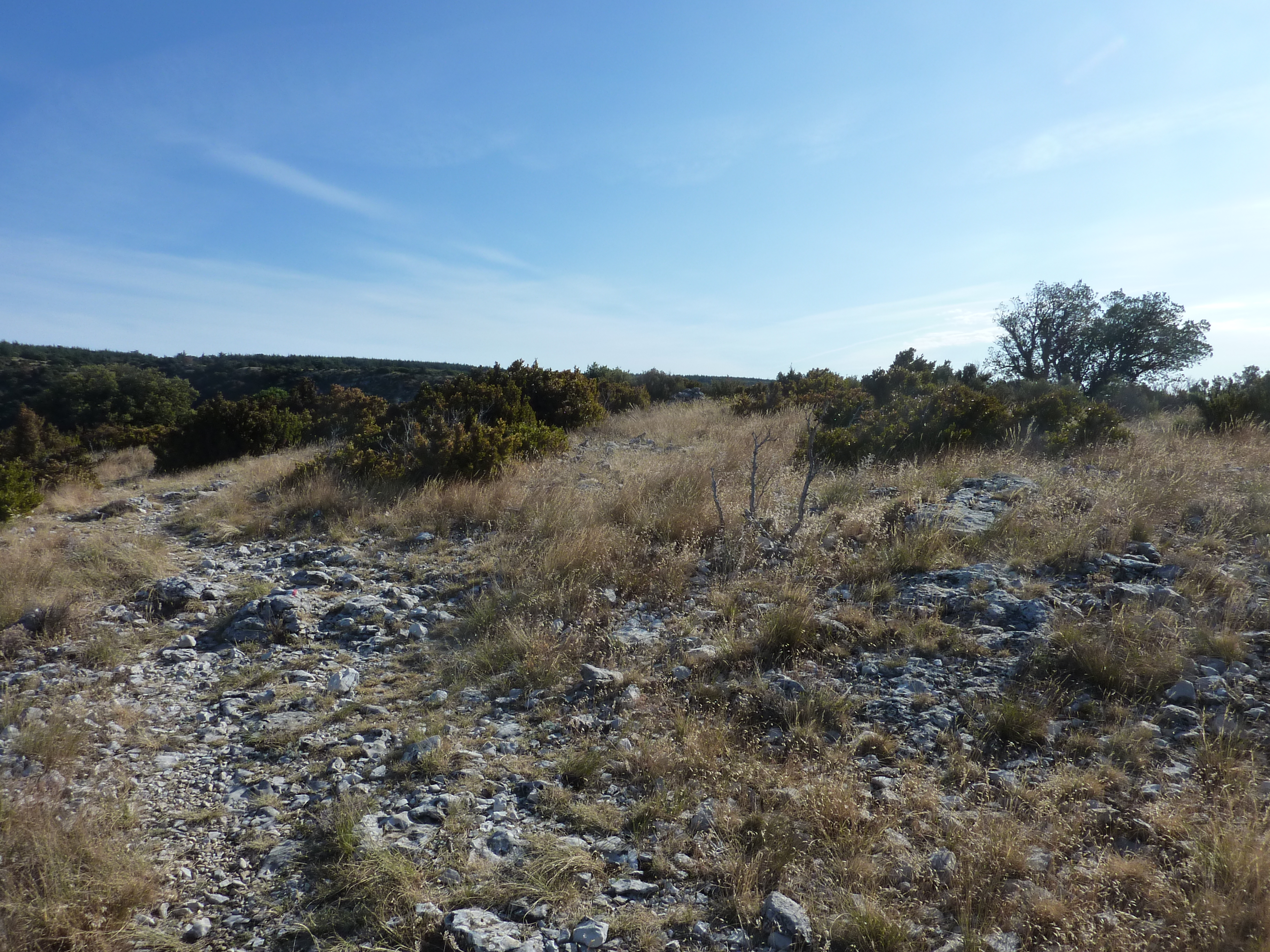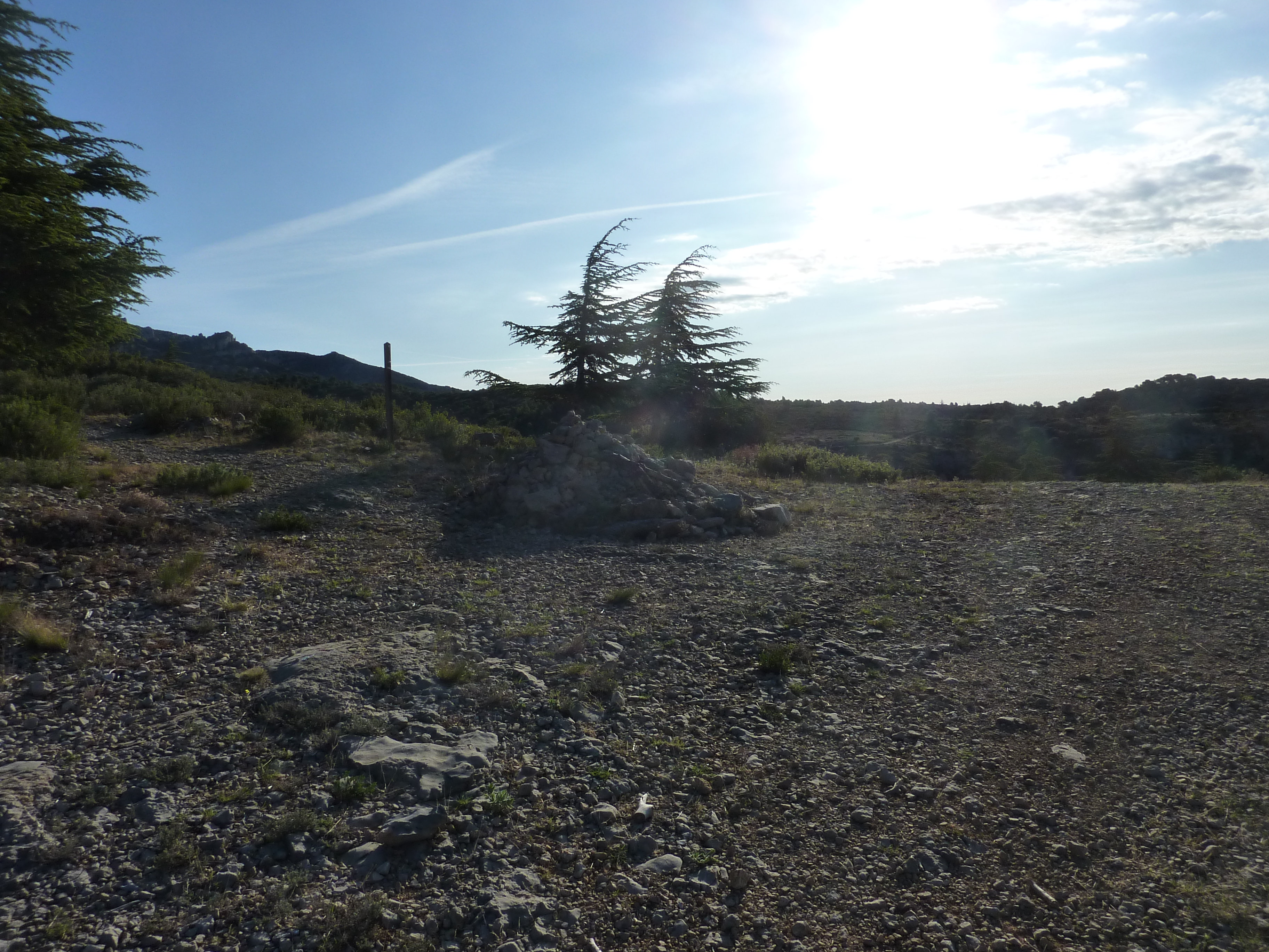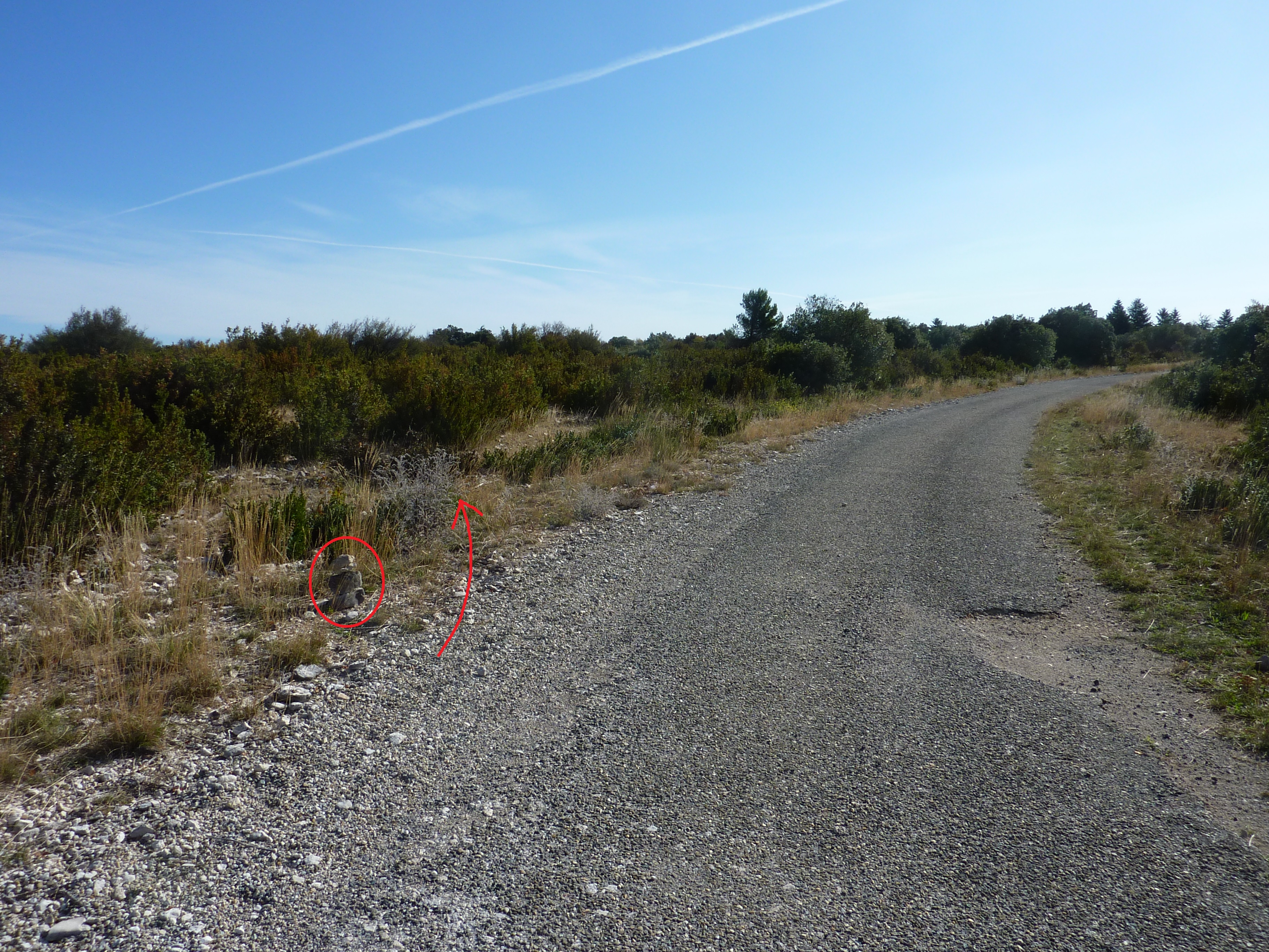 Au niveau de ce cairn (1000 mètres après le lieu-dit "Le Pradon"), quitter la route pour atteindre le sommet du Mourre de Cairas (cheminement hors sentier et à vue à travers la garrigue) direction Mourre de Cairas, aucun balisage dorénavant (rejoindre un point dégagé pour le panorama sur le Ventoux)