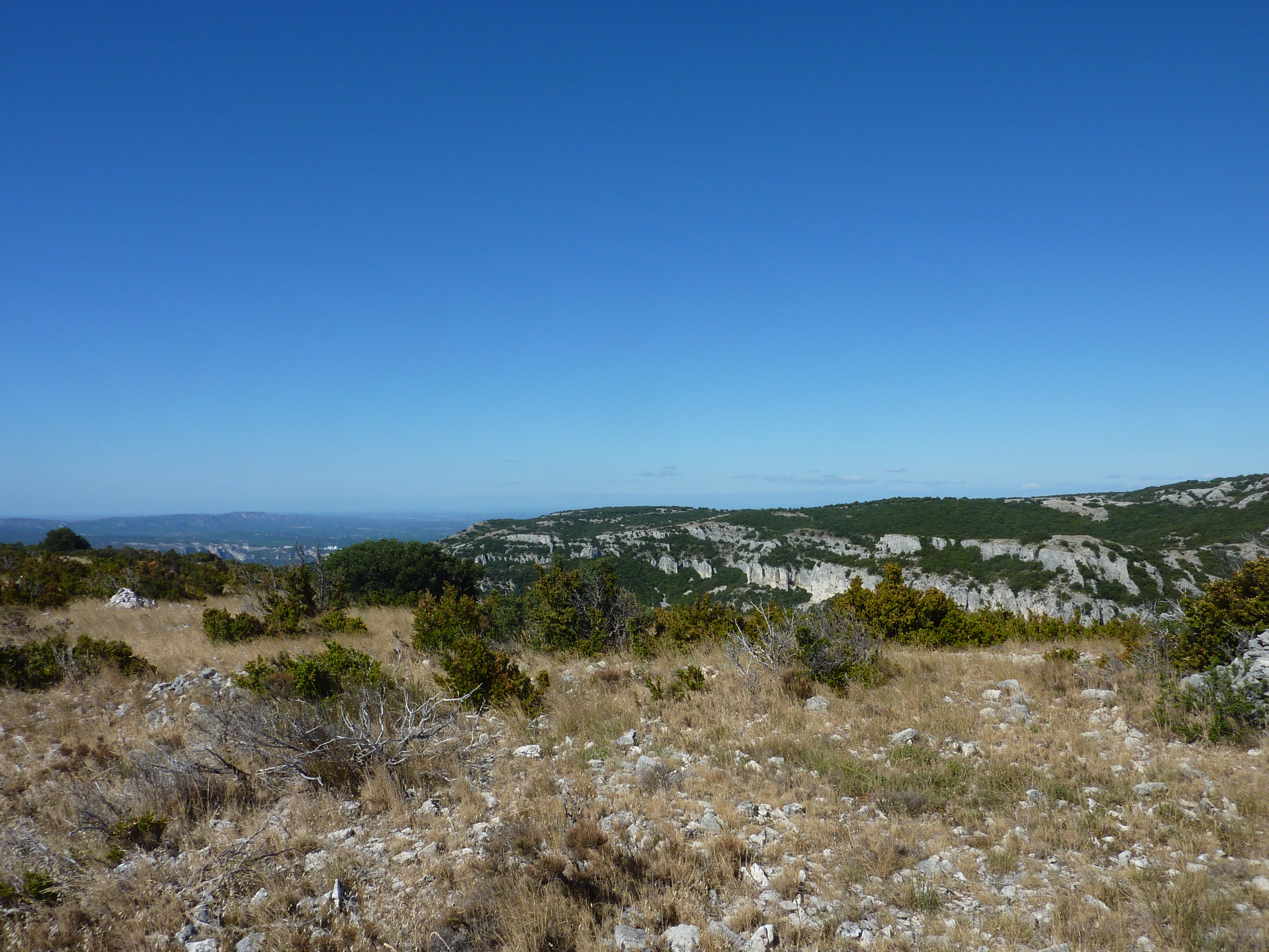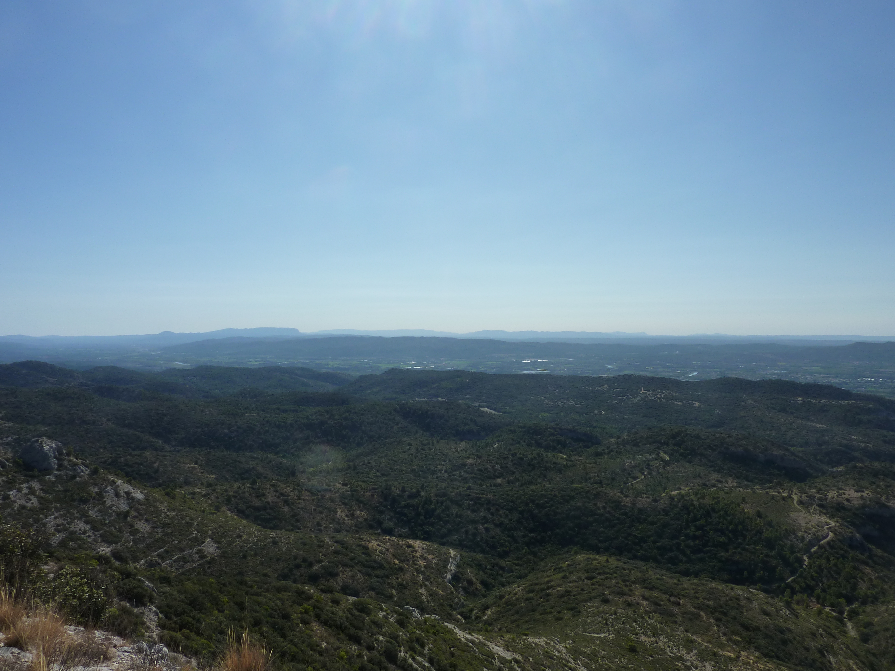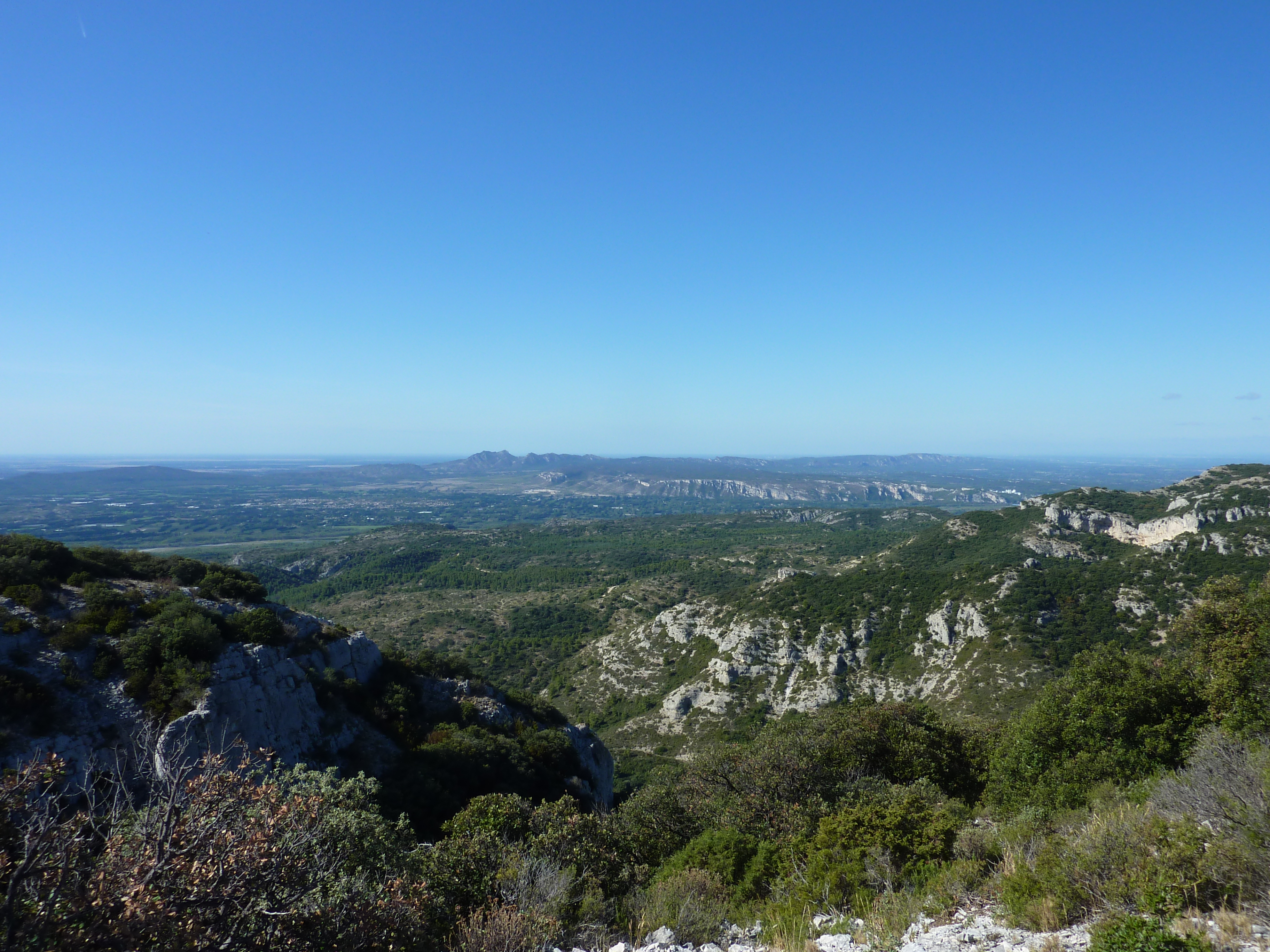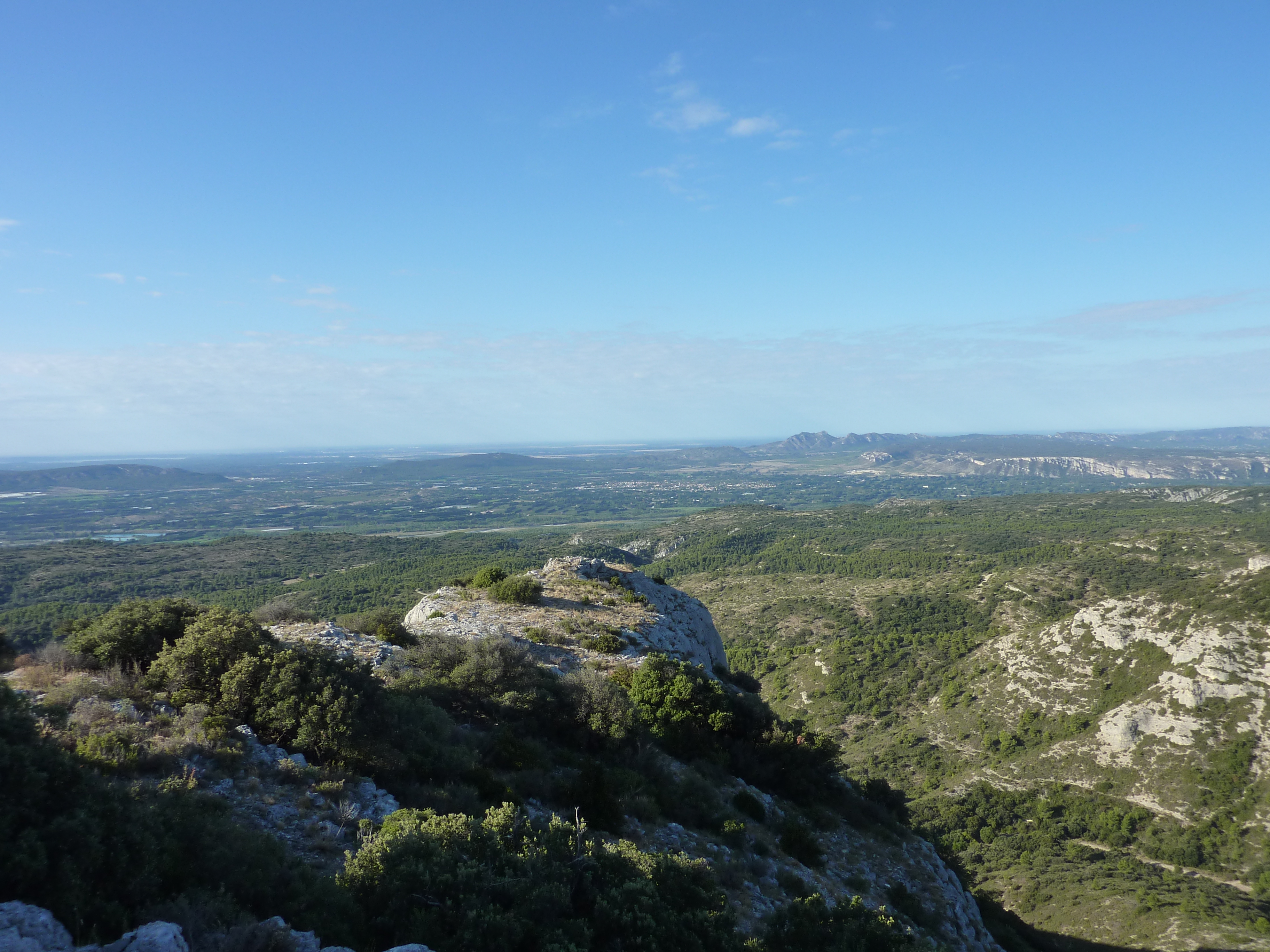 Arrivée au sommet du Serre Long (651 m) : belle vue sur les crêtes du Petit Luberon mais aussi sur les sommets de la Sainte-Baume, du littoral des Bouches-du-Rhône, des Alpilles et sur la plaine provençale (panorama pris en amont du sommet, vue plus dégagée)