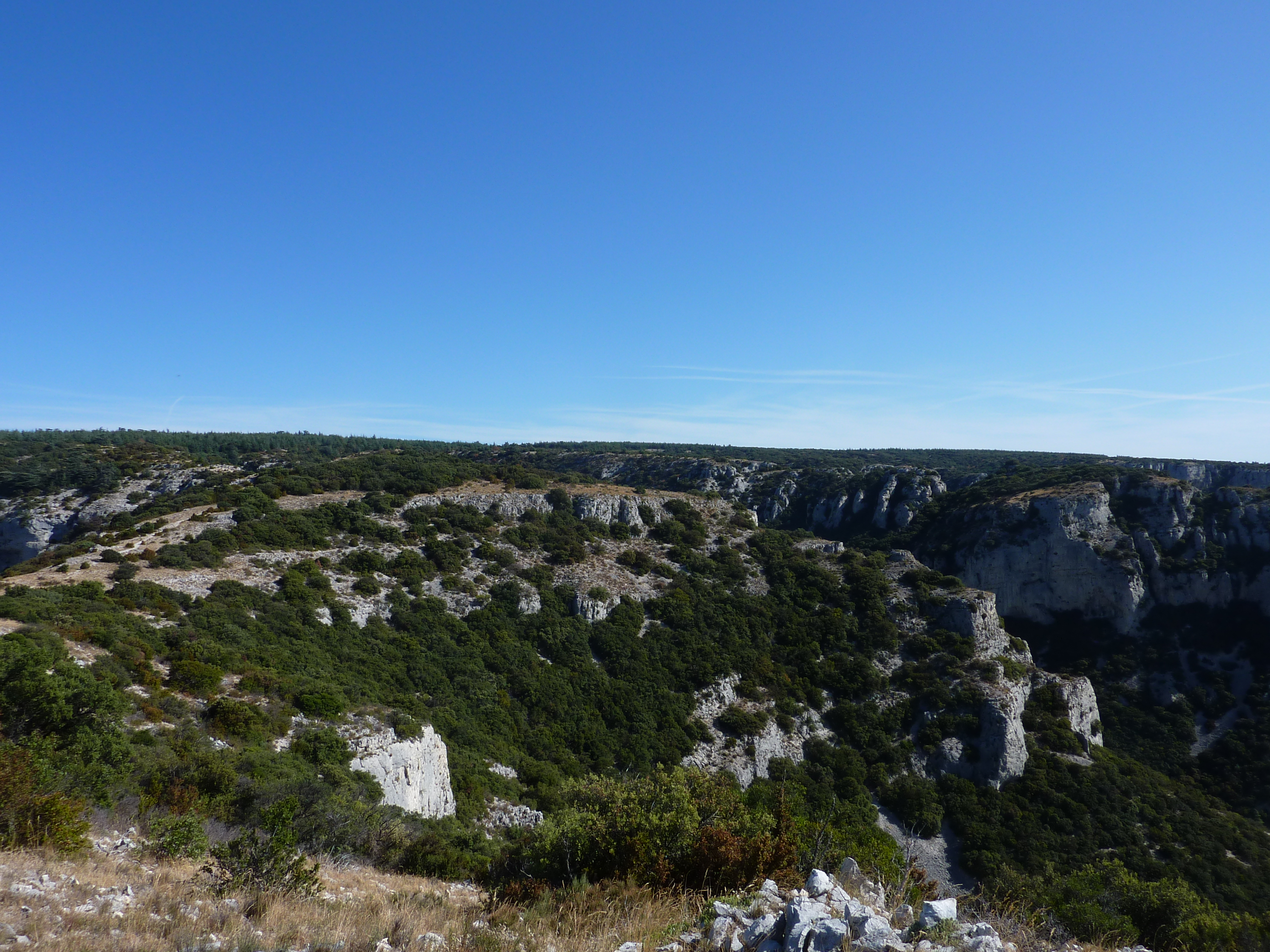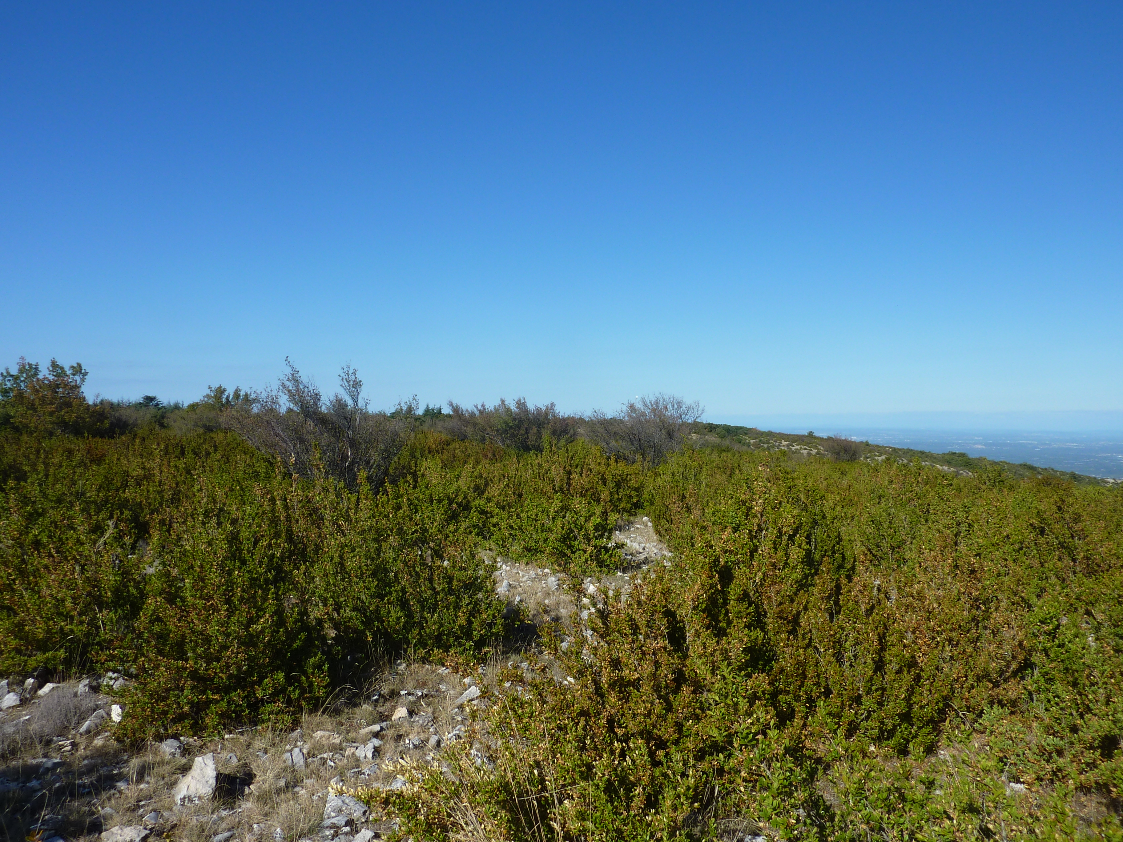 Arrivée au sommet du Mourre de Cairas (726 m) : panorama partiellement masqué par la végétation des crêtes du Petit Luberon mais beau point de vue sur le Ventoux et les Monts de Vaucluse
