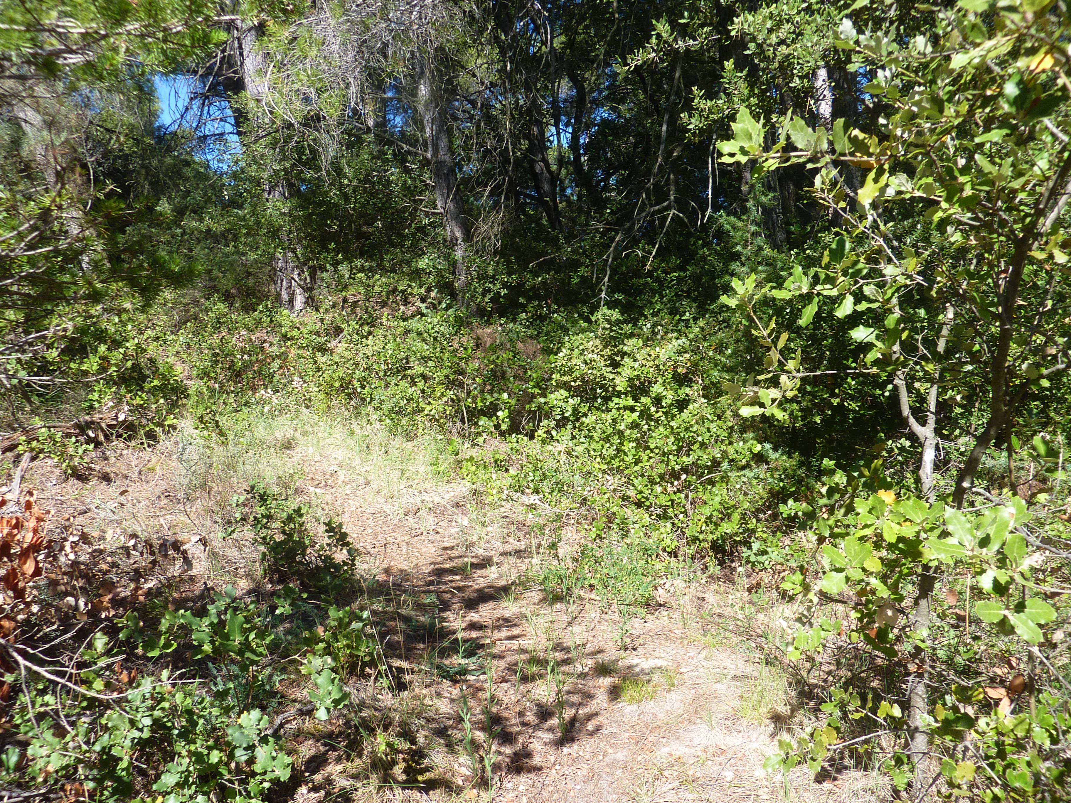 A ce croisement (400 mètres après le précédent) (481 m), suivre le chemin montant sur la gauche et suivant le fil de crête de l'Arfuyen direction Arfuyen (de nombreuses petites branches sont présentes à proximité du sol sur le chemin qui peuvent griffer les jambes ...)
