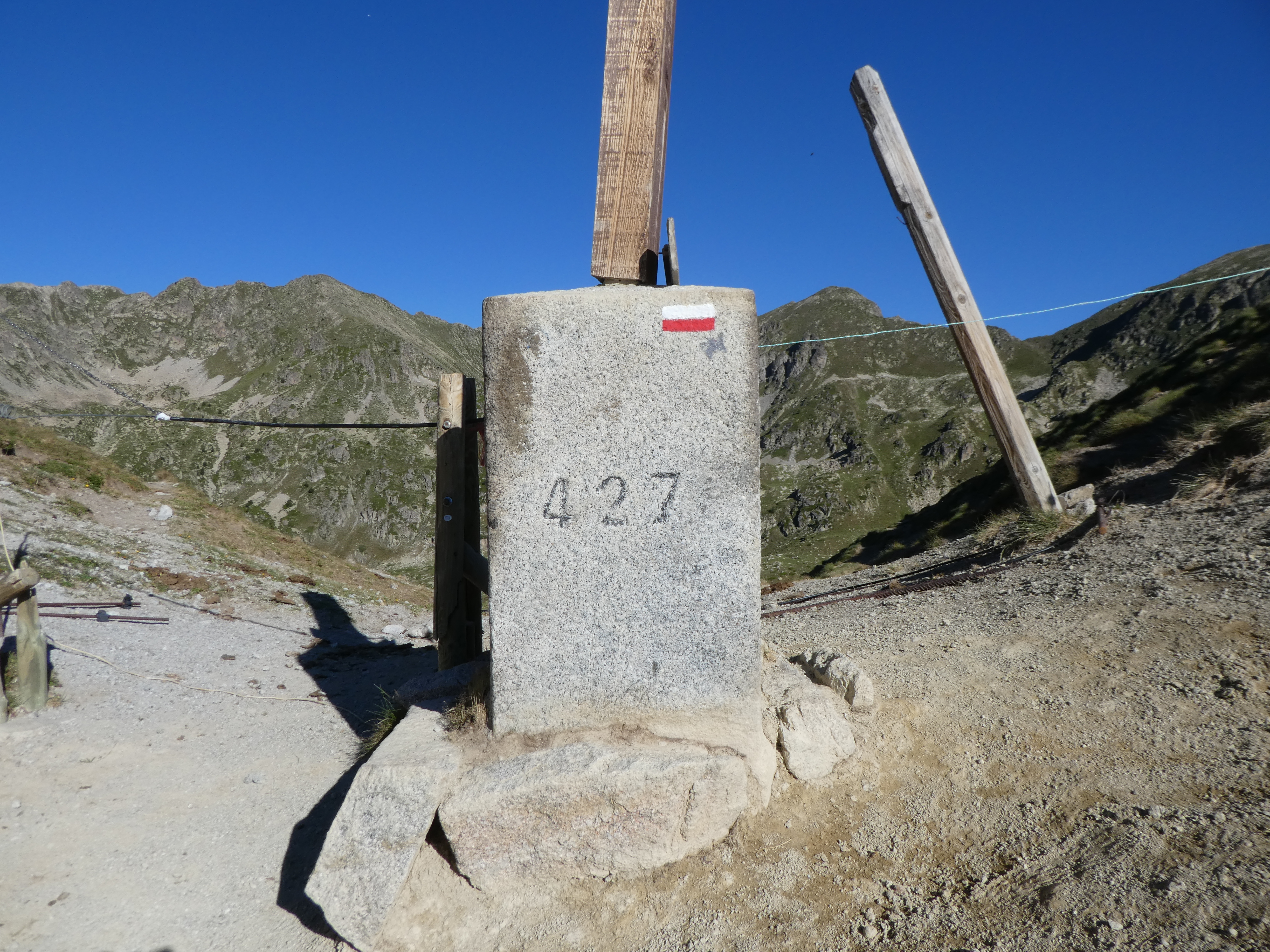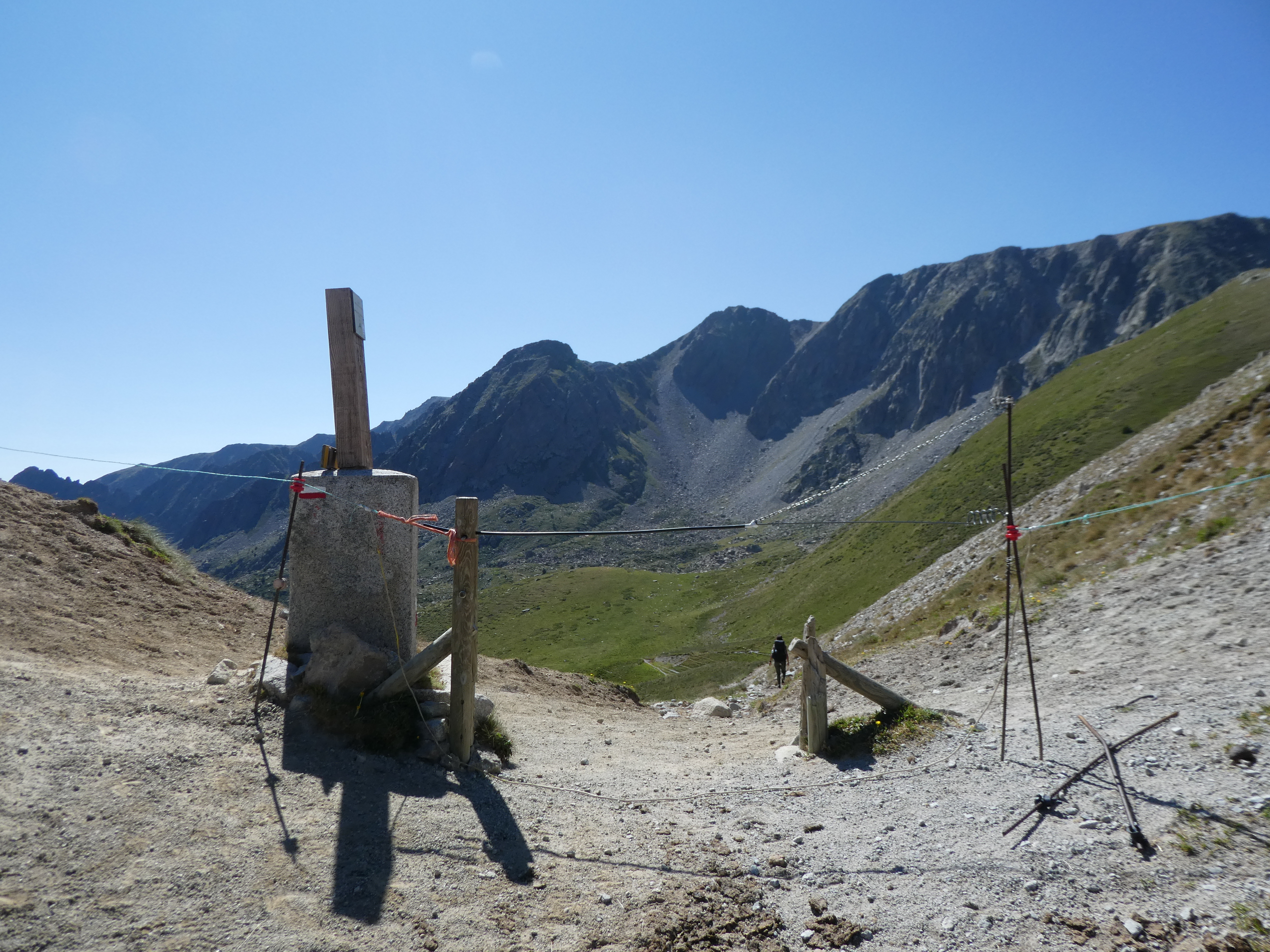 Portella Blanca d'Andorra (2517 m) : frontière franco-hispano-andorrane (entrée dans la Principauté d'Andorre) : suivre le GR7 partant sur la gauche direction Pic d'Engaït, balisé en rouge et blanc dorénavant