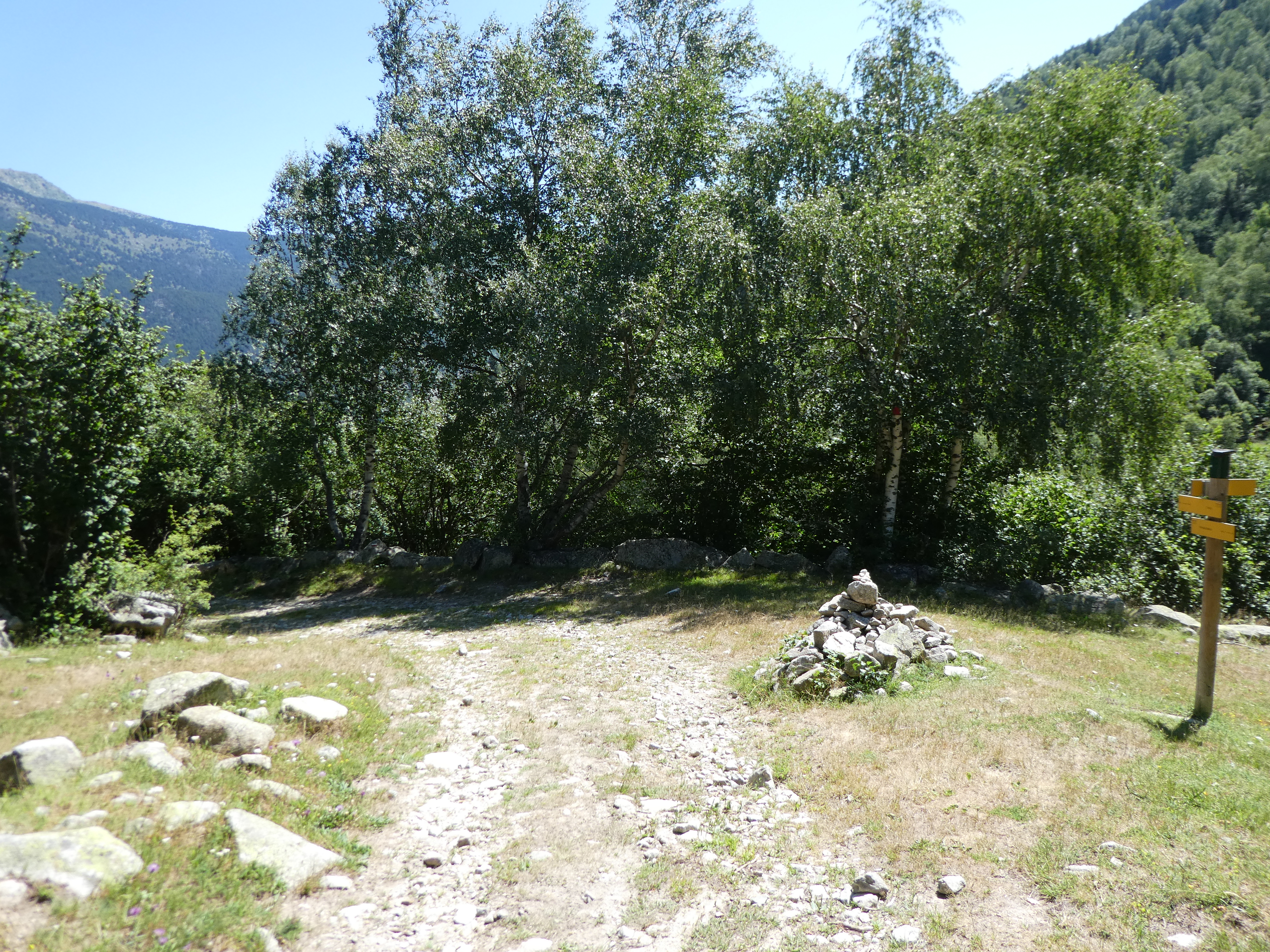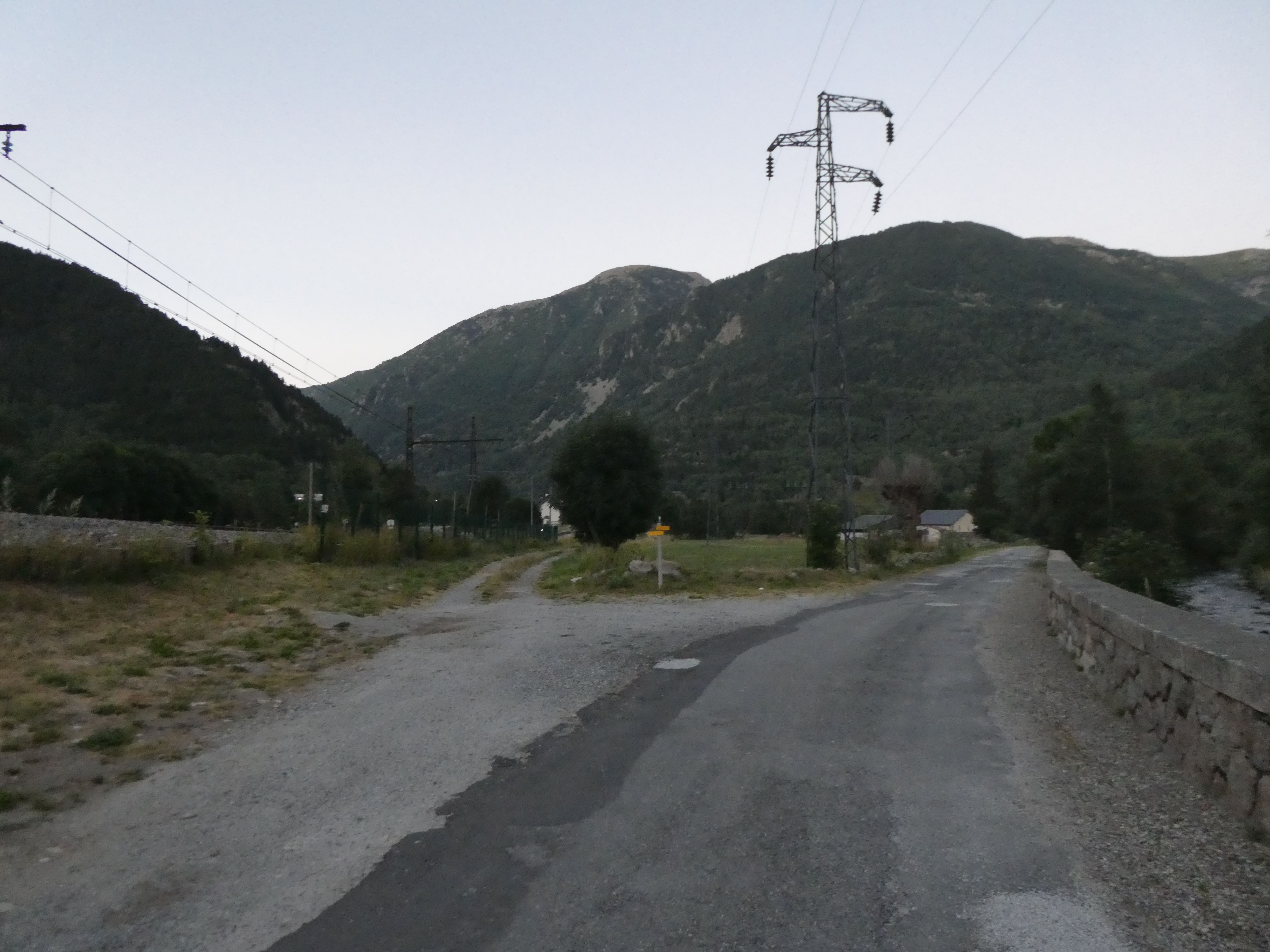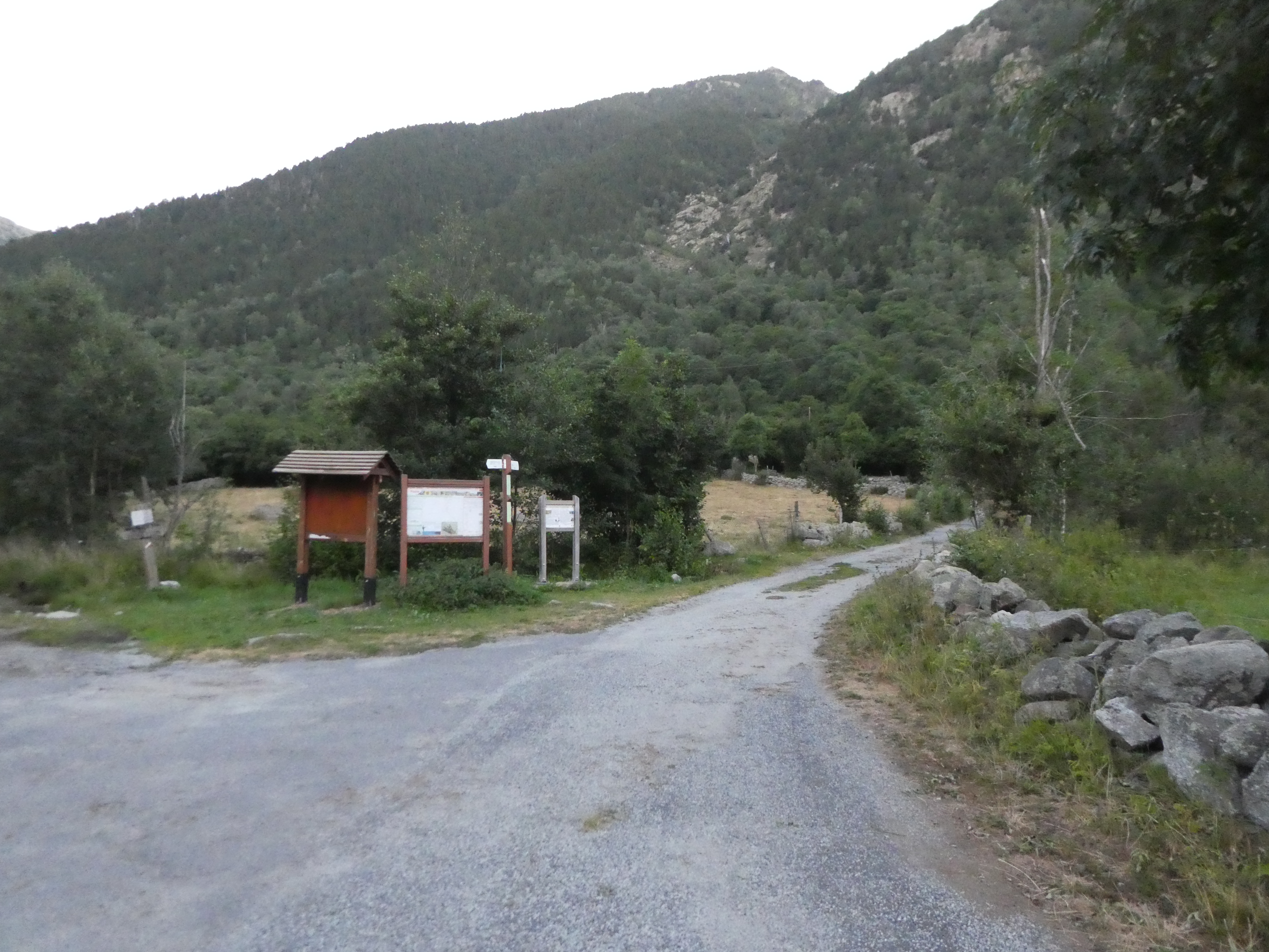 A cette intersection marquée par la présence d'un panneau directionnel (50 mètres après le départ), suivre la route partant sur la gauche direction Vallée du Campcardós, balisé en rouge et blanc dorénavant