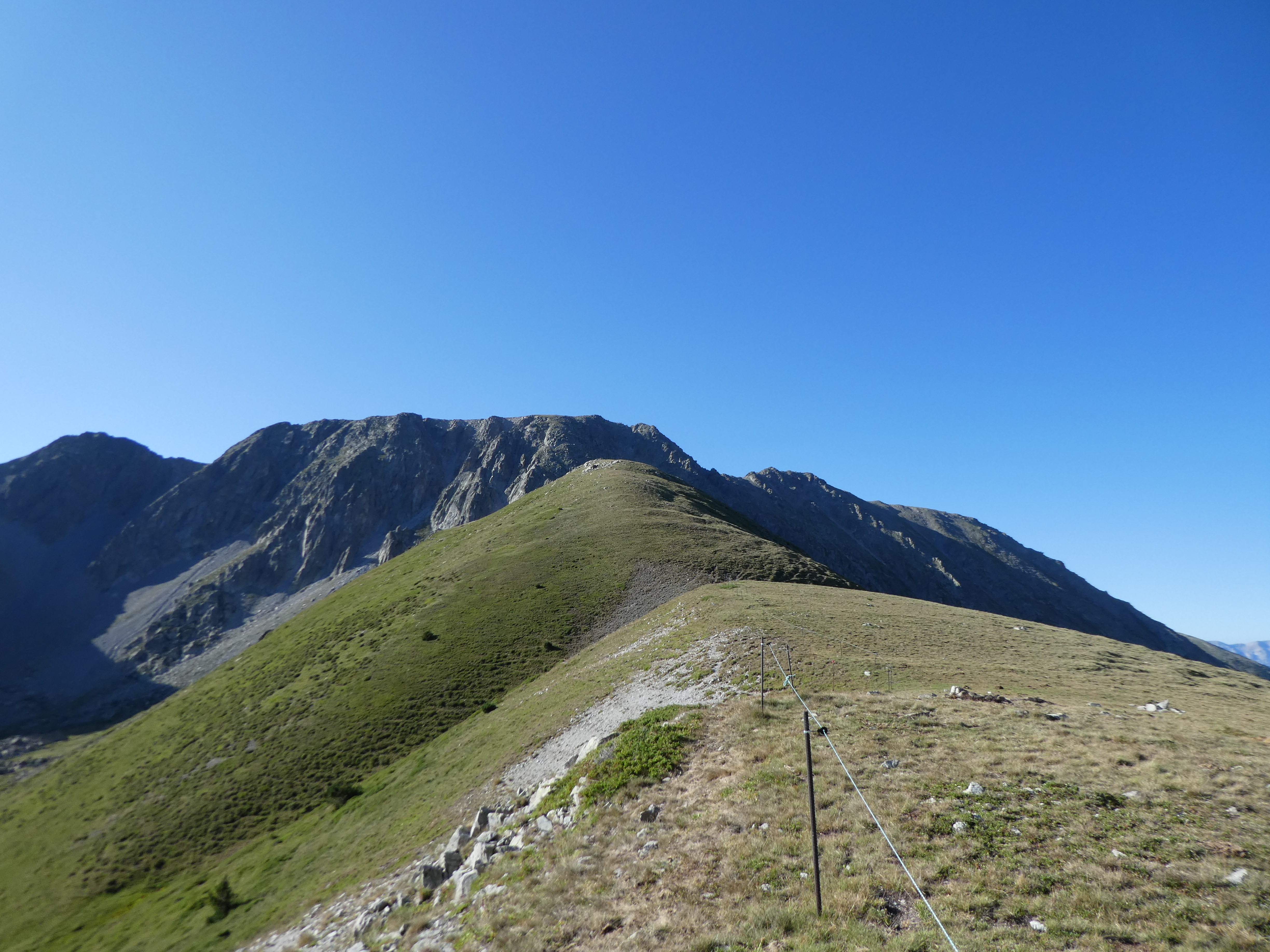 Redescendre du sommet en suivant la crête frontière entre la France et l'Espagne partant plein Nord direction Portella Blanca d'Andorra (descente raide)