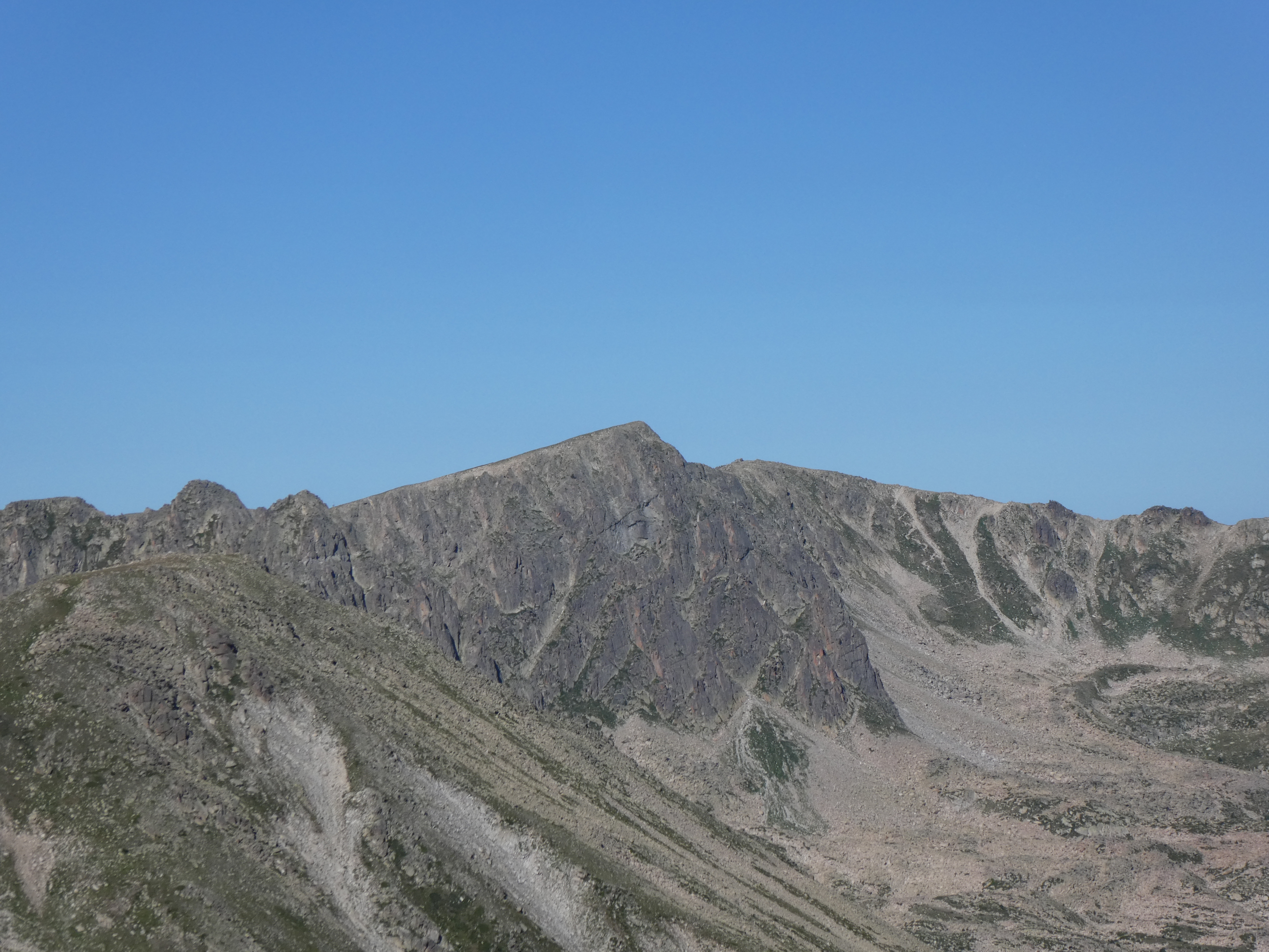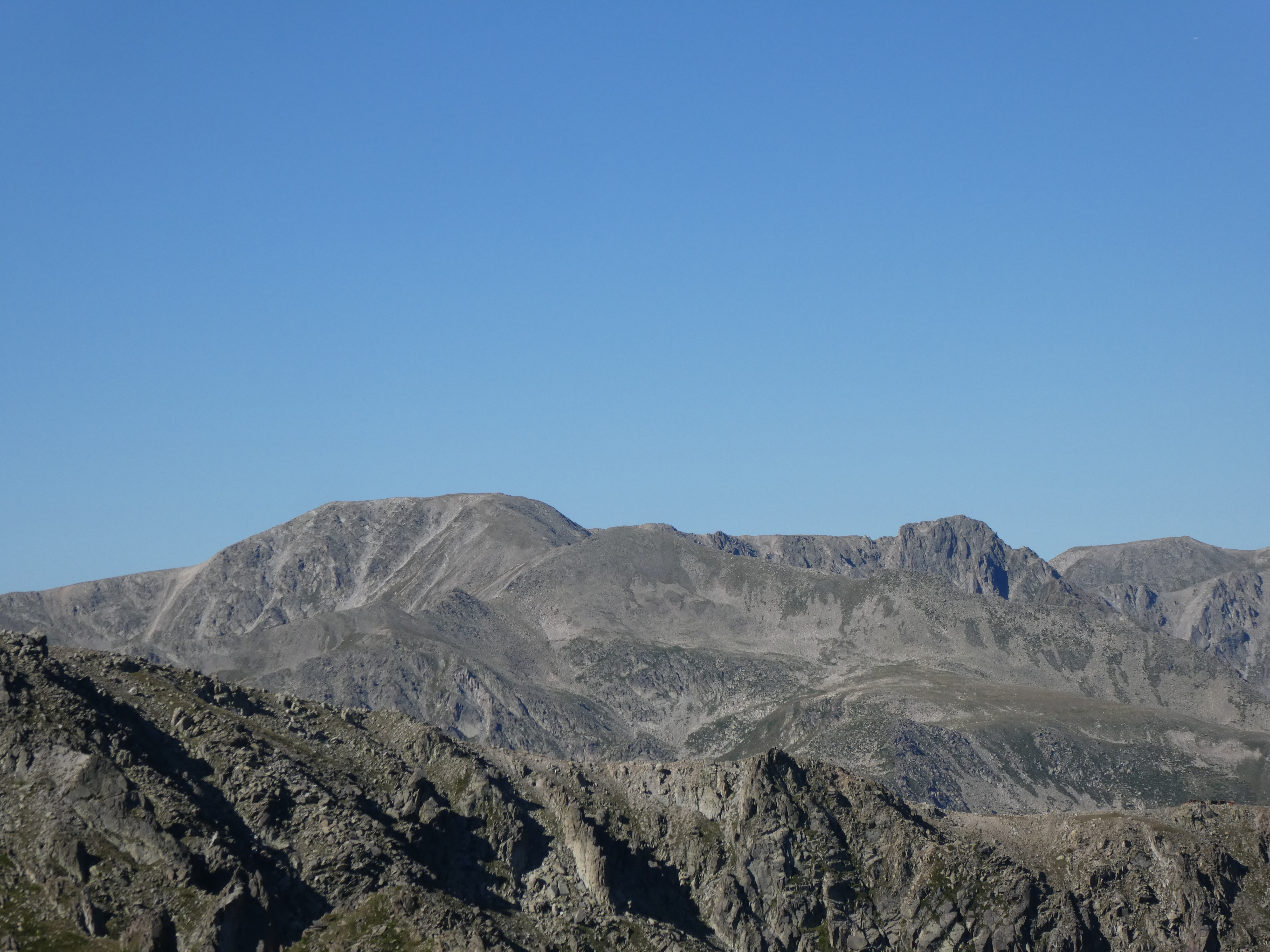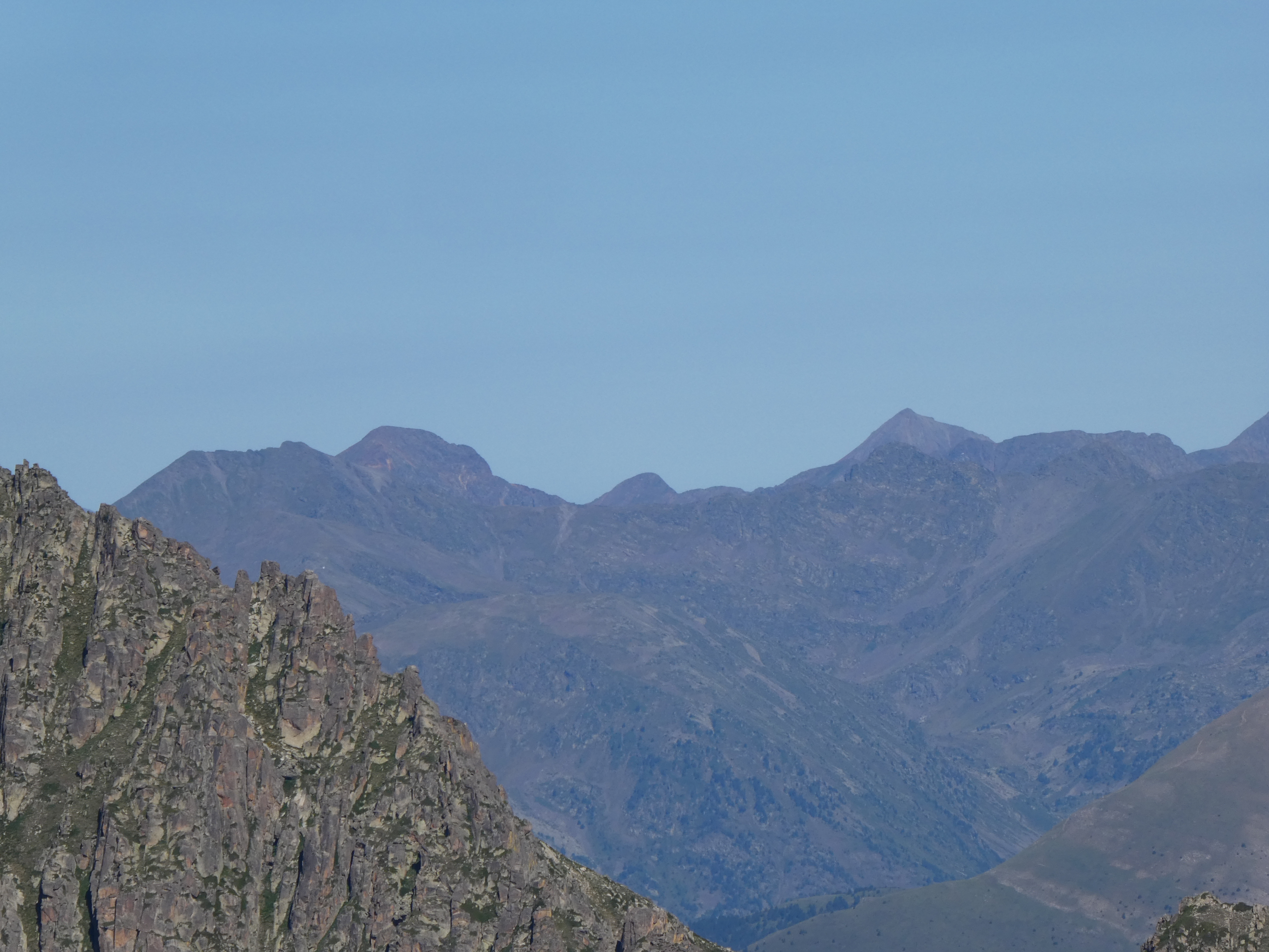 Zoom sur le Pic de Sanfonts (2894 m) à gauche, le Pic de Coma Pedrosa (2942 m) au centre et la Roca Entrevessada (2929 m) à droite