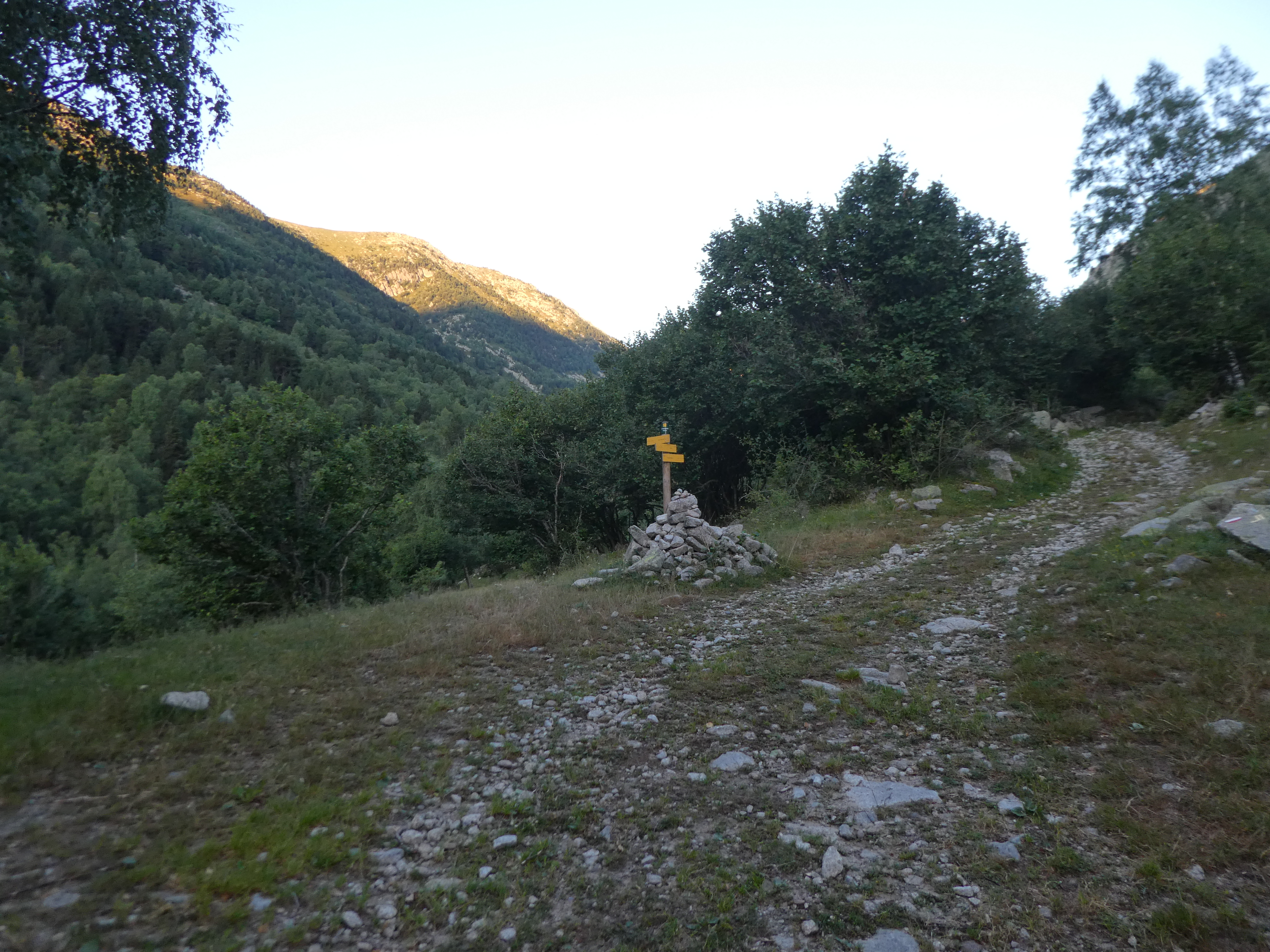 A ce croisement avec le GR107 marqué par la présence d'un panneau directionnel (1100 mètres après la Portella de Joan Antoni), suivre le GR7 partant tout droit direction Portella Blanca d'Andorra, balisé en rouge et blanc