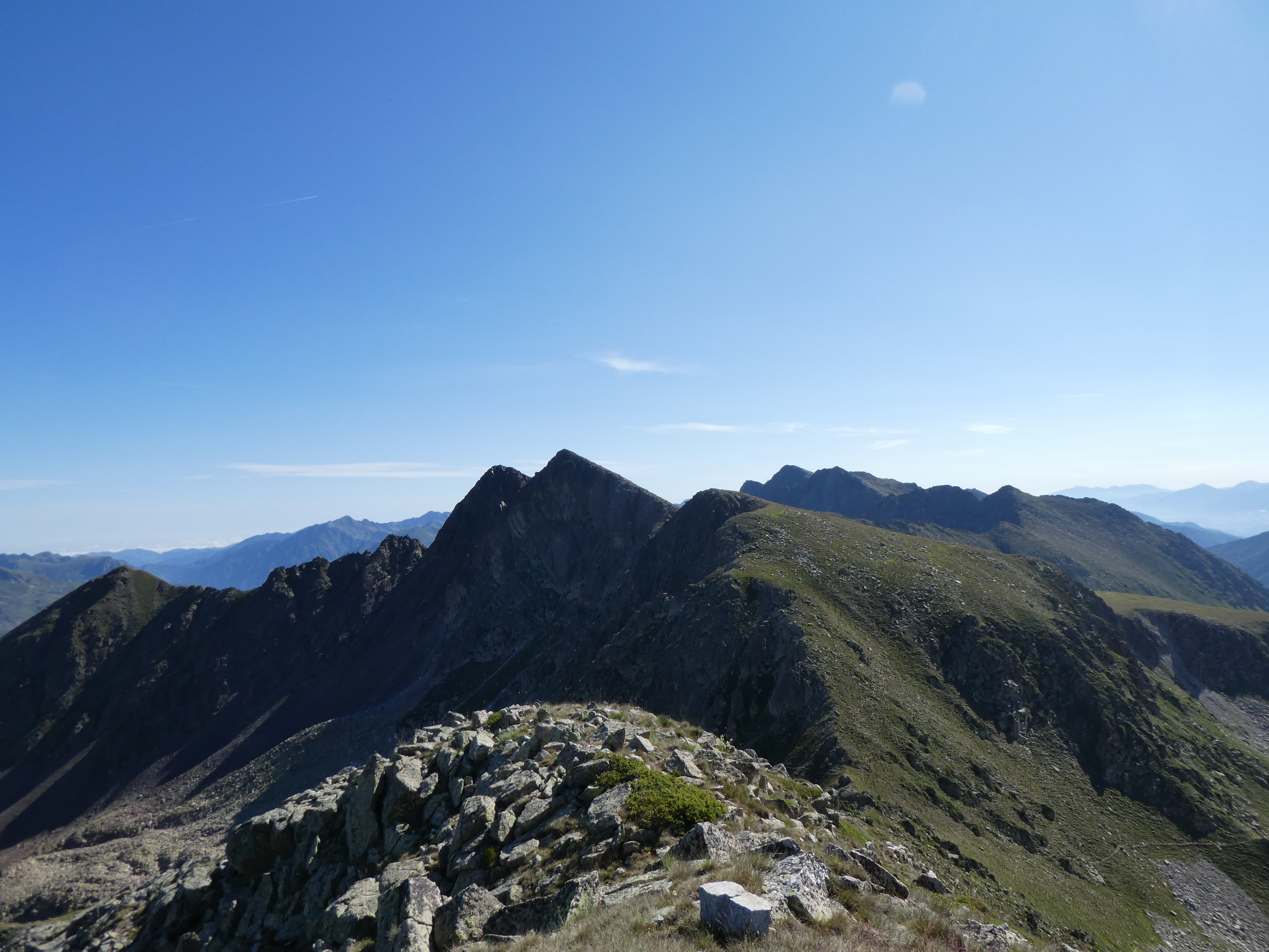 Arrivée au sommet du Pic de la Portella (2597 m) : frontière franco-espagnole : beau panorama sur les sommets de la Vall de la Llosa et de Campcardós