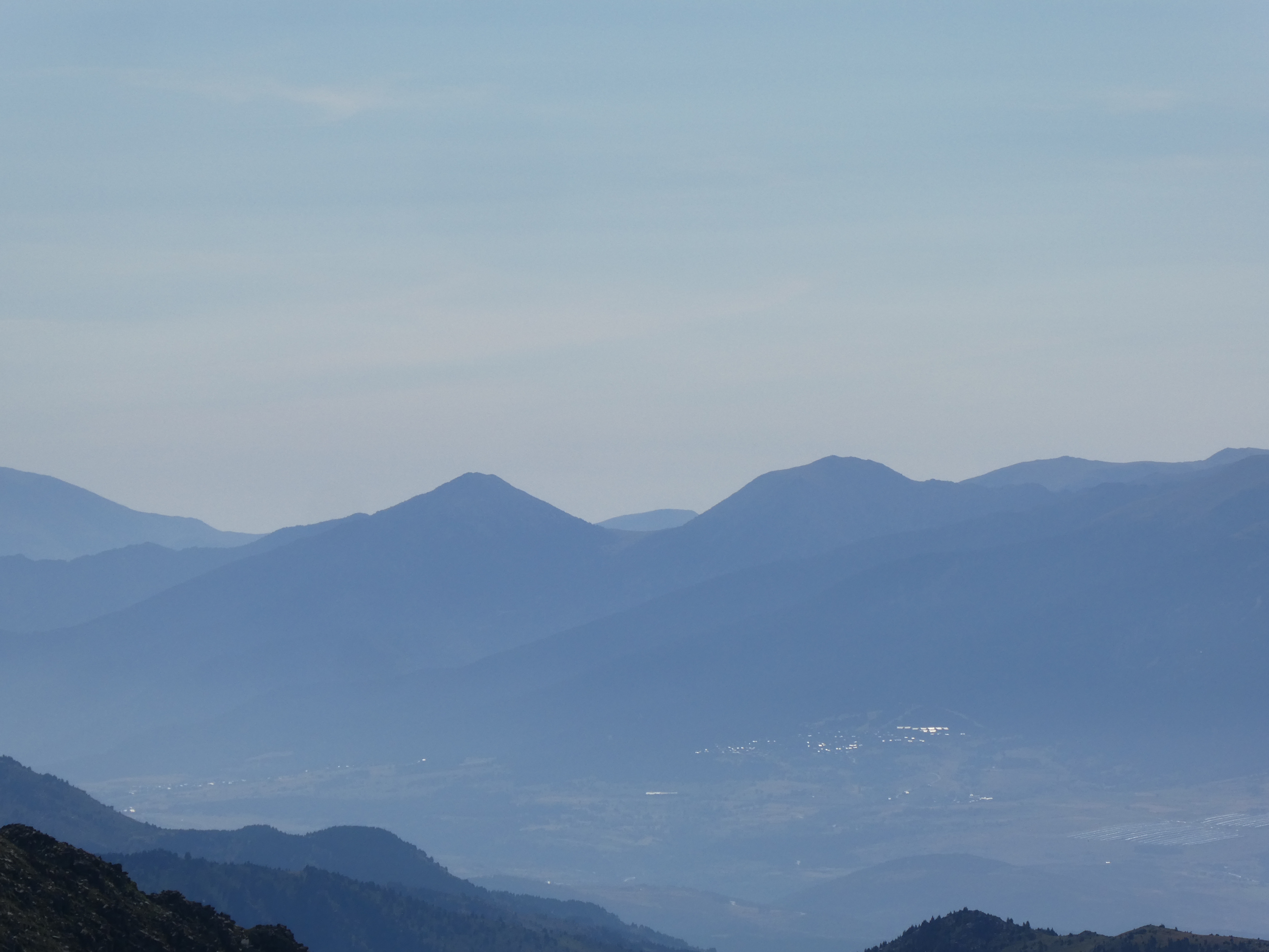 Zoom sur le Pic Gallinàs (2624 m) au centre-gauche et le Puig Redon (2677 m) au centre-droit ... en bas, à droite, on aperçoit la Centrale Solaire de Llo située à 29 kilomètres