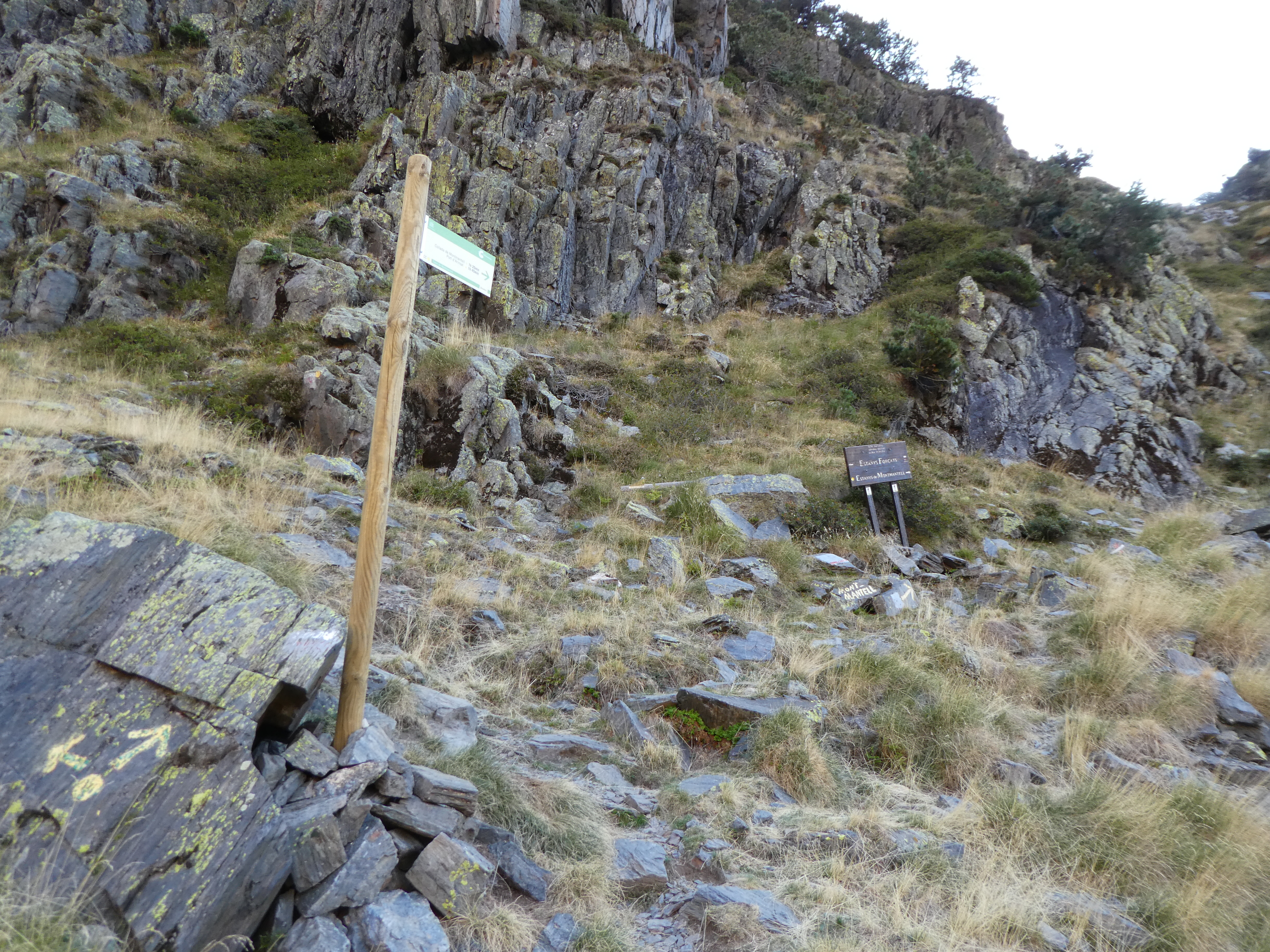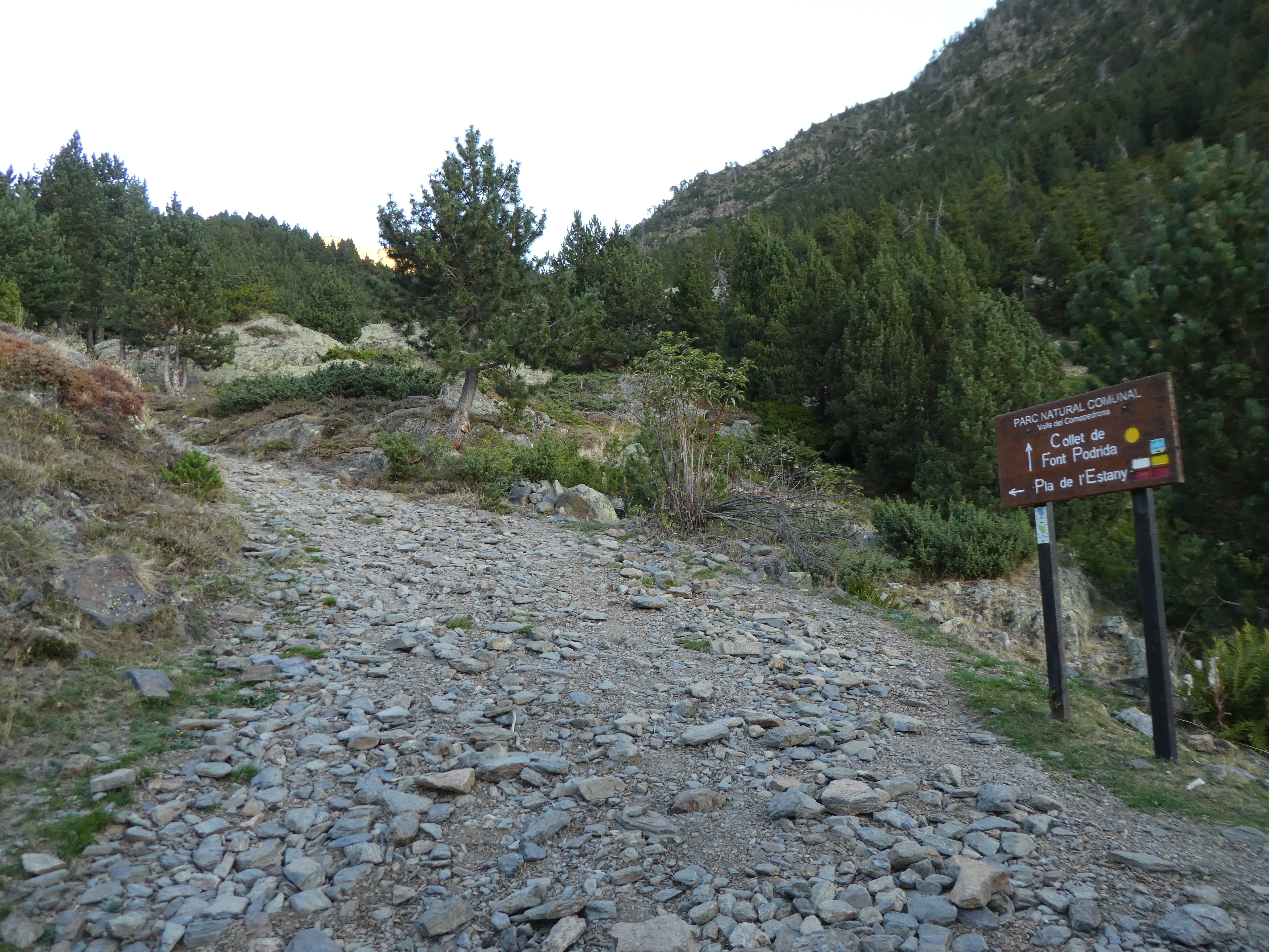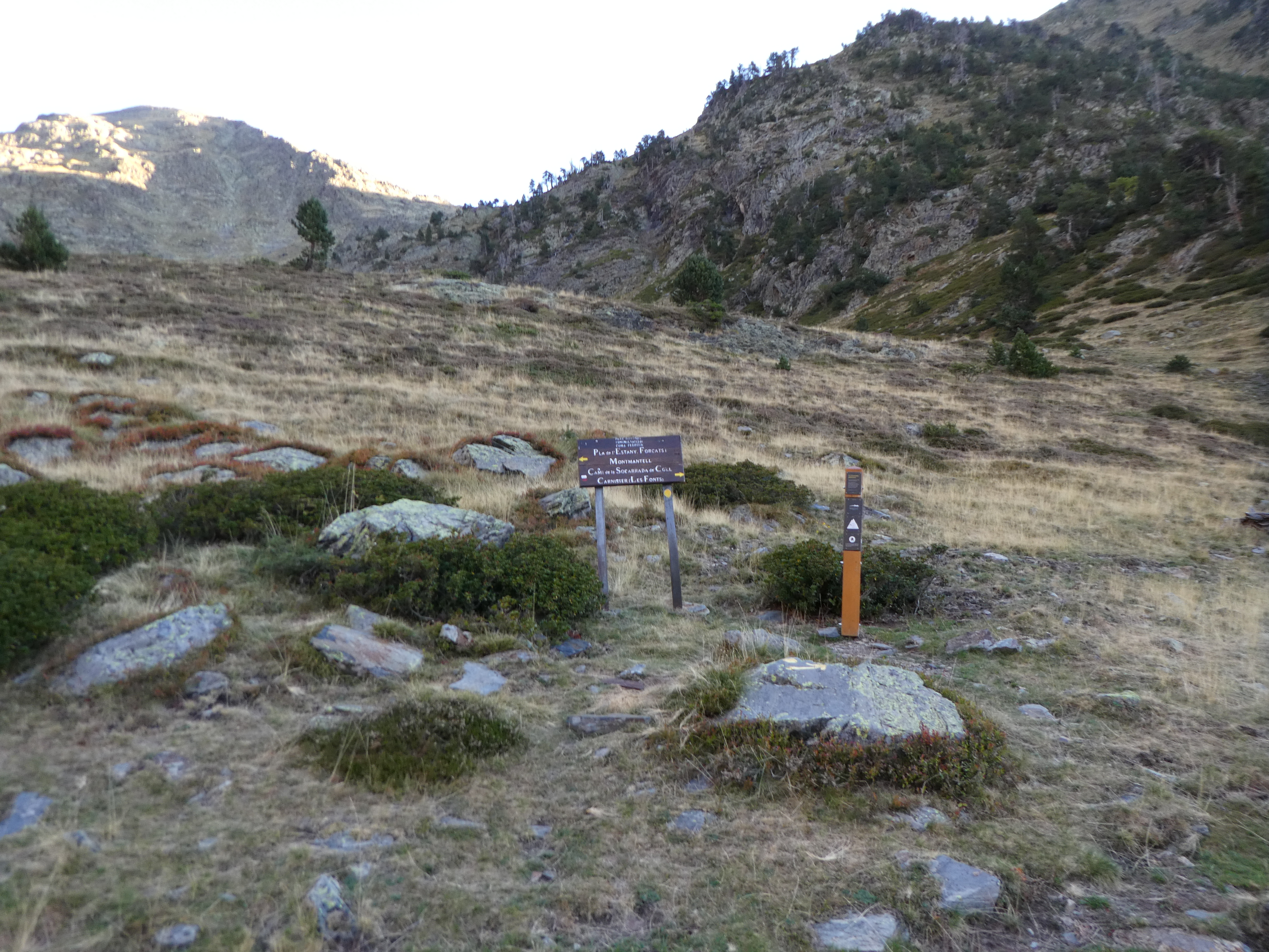 A ce croisement marqué par la présence d'un panneau directionnel (900 mètres après le Refugi del Pla de l'Estany), suivre le chemin montant sur la gauche et dominant le Circ del Pla de l'Estany direction Estanys Forcats, balisé en jaune (le chemin partant sur la droite mène aux Estanys de Montmantell)