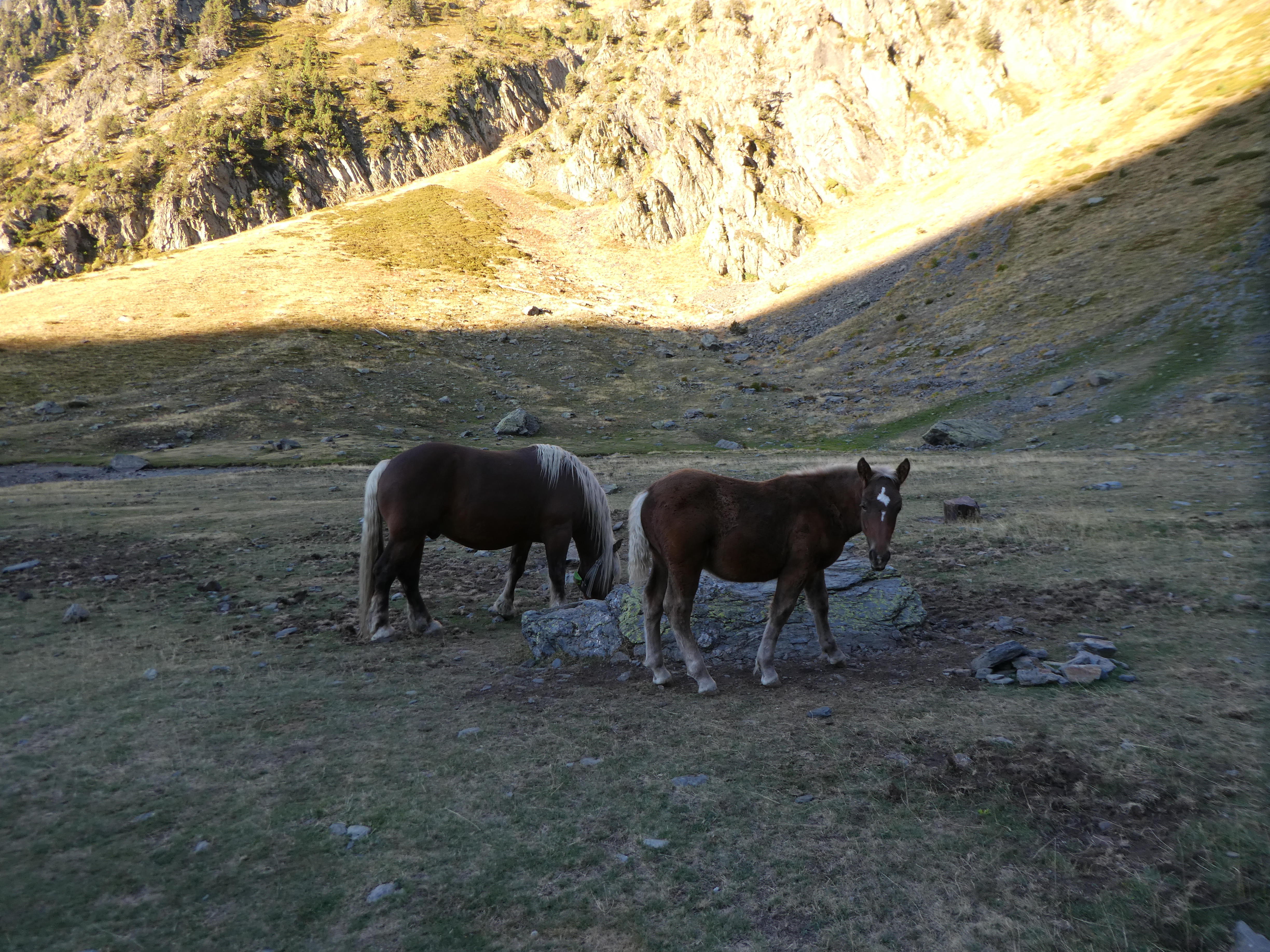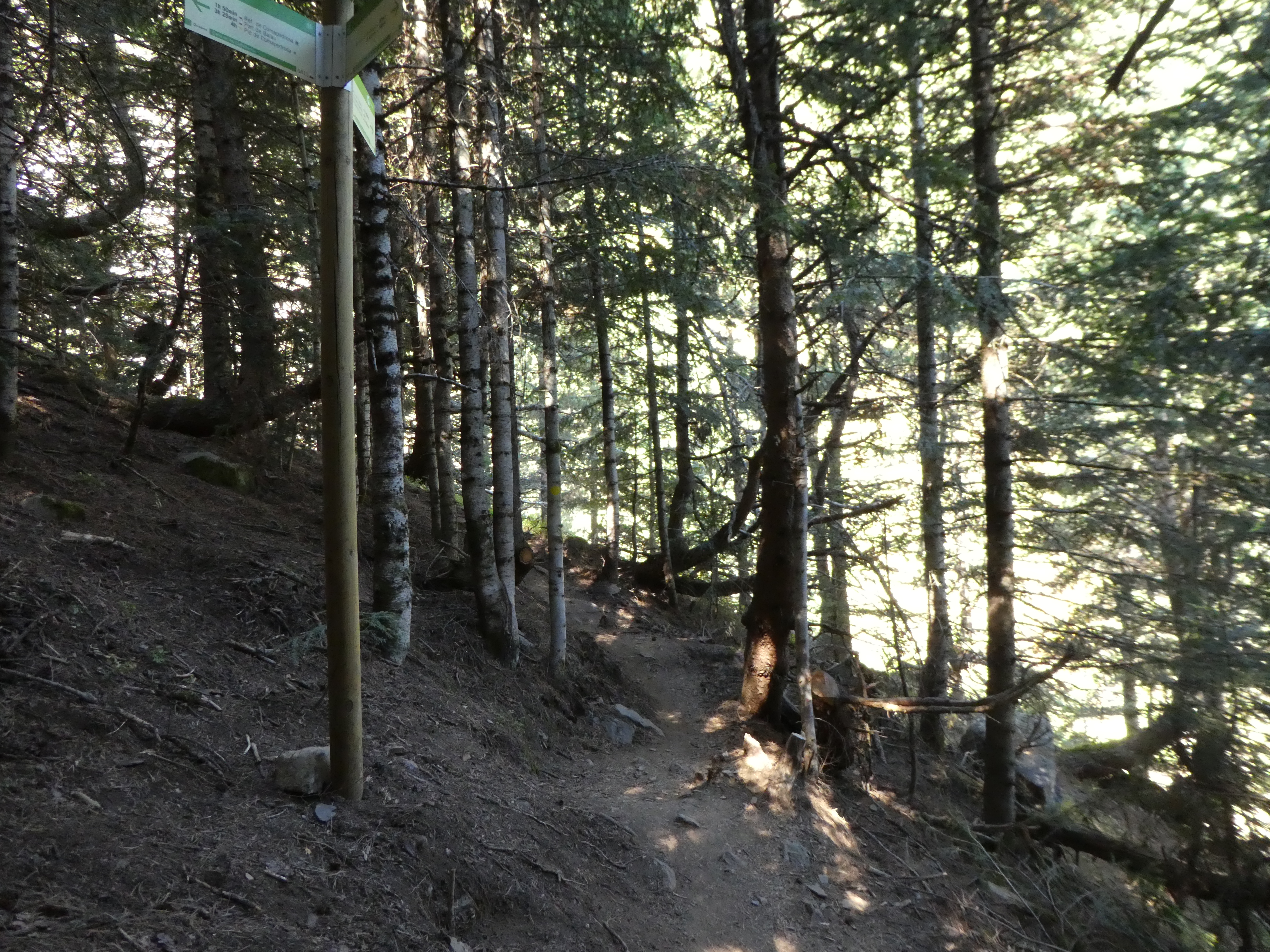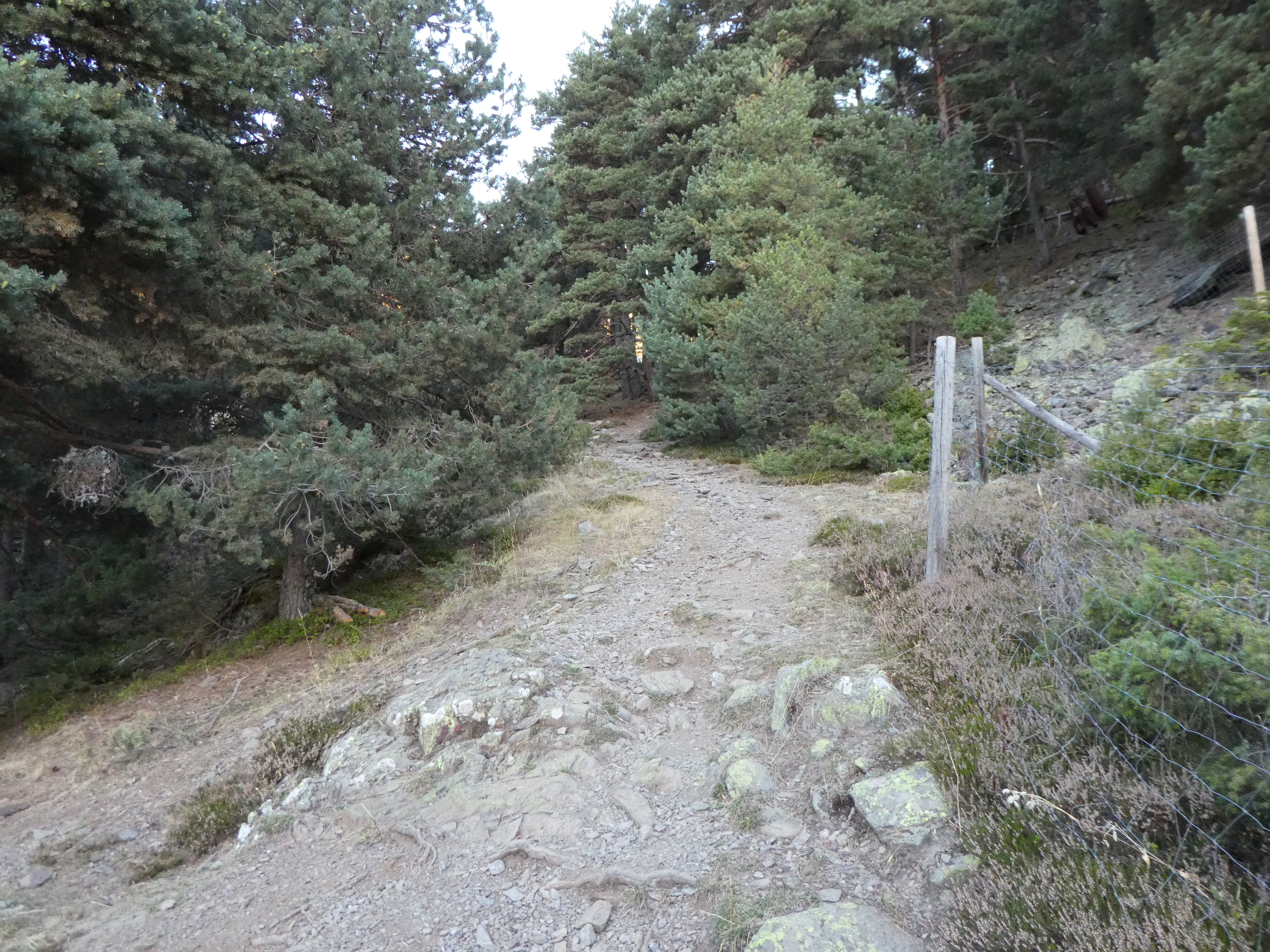 A ce croisement marqué par la présence d'un panneau directionnel (900 mètres après le Refugi del Pla de l'Estany), suivre le chemin montant sur la gauche et dominant le Circ del Pla de l'Estany direction Estanys Forcats, balisé en jaune (le chemin partant sur la droite mène aux Estanys de Montmantell)