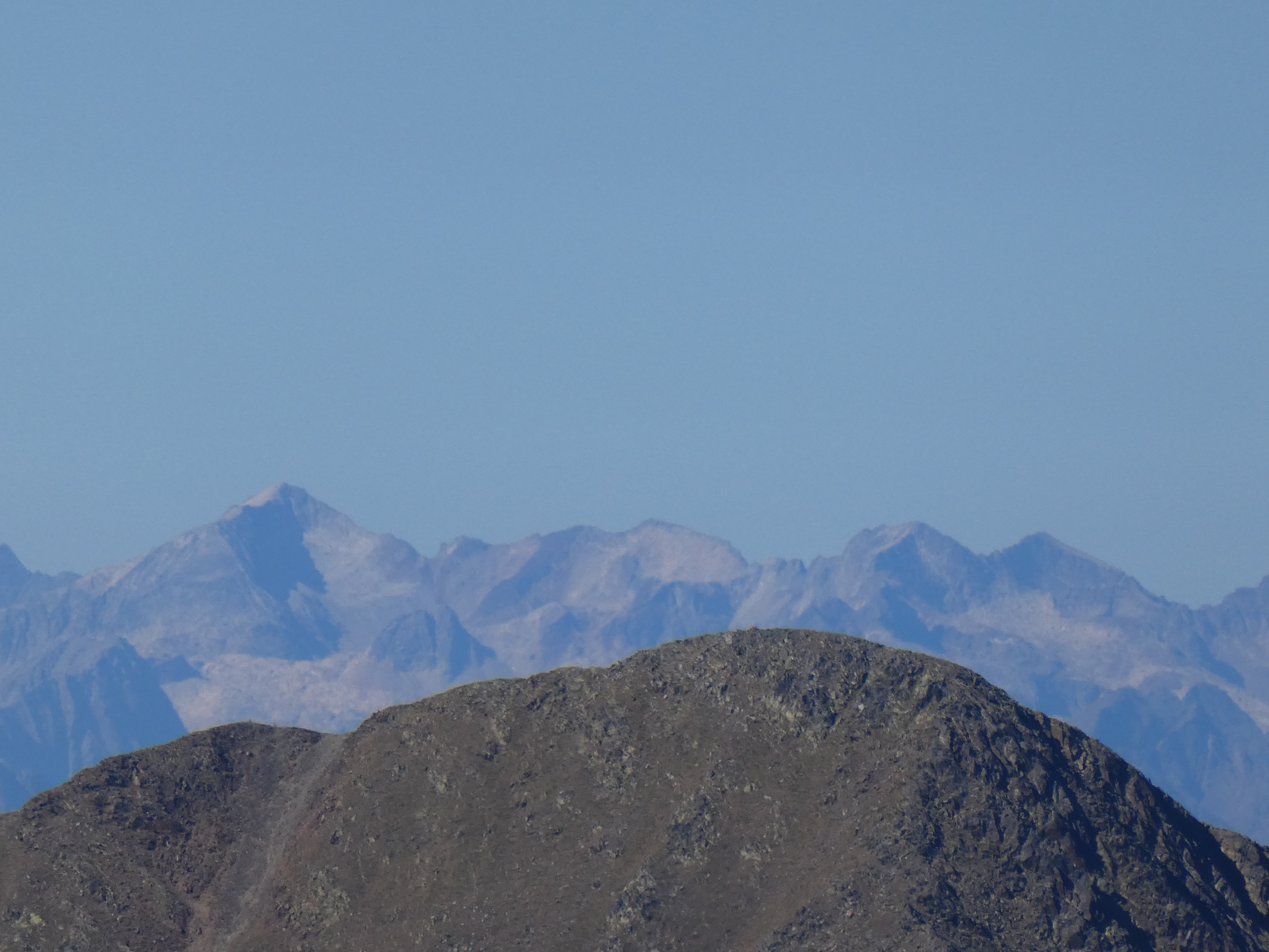 Zoom sur le massif de l'Aneto avec le Pico de Russel (3205 m) à gauche, le Pico de Aneto (3404 m) au centre-gauche, le Pico del Medio (3349 m) au centre, le Pico de la Maladeta (3308 m) au centre-droit et la Tuca Blanca de Paderna (2847 m) à droite