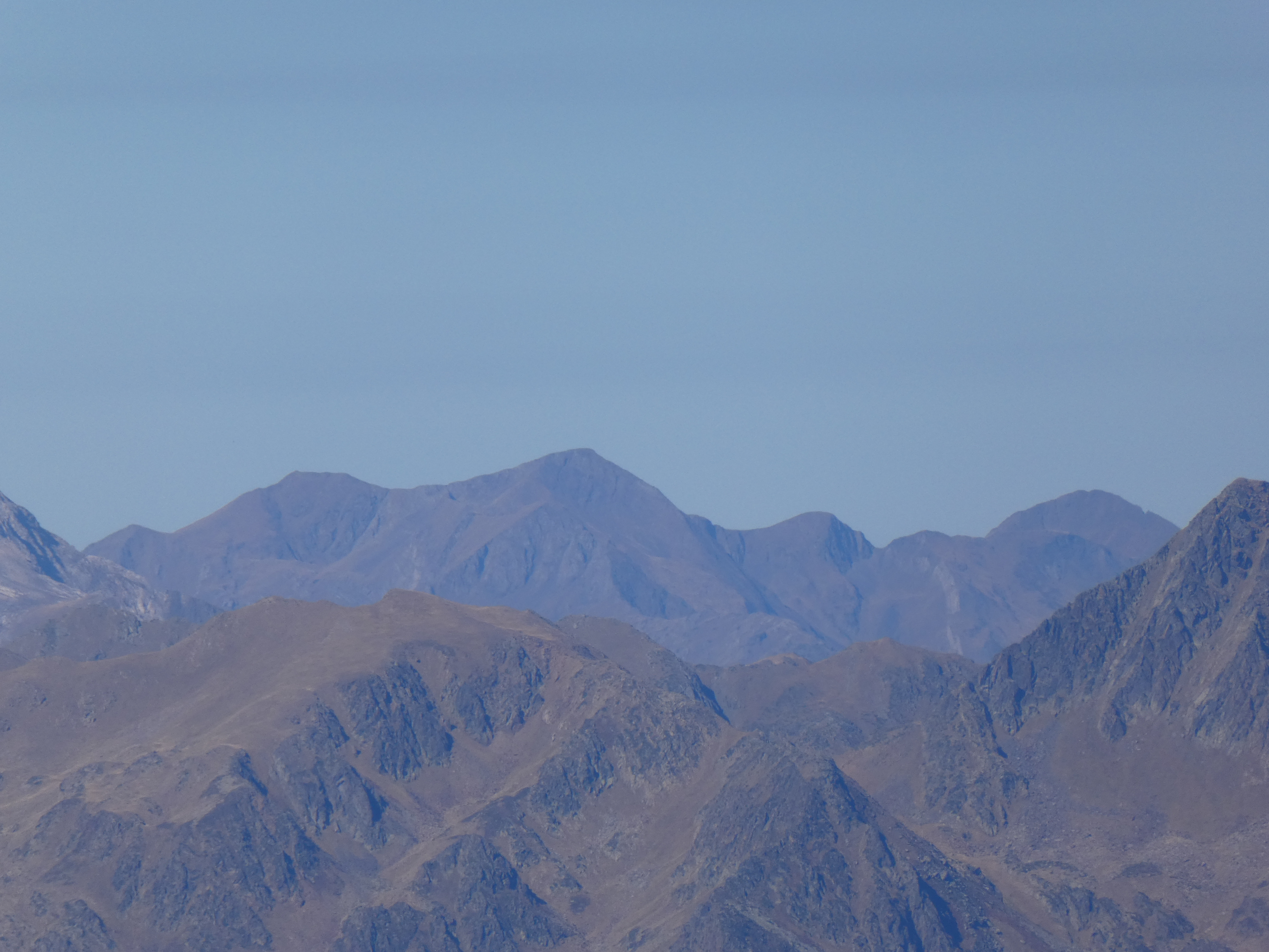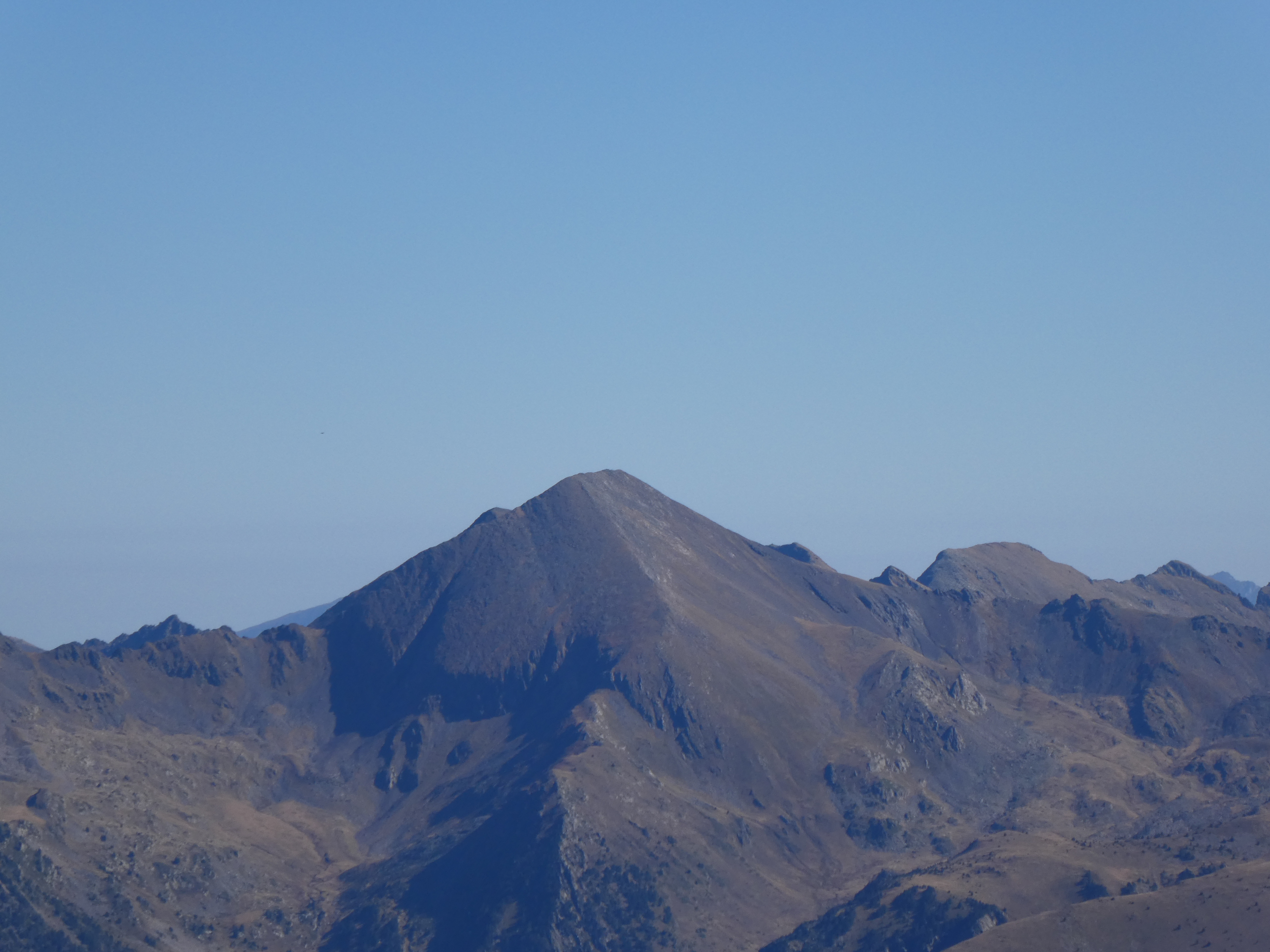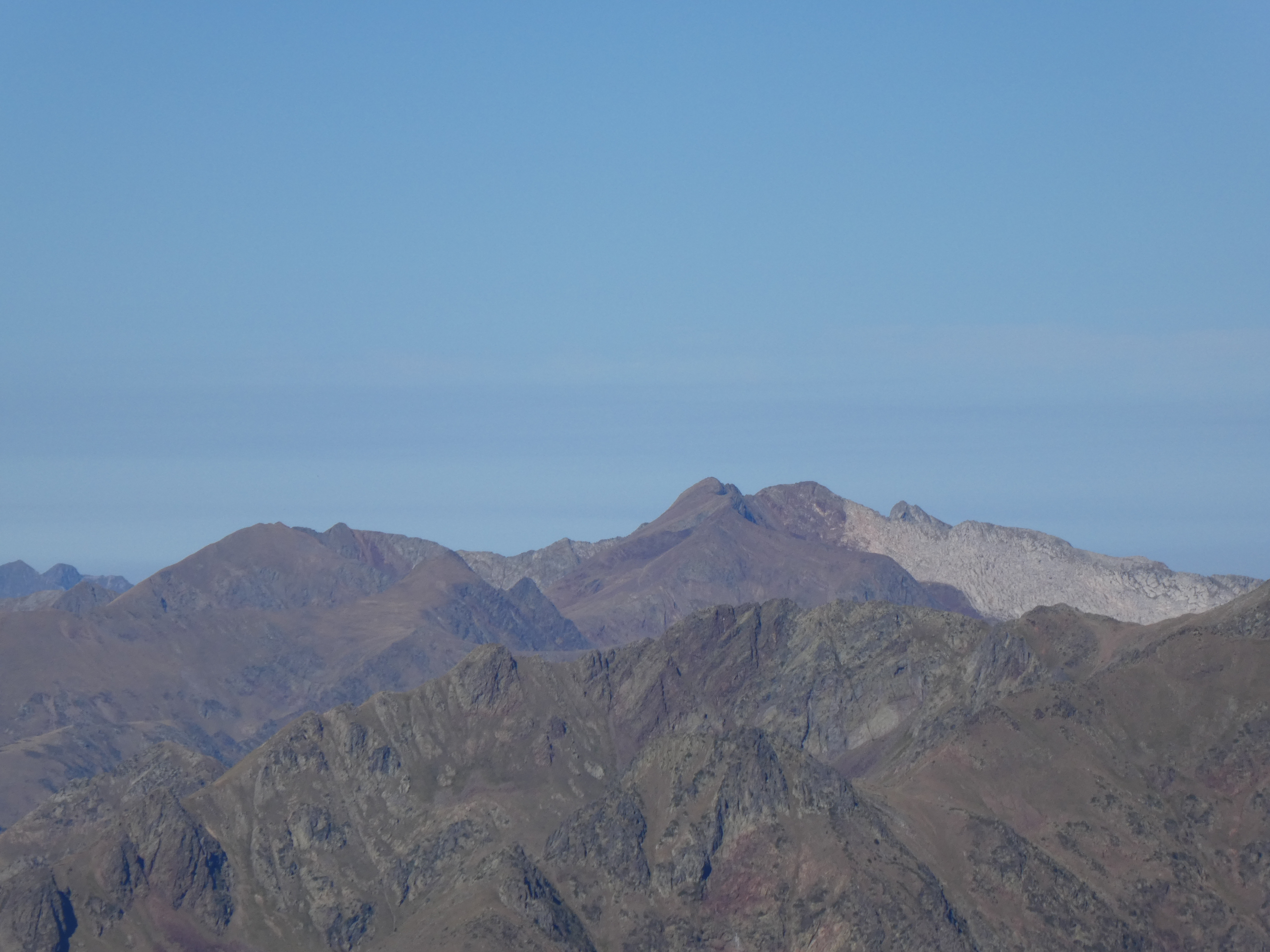 Zoom sur le Pic de Thoumasset (2741 m) à gauche et le Roc de Quercourt (1820 m) au fond à droite situé dans l'Aude