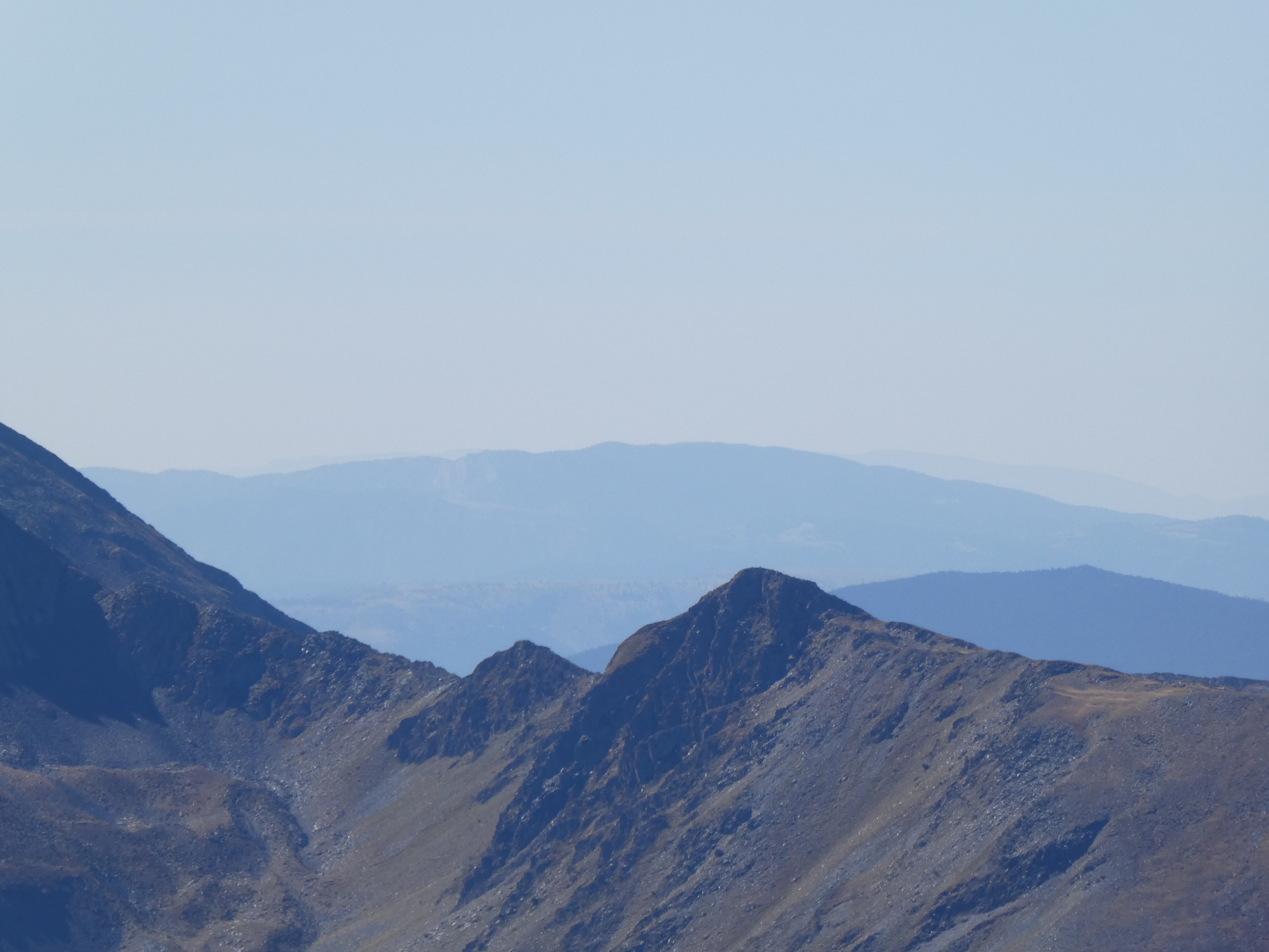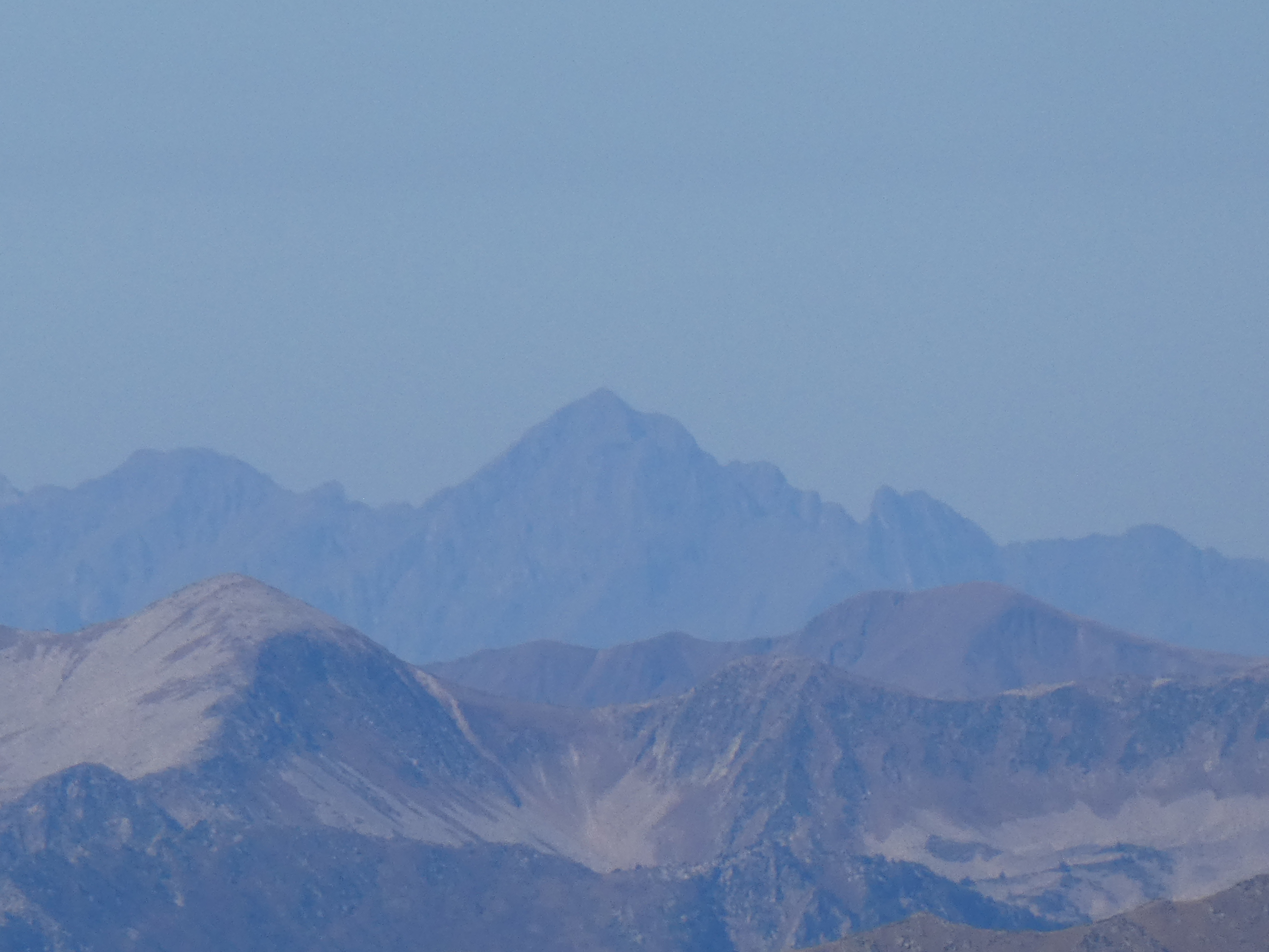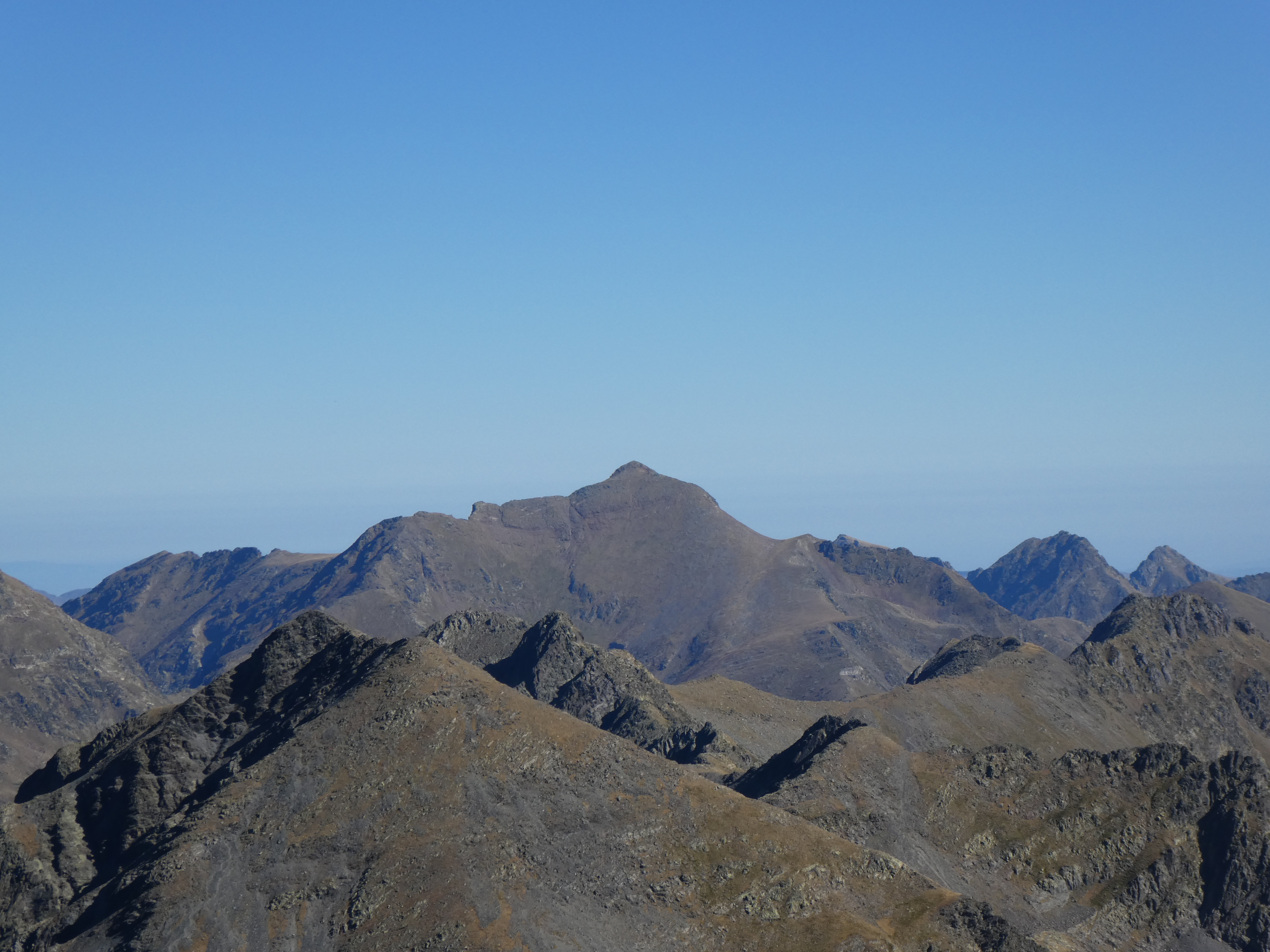 Zoom sur le Pic de Thoumasset (2741 m) à gauche et le Roc de Quercourt (1820 m) au fond à droite situé dans l'Aude