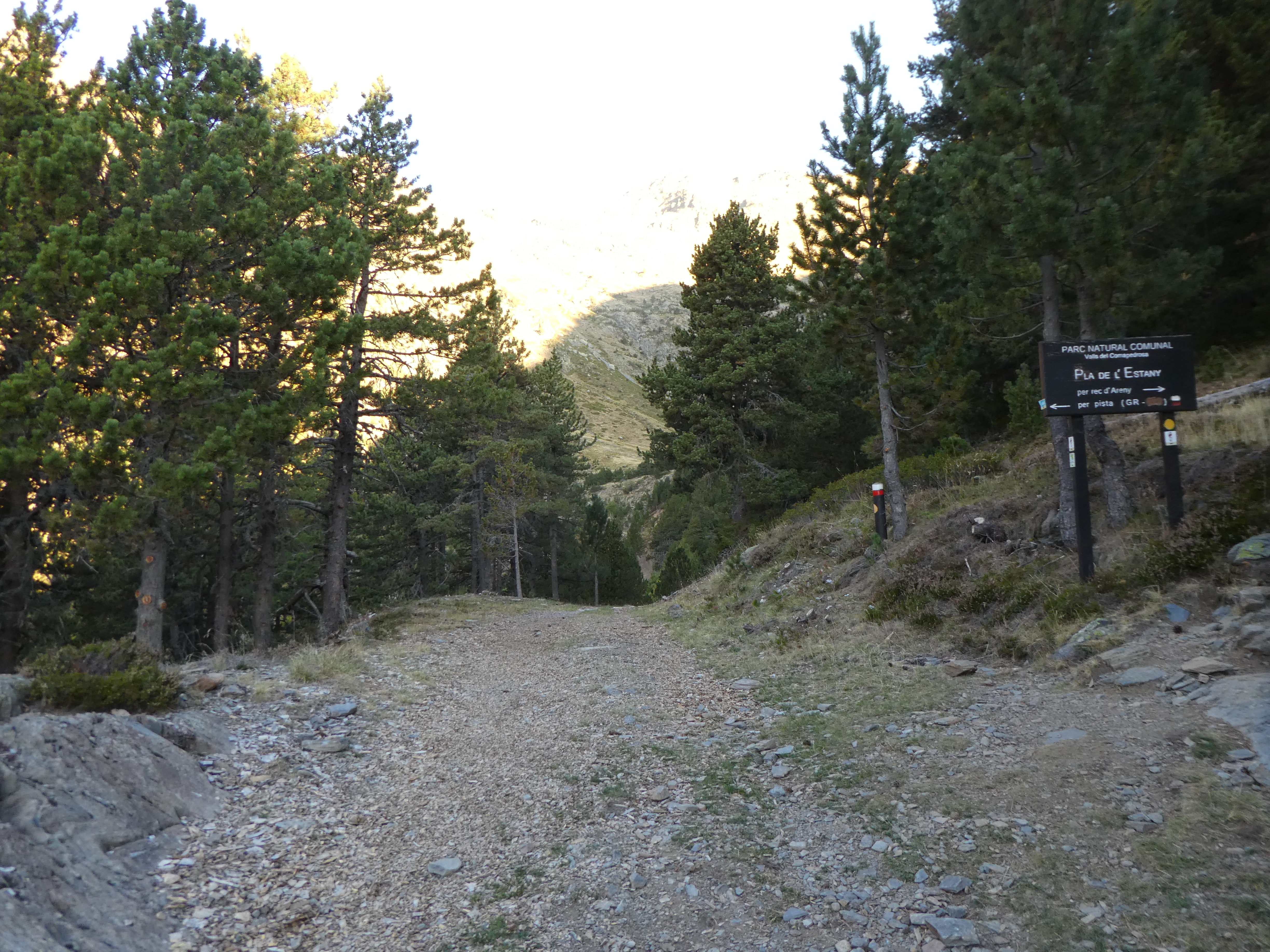 A ce croisement marqué par la présence d'un panneau directionnel (100 mètres après le précédent), suivre la piste montant raidement sur la gauche direction Refugi del Pla de l'Estany, balisé en rouge et blanc, et en jaune