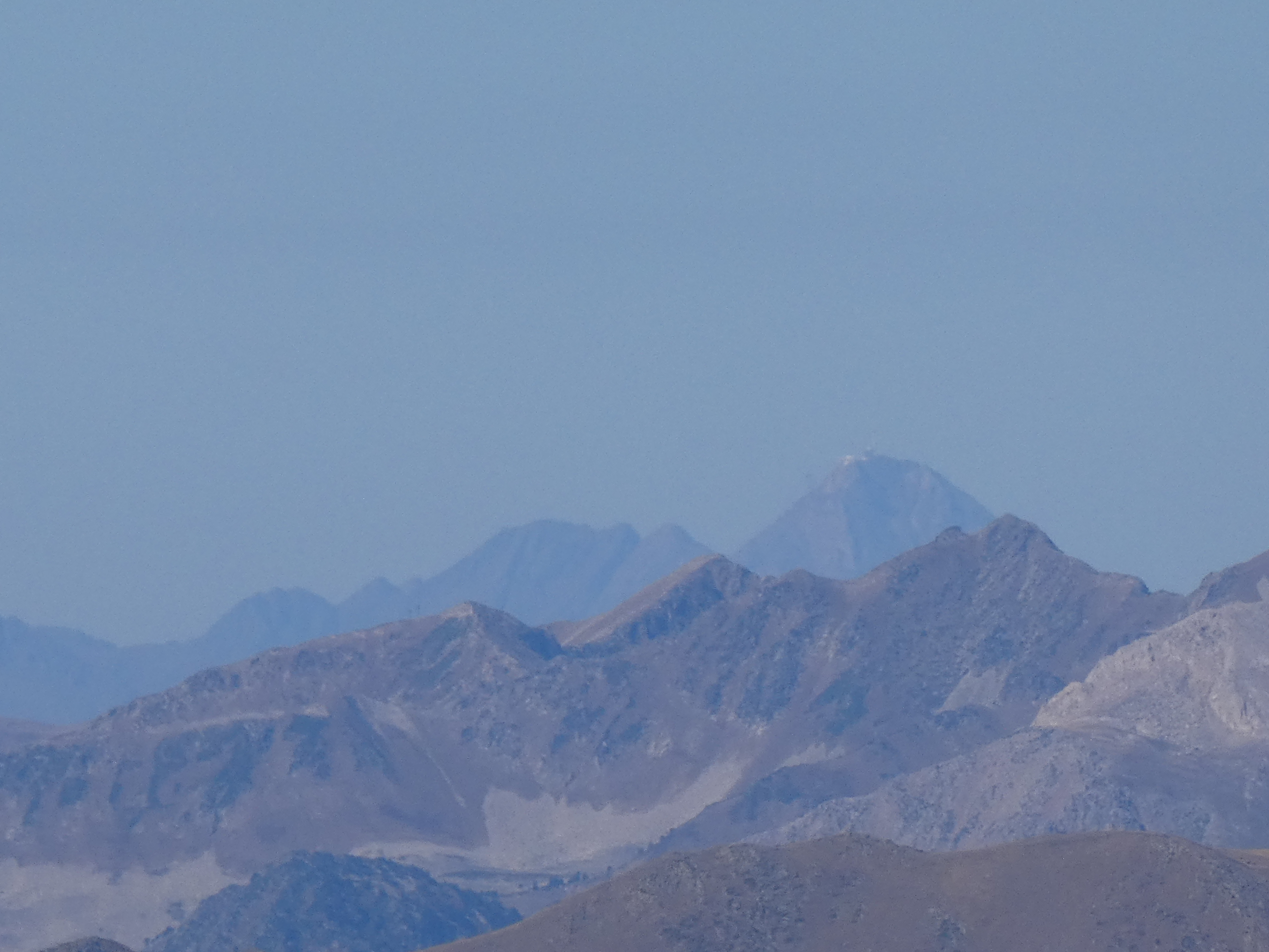 Zoom sur le Pic de Sotllo (3077 m) à gauche, la Pica d'Estats (3143 m) au centre et le Pic de Montcalm (3077 m) à droite