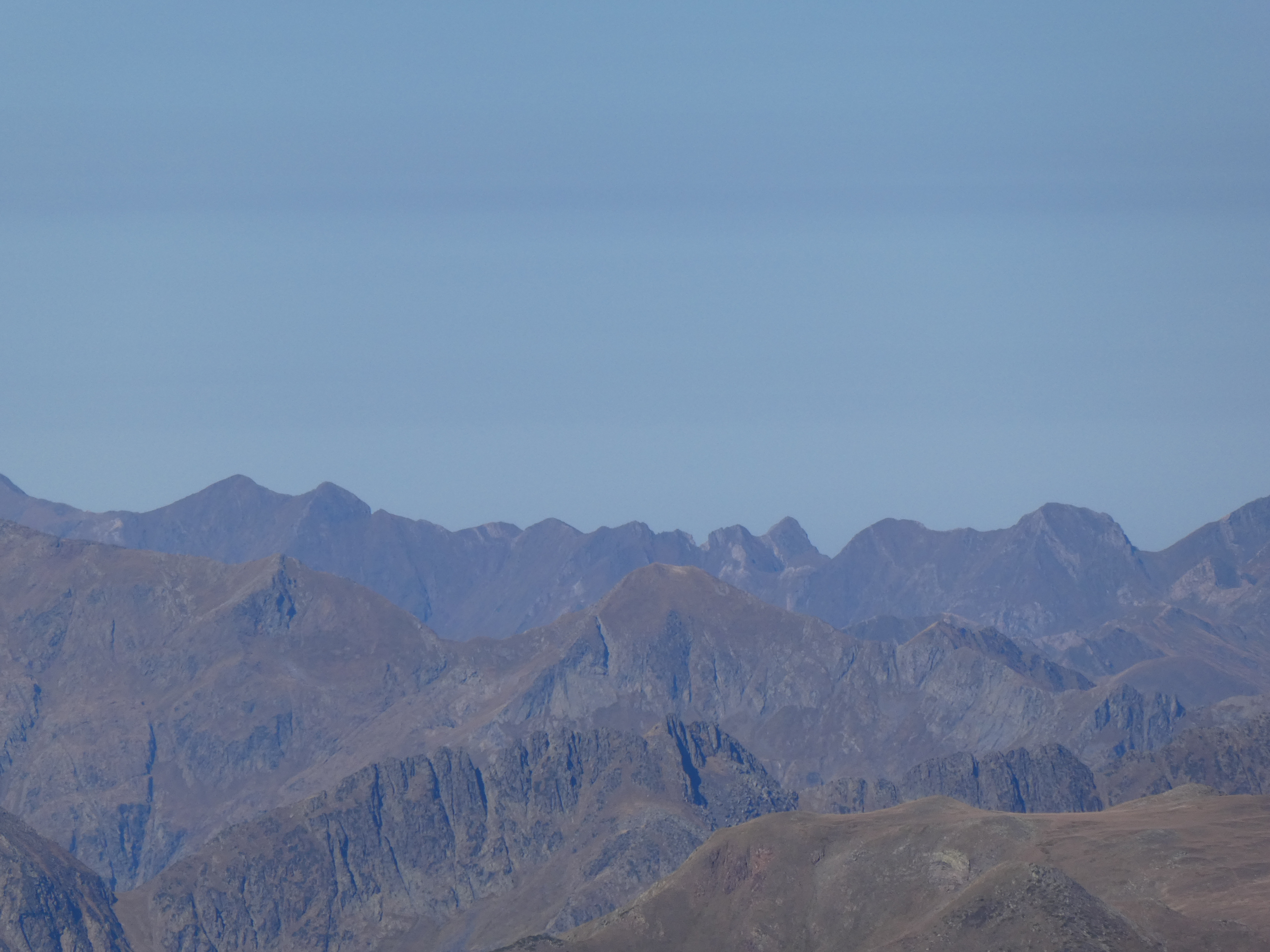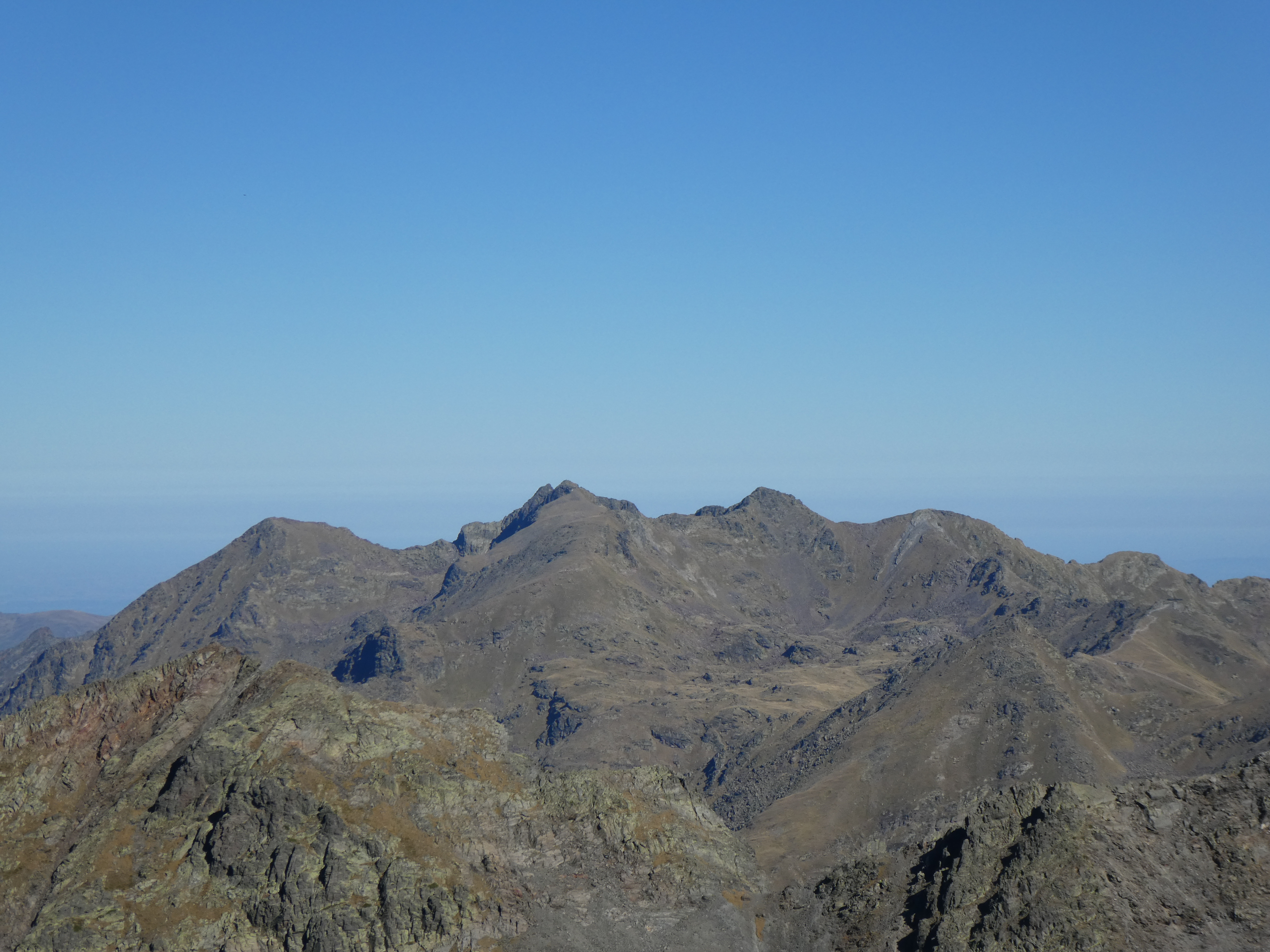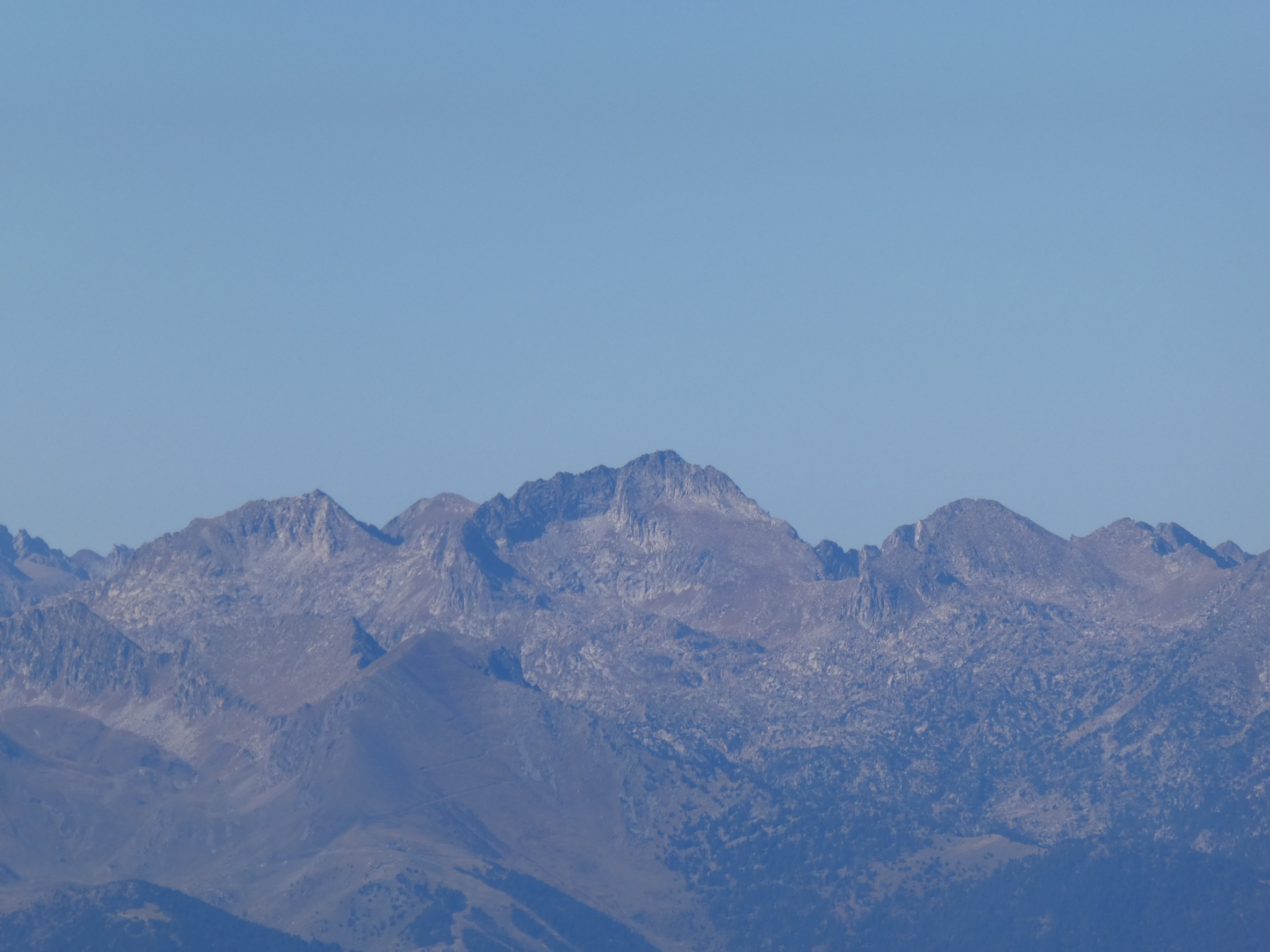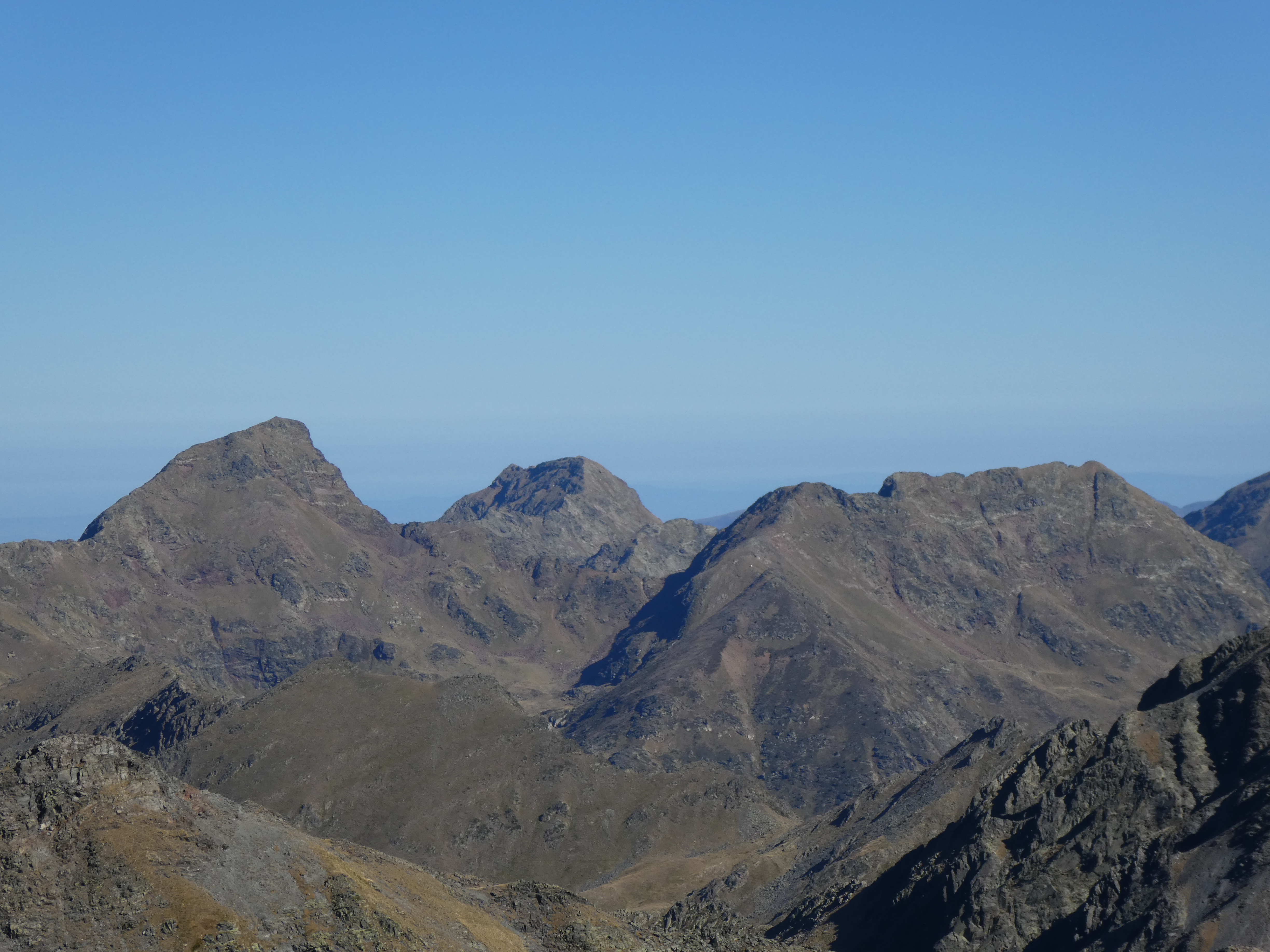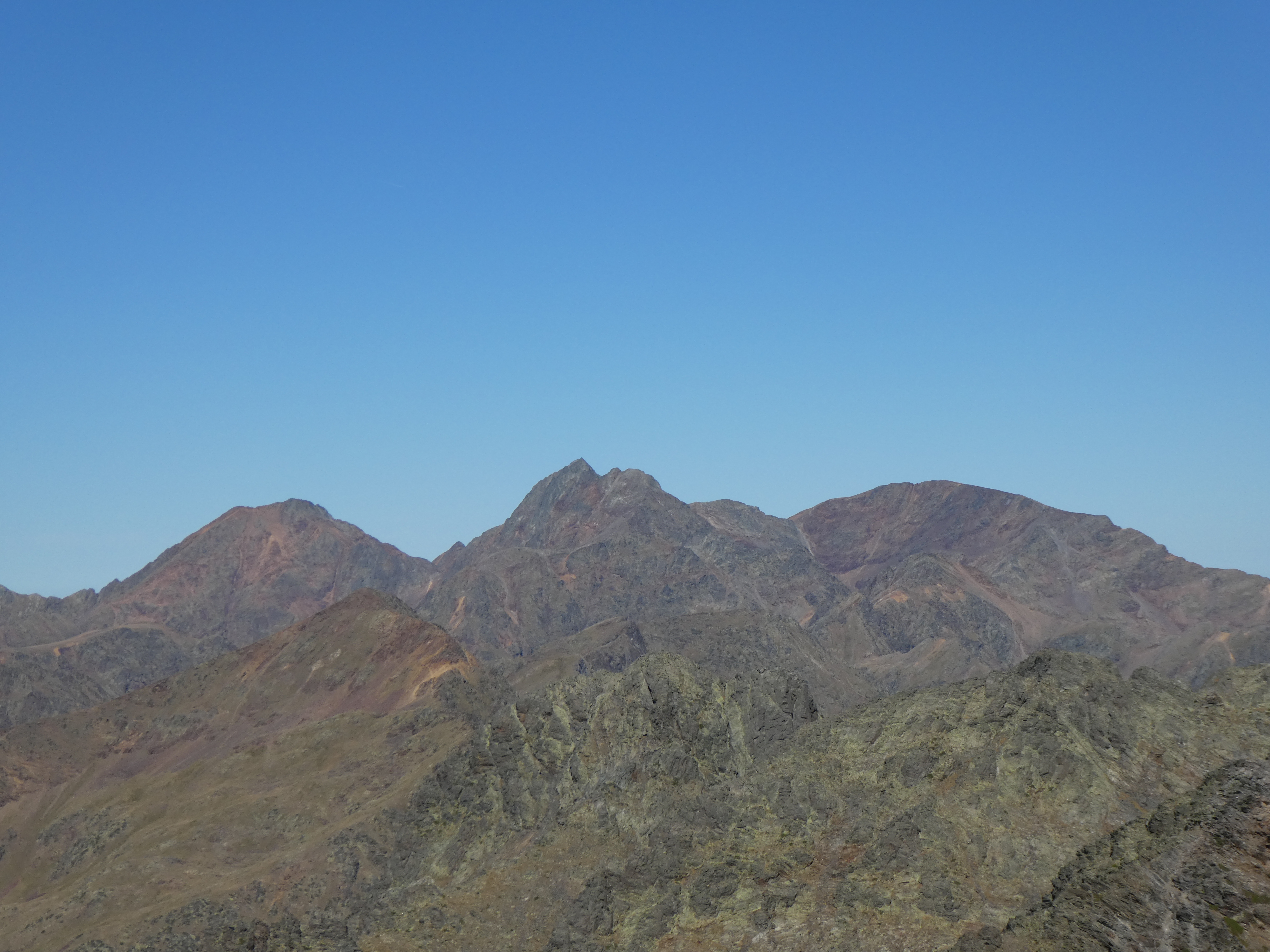 Zoom sur le Pic d'Esquine Ase (2706 m) à gauche, le Puig de la Portella Gran (2765 m), le Puig de la Cometa d'Espagne (2763 m) et le Puig Peric (2810 m) au centre, et le Puig de la Grava (2671 m) à droite