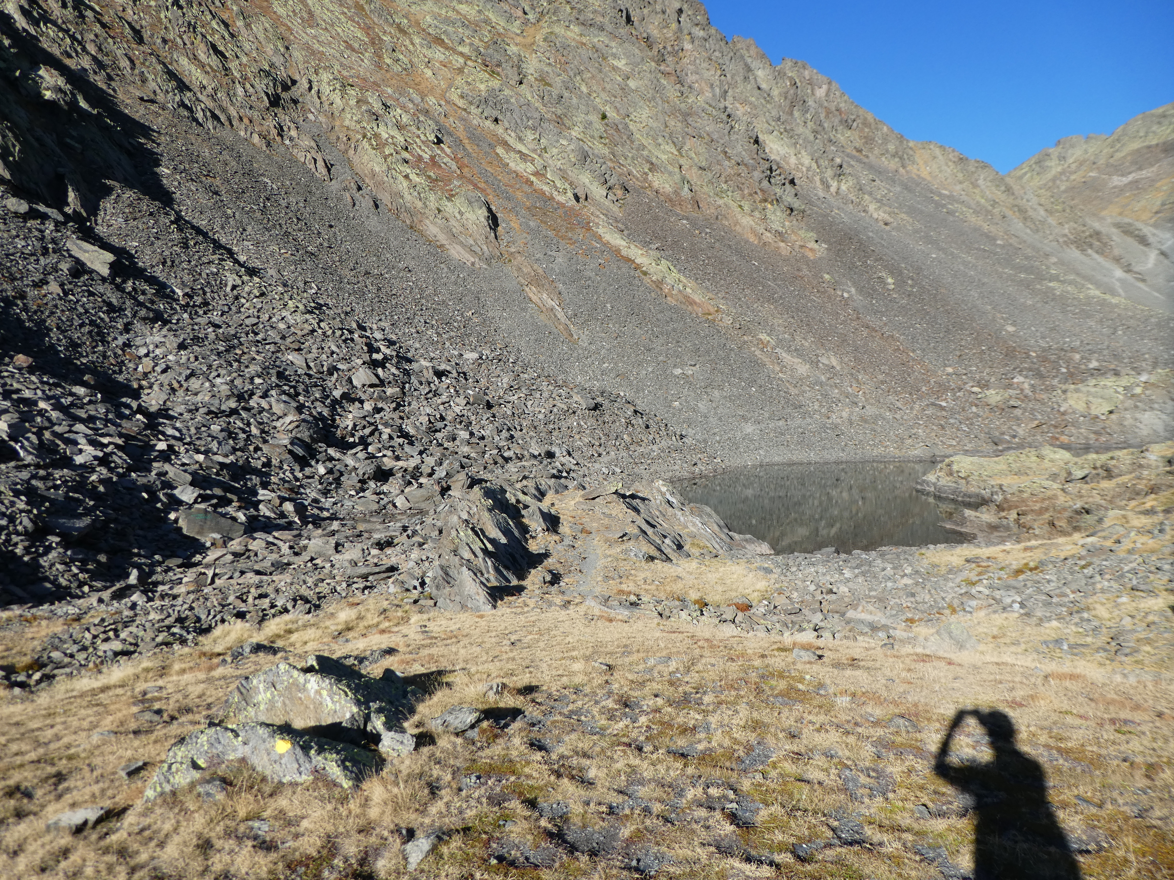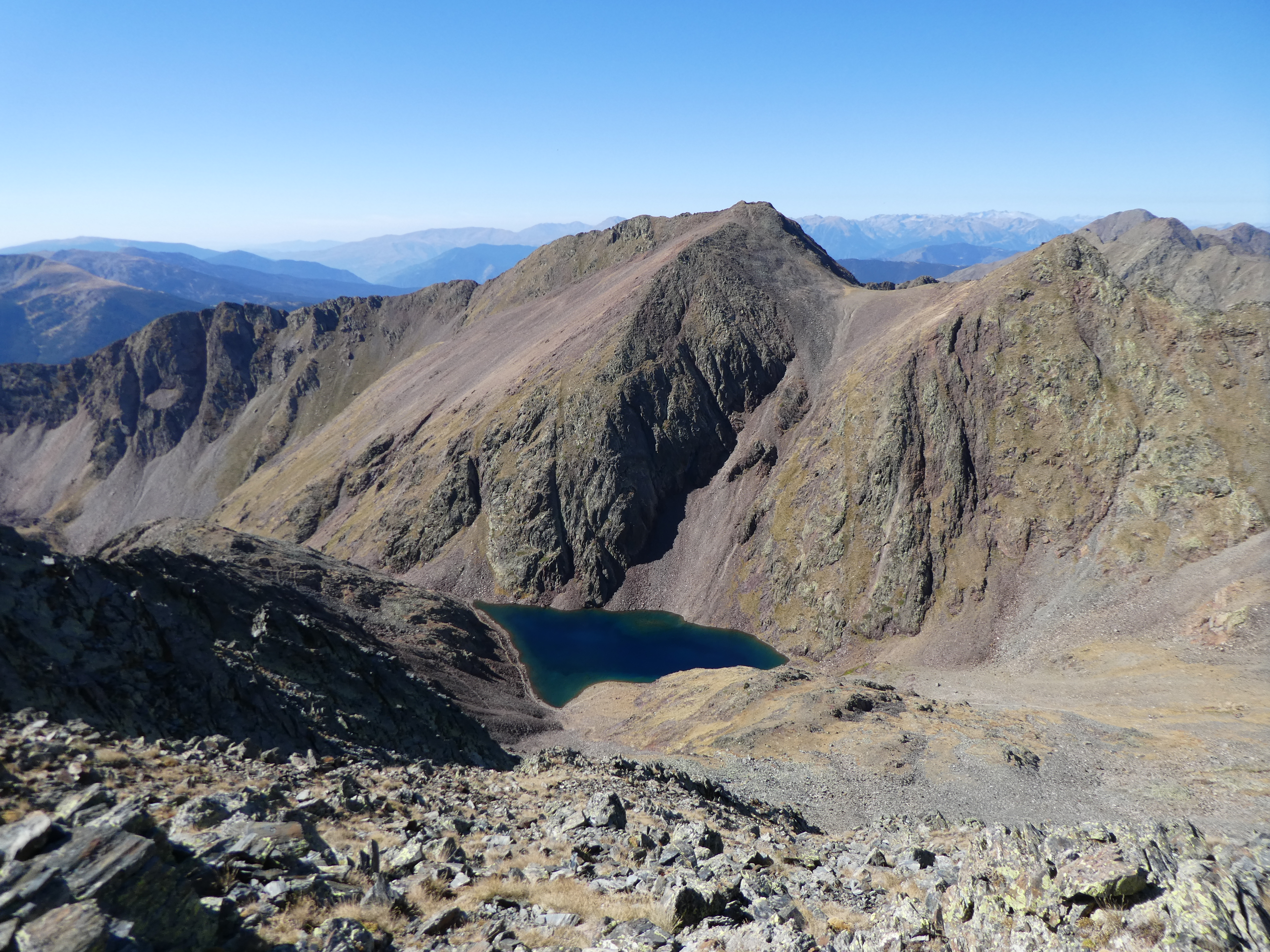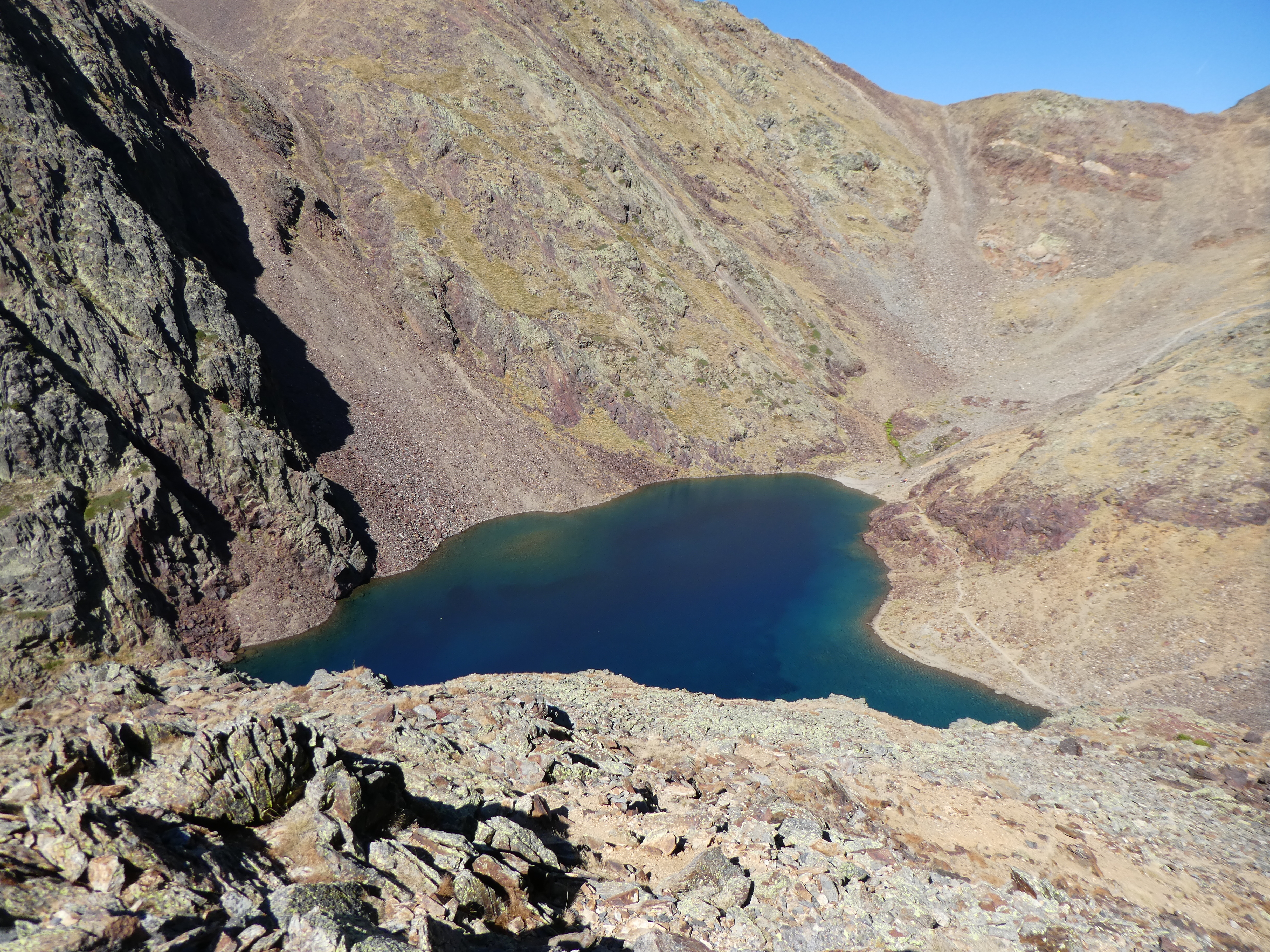 A ce croisement cairné avec l'itinéraire de descente vers la Portella dels Estanys Forcats (25 mètres après avoir quitté le Pic de Medecorba), suivre ce dernier descendant raidement sur la droite direction Portella dels Estanys Forcats, balisé en jaune dorénavant