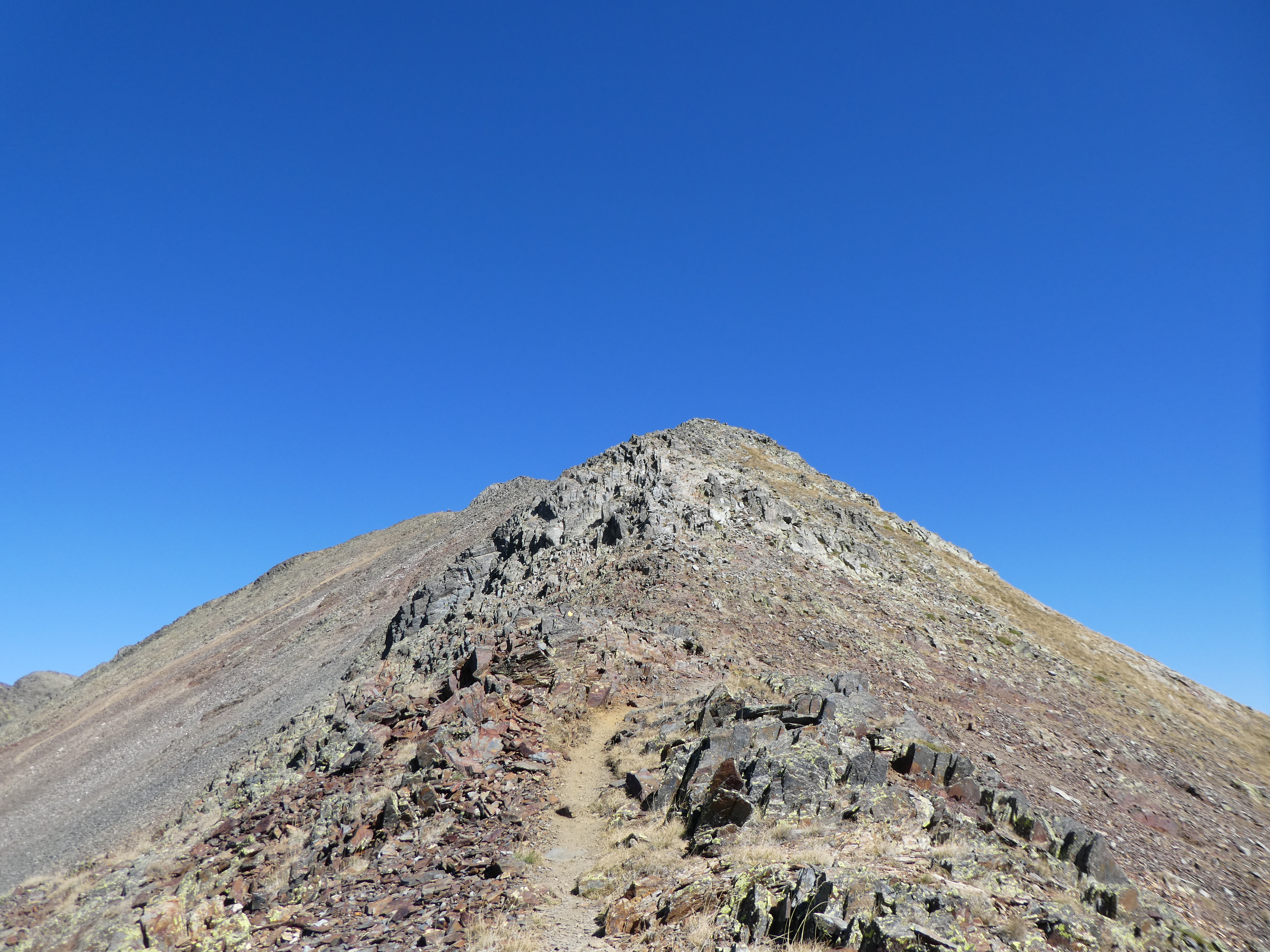 A ce croisement cairné avec l'itinéraire de crête du Pic de Medecorba (300 mètres après la Collada dels Estanys Forcats), suivre ce dernier tout droit direction Pic de Medecorba, aucun balisage dorénavant (court parcours aérien pour atteindre le sommet)