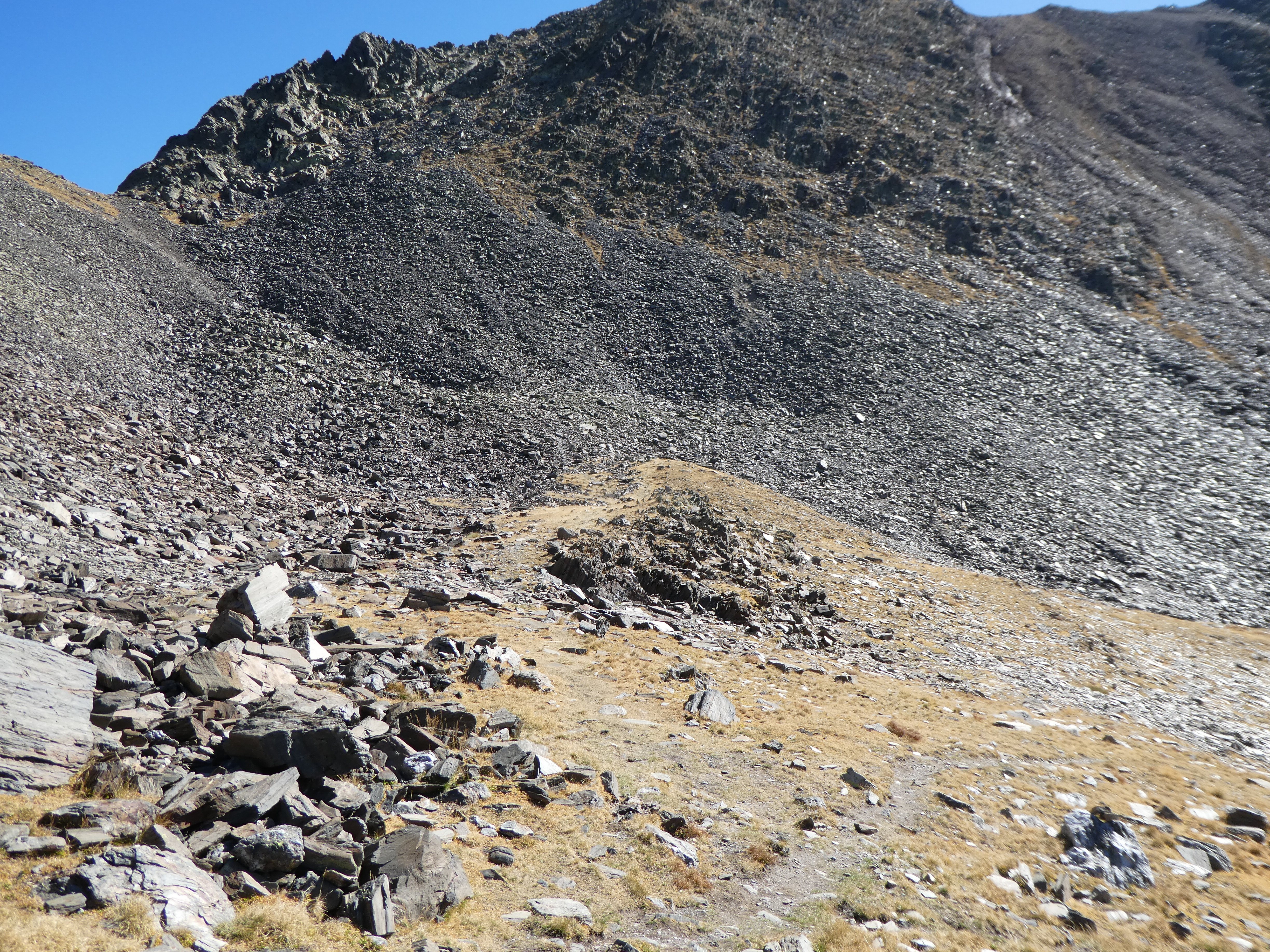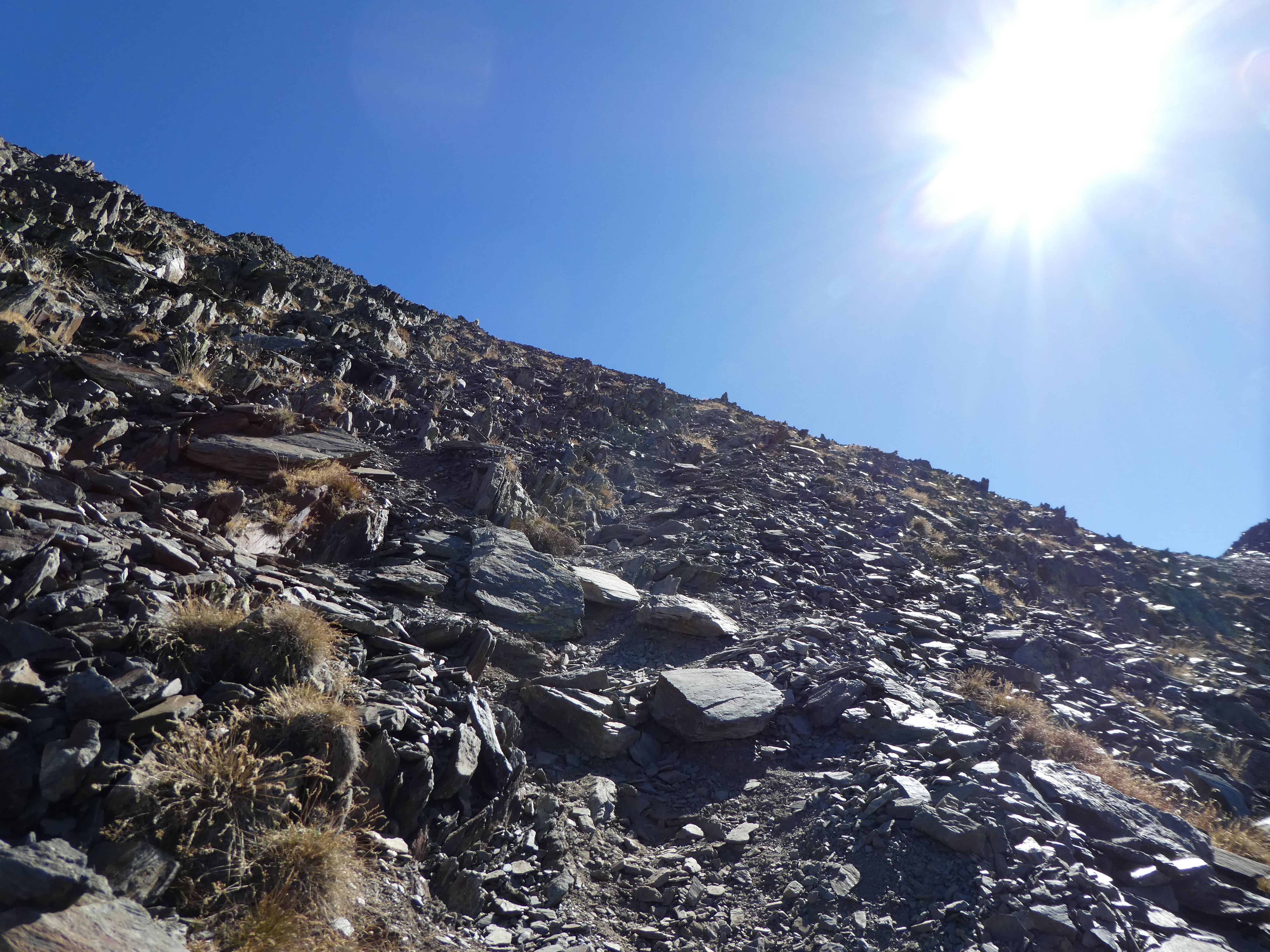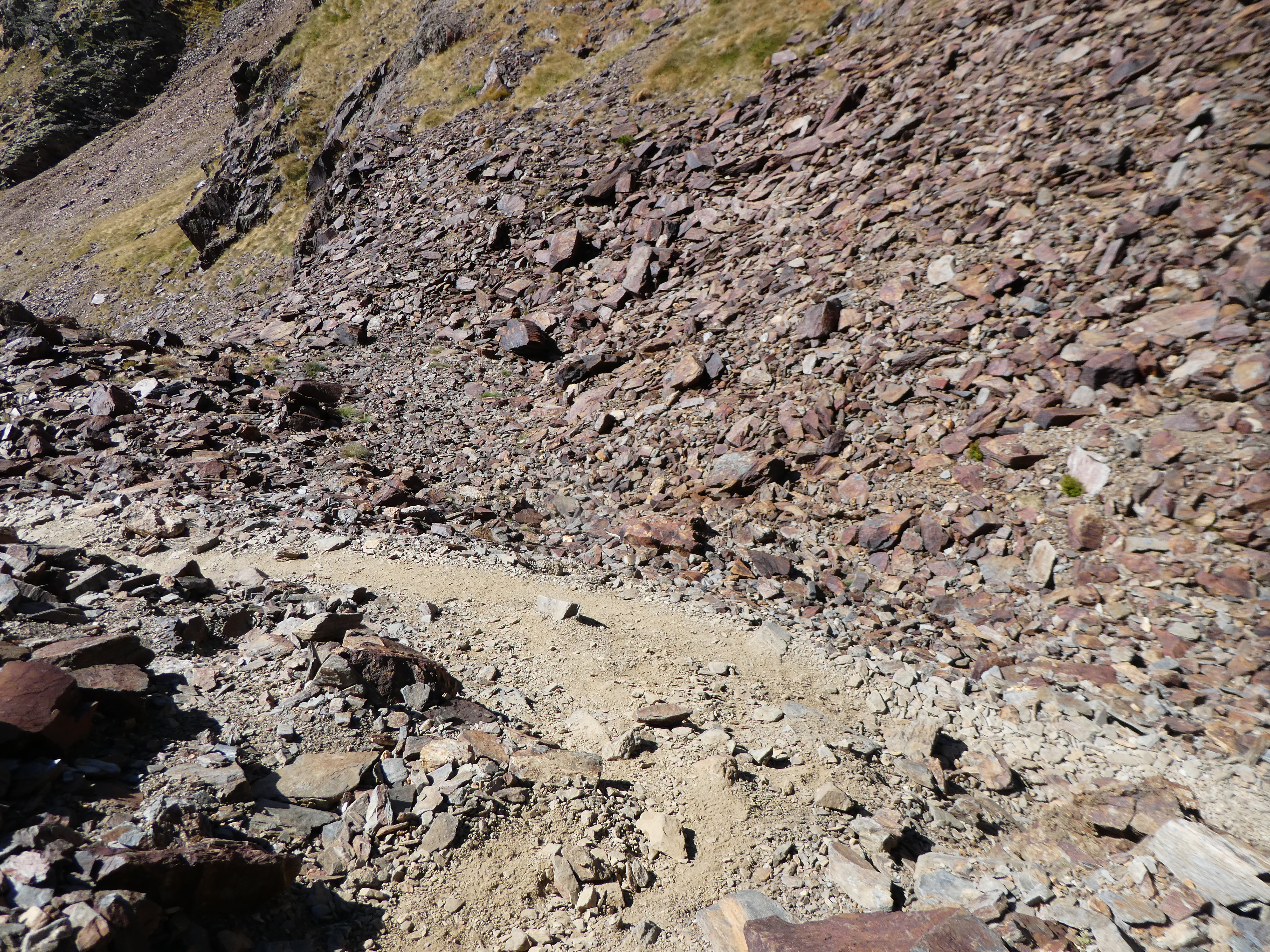 Très raide montée à l'approche de la Portella de Baiau sur un terrain croulant !