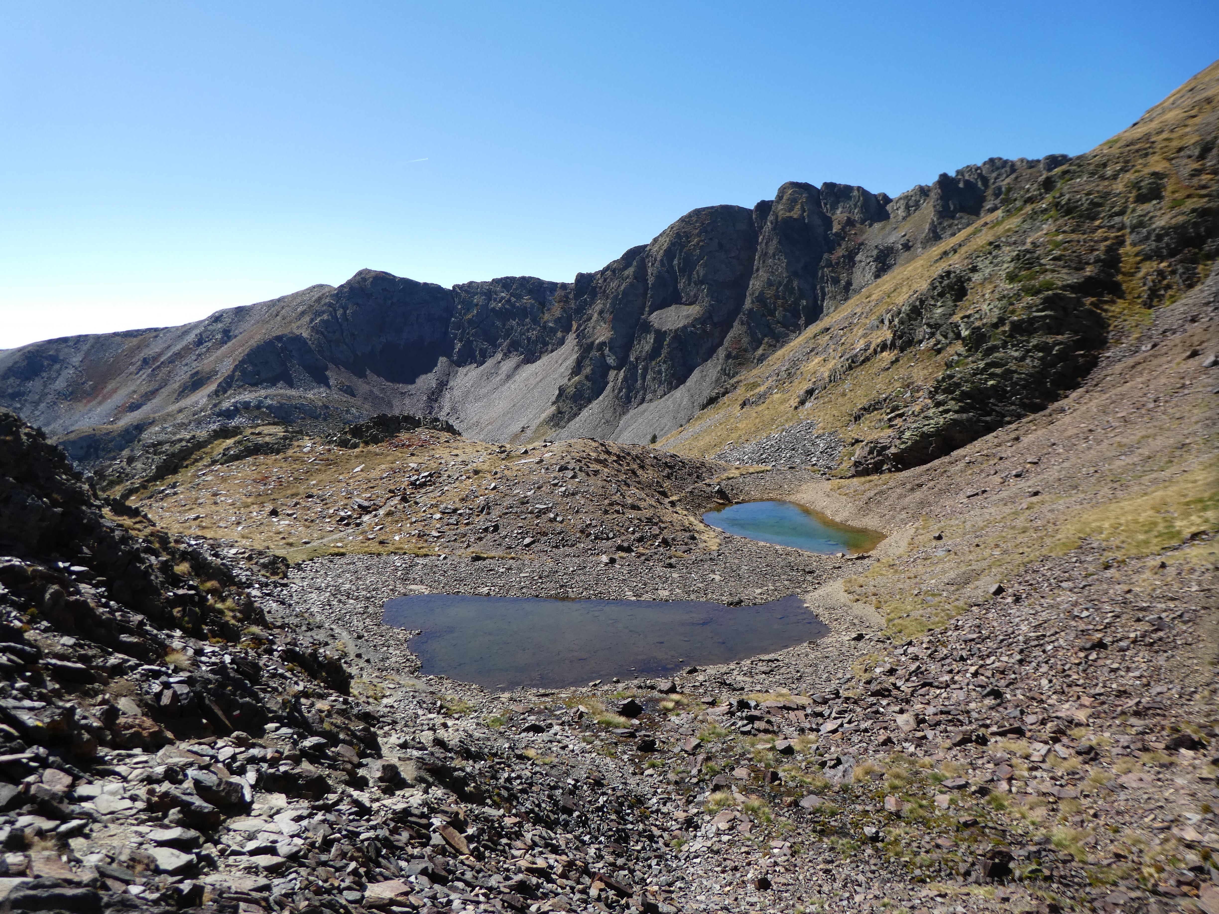 Collada dels Estanys Forcats (2743 m) : frontière andorrano-espagnole : suivre le chemin descendant sur la droite direction Estanys de Baiau, balisé en rouge et blanc dorénavant (entrée en Espagne) (le sentier est parfois mal tracé ... bien suivre les balises rouges et blanches)