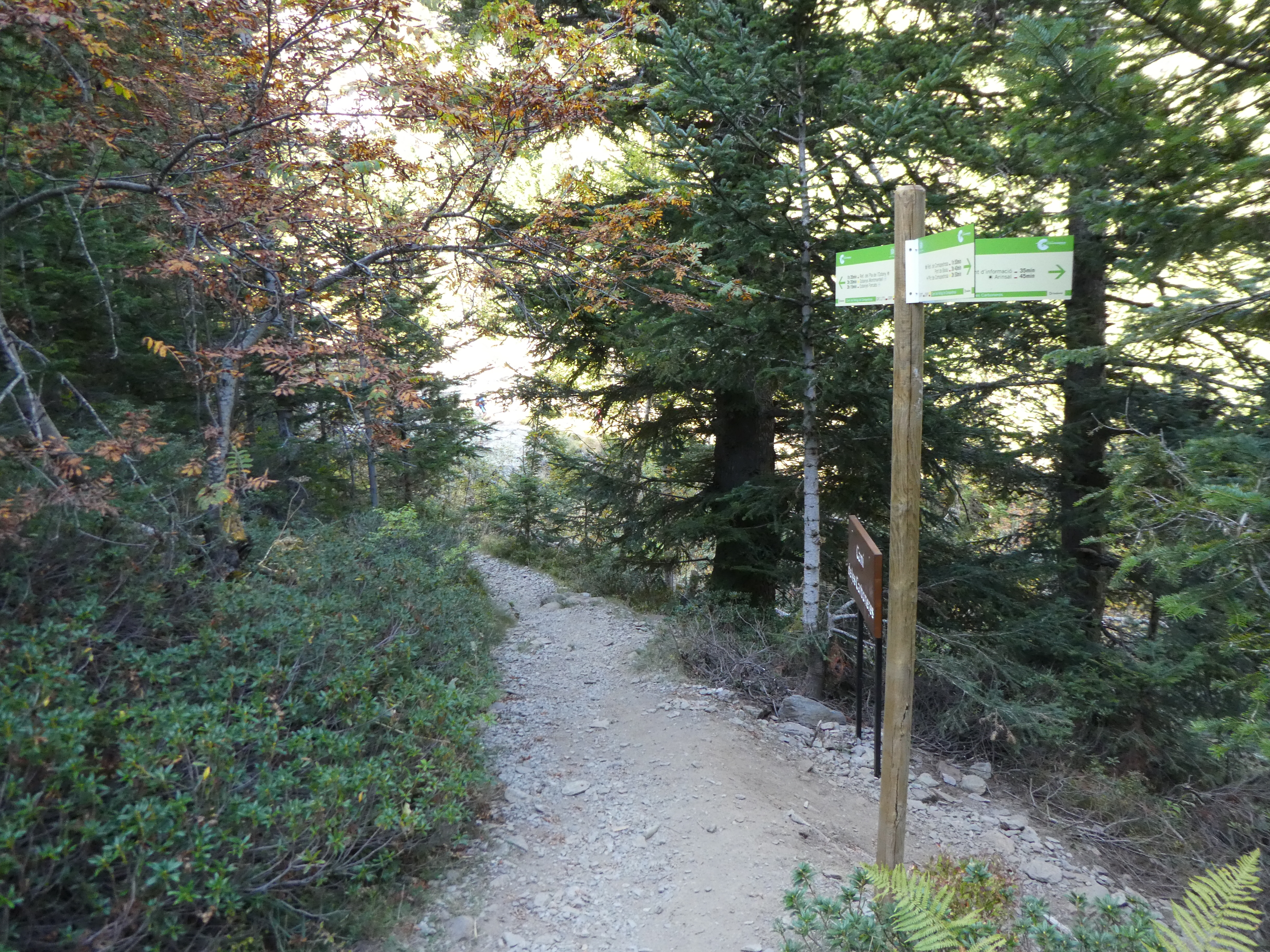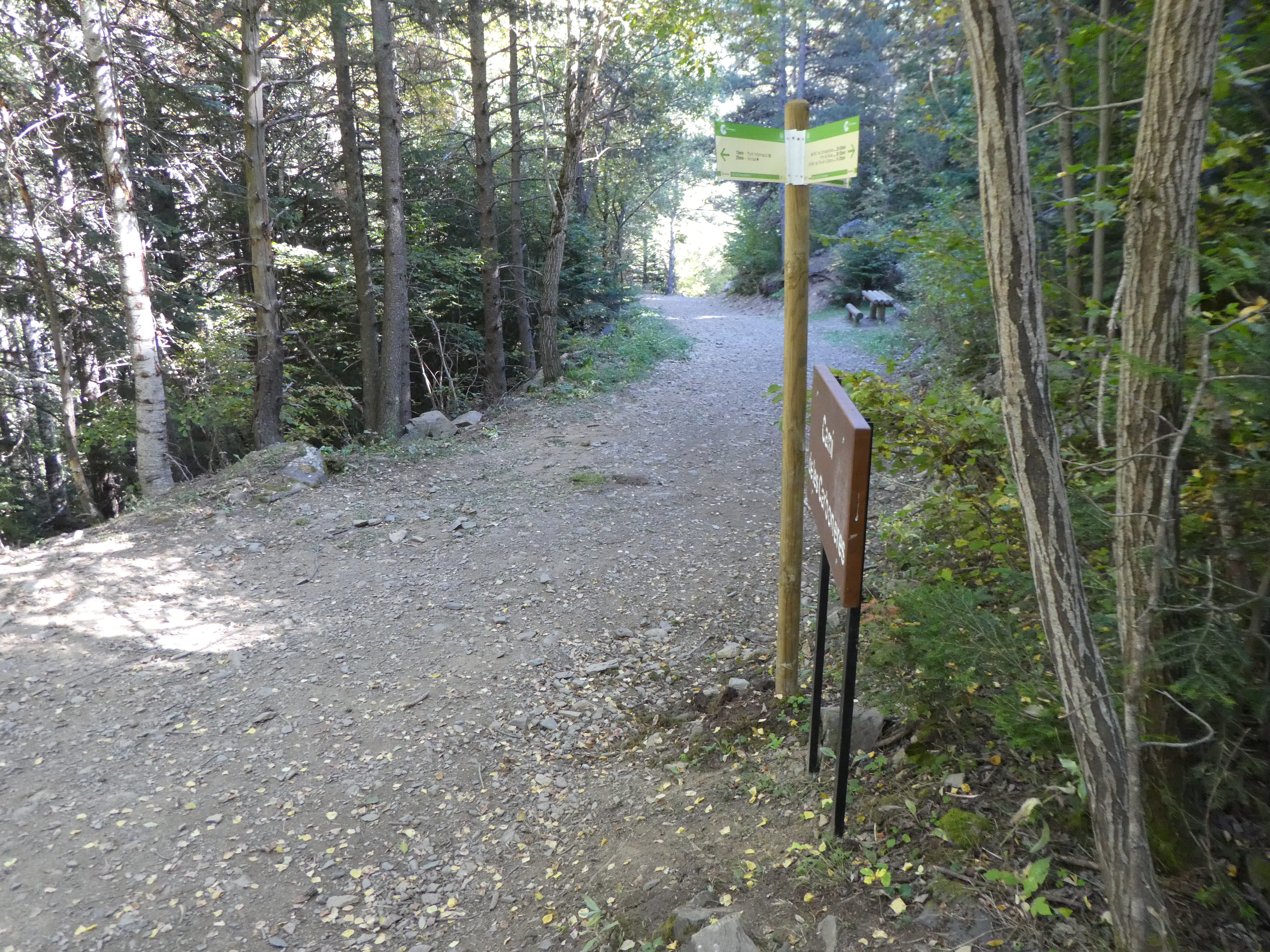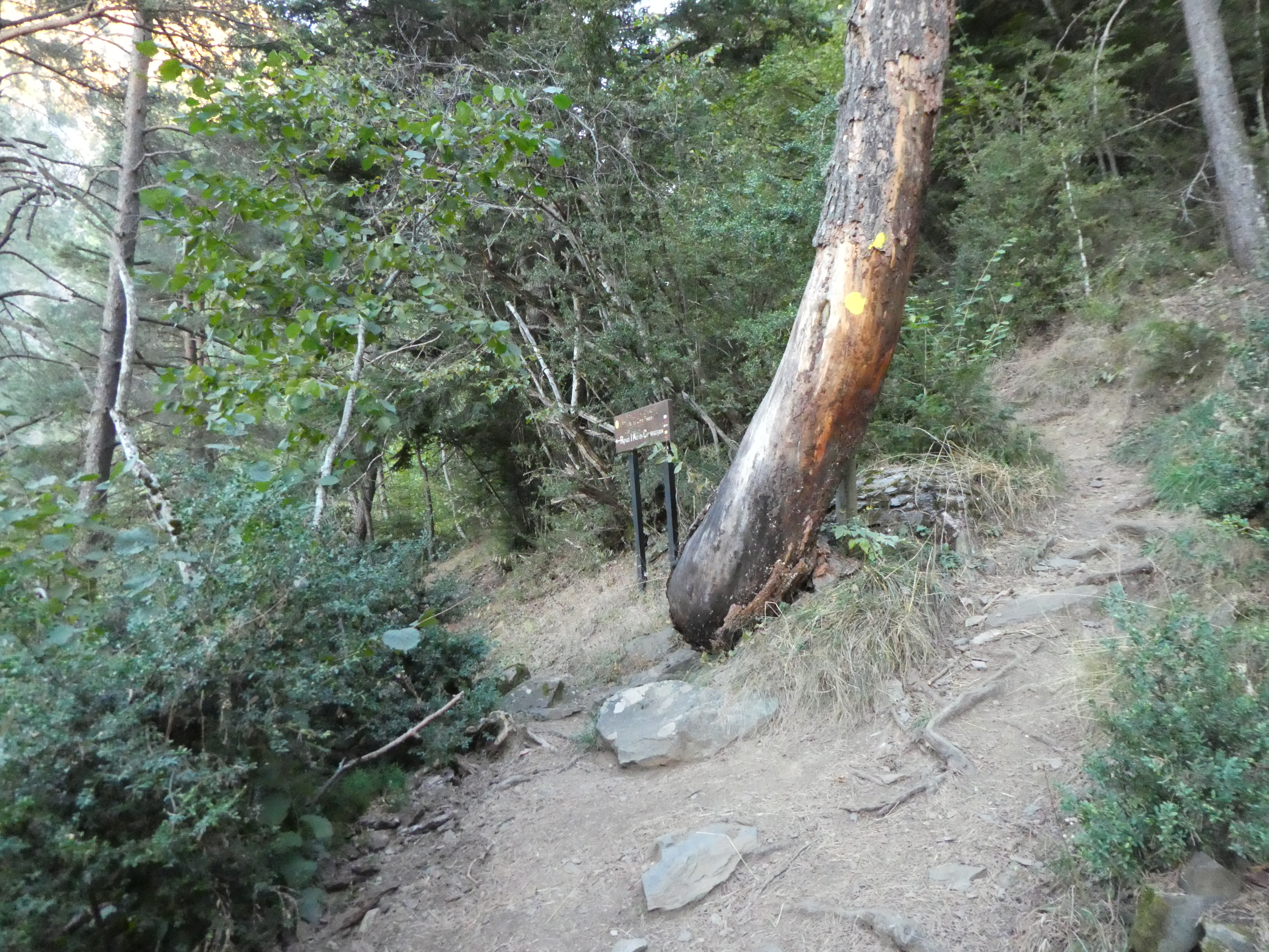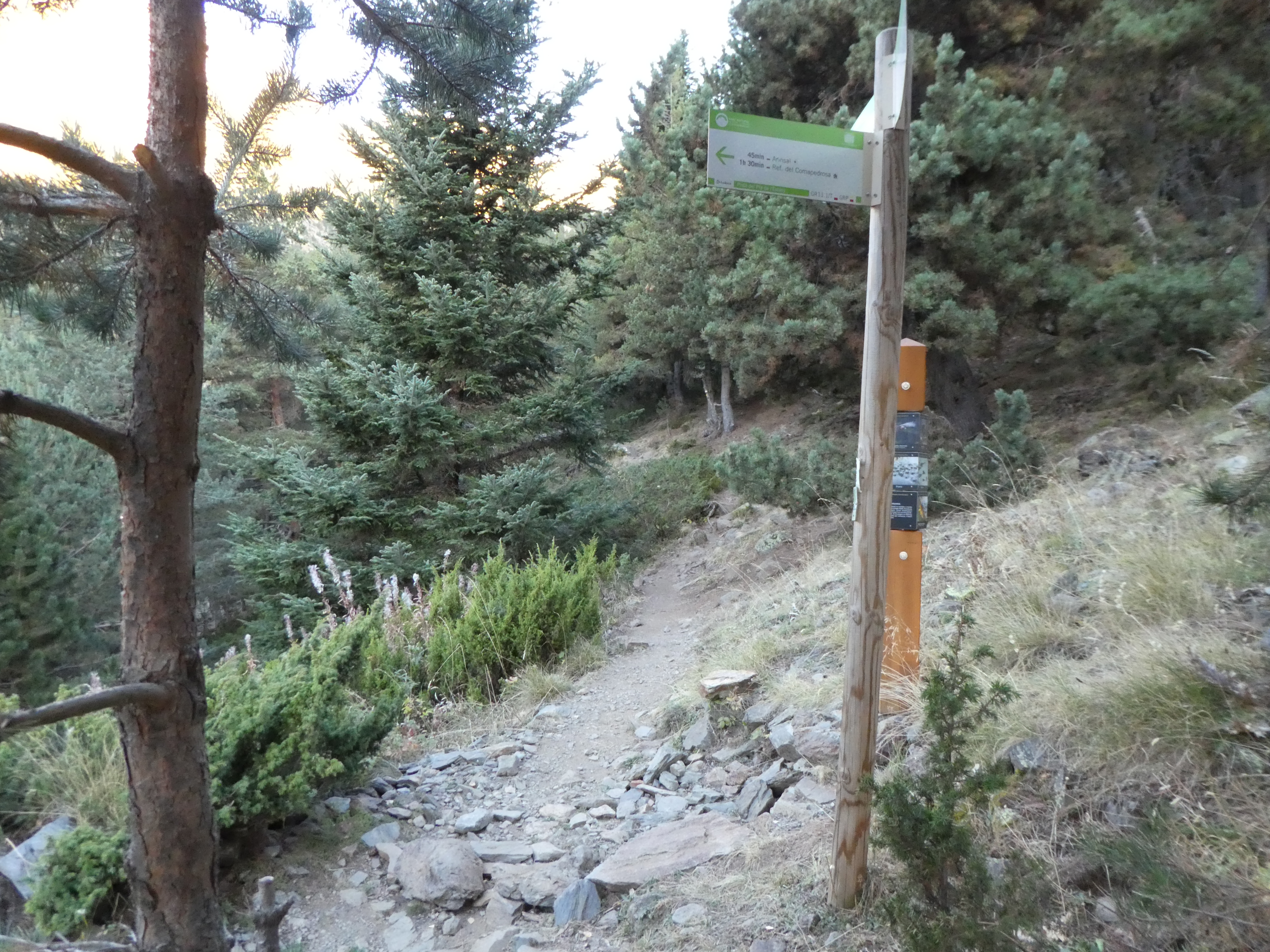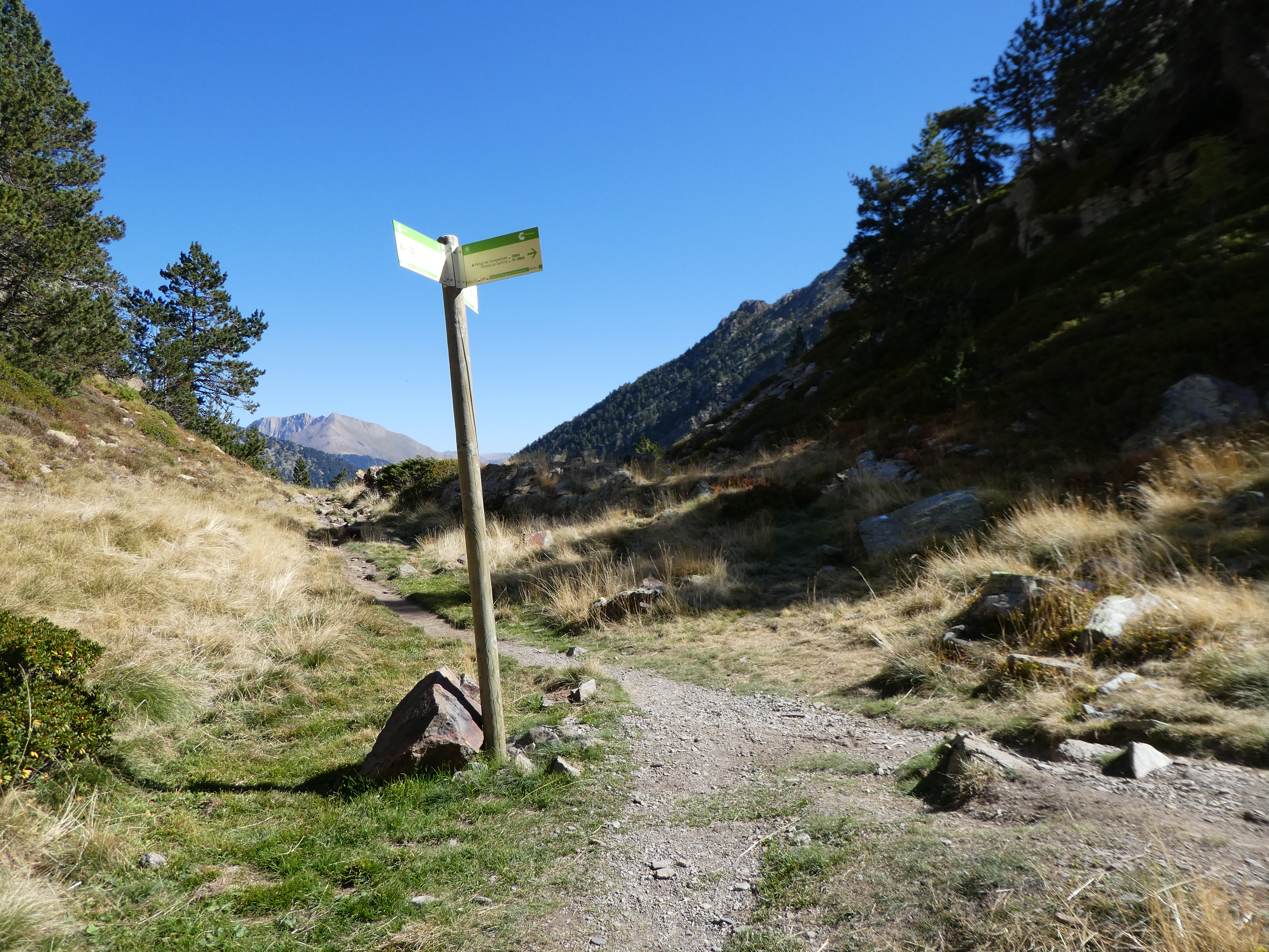 A ce croisement marqué par la présence d'un panneau directionnel (1700 mètres après le Collet de Comapedrosa), suivre le GR11 descendant sur la droite (Camí de les Carboneres) direction Arinsal, balisé en rouge et blanc, et en jaune