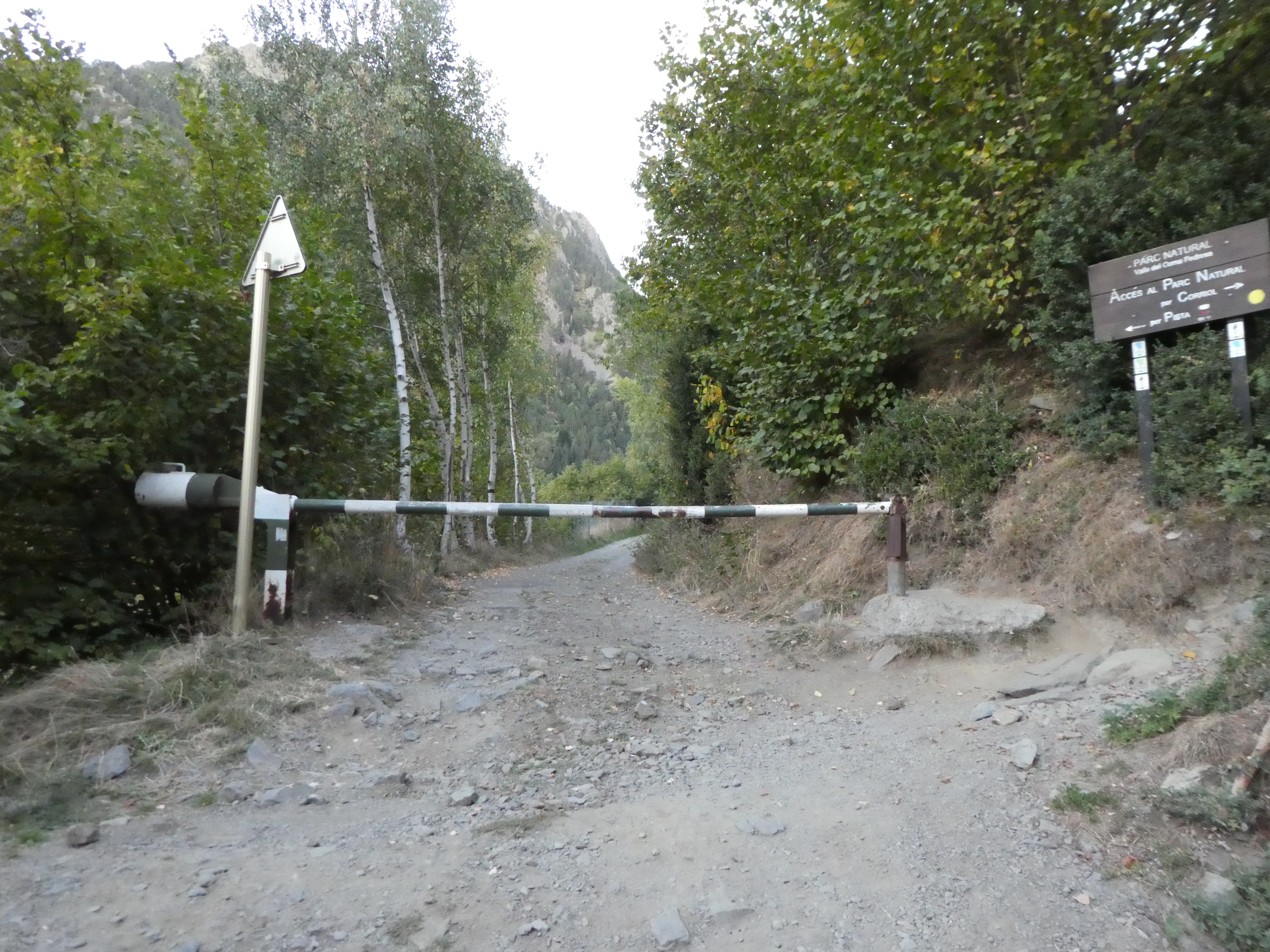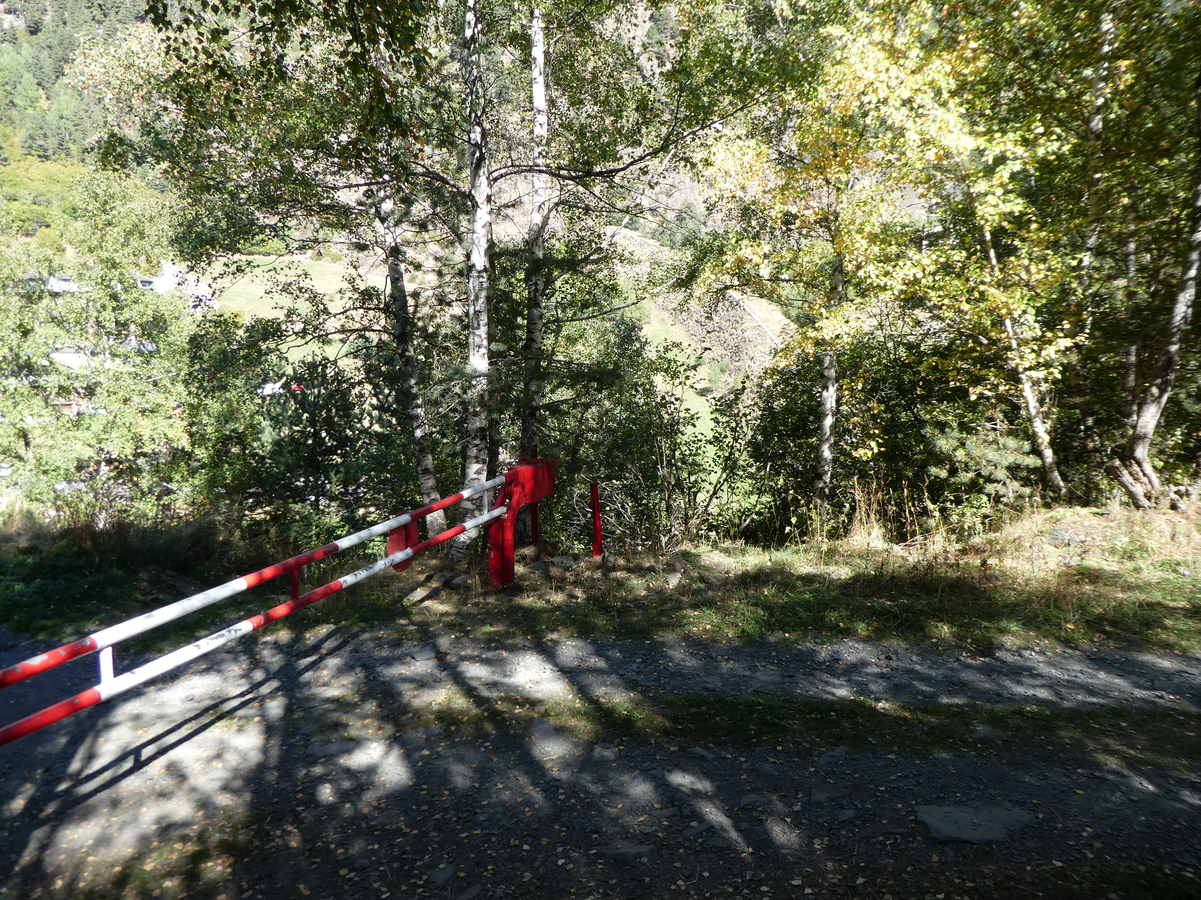 A ce croisement marqué par la présence d'une barrière et d'un panneau directionnel (300 mètres après le précédent), suivre le large chemin partant sur la gauche direction Arinsal, balisé en jaune