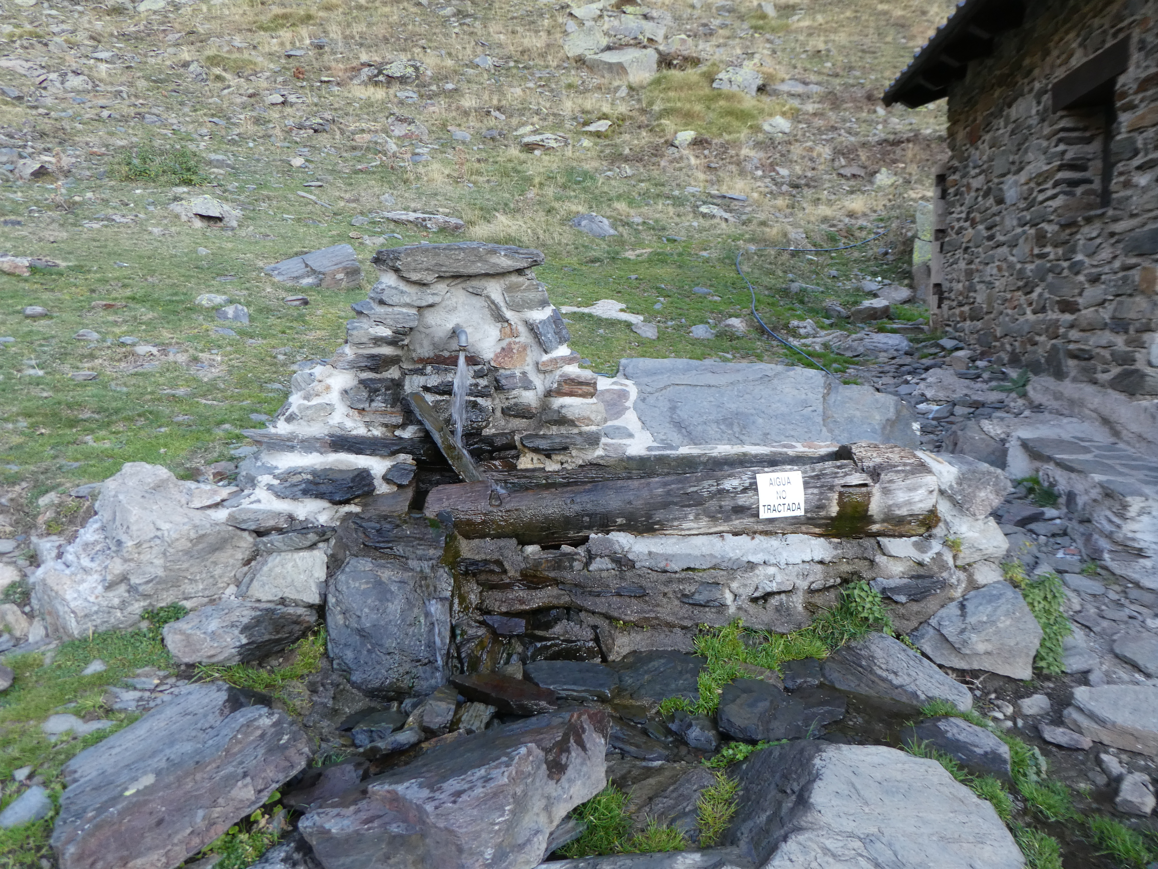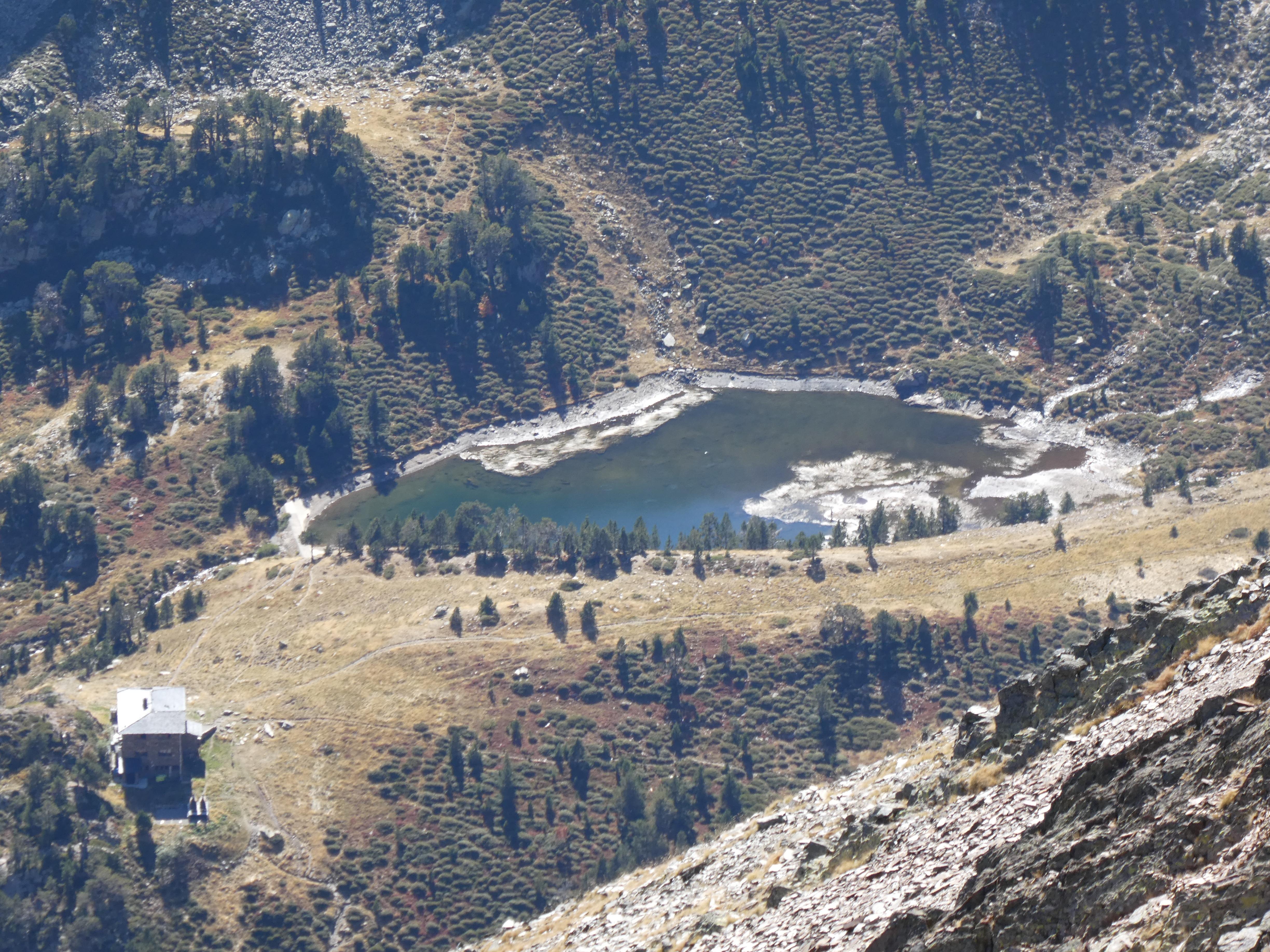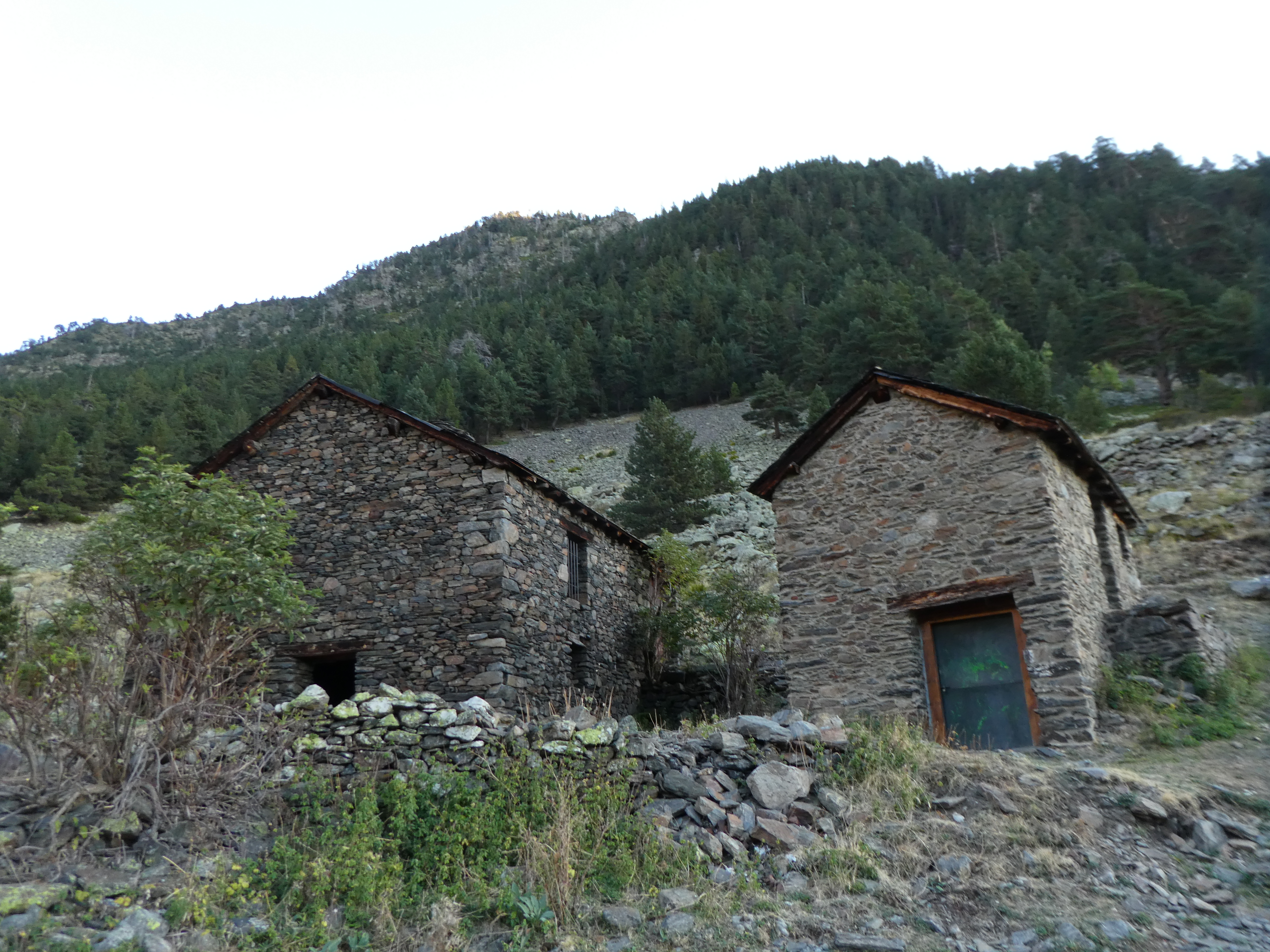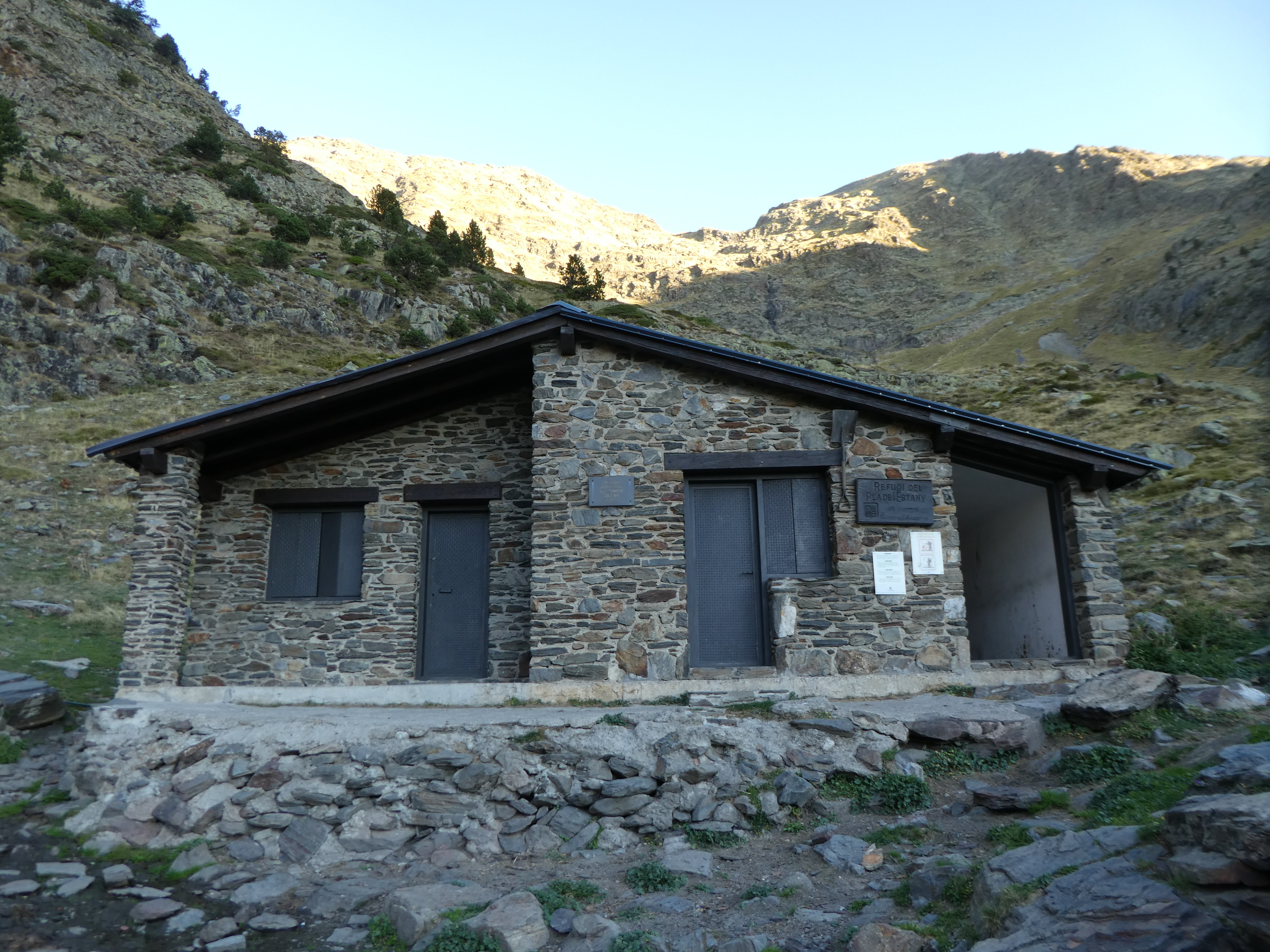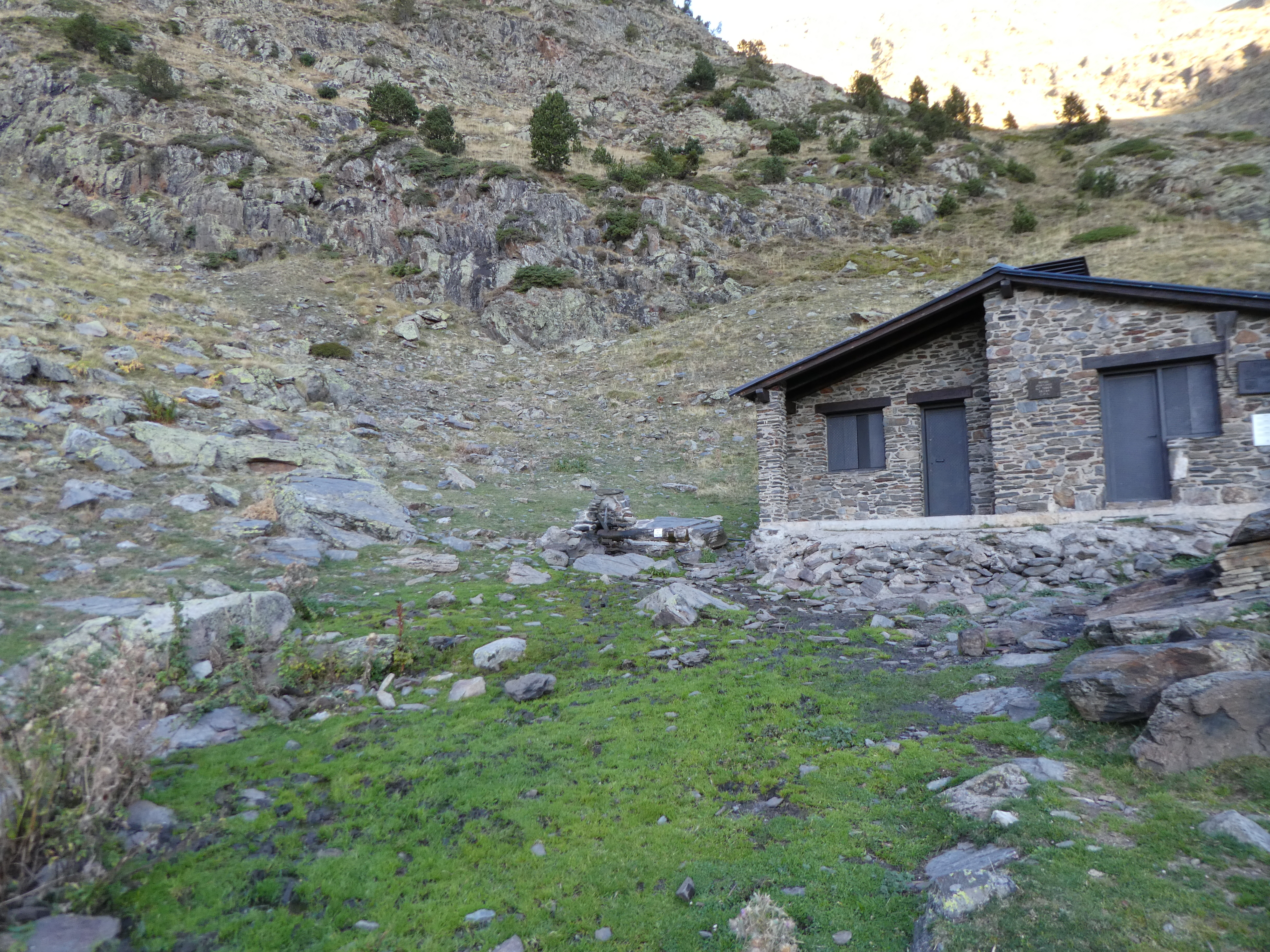 Refugi del Pla de l'Estany o de Joan Canut (2060 m) : suivre le chemin montant raidement sur la droite direction Estanys Forcats, balisé en jaune (il y a quelques balises rouges et blanches encore visibles à côté des balises jaunes)