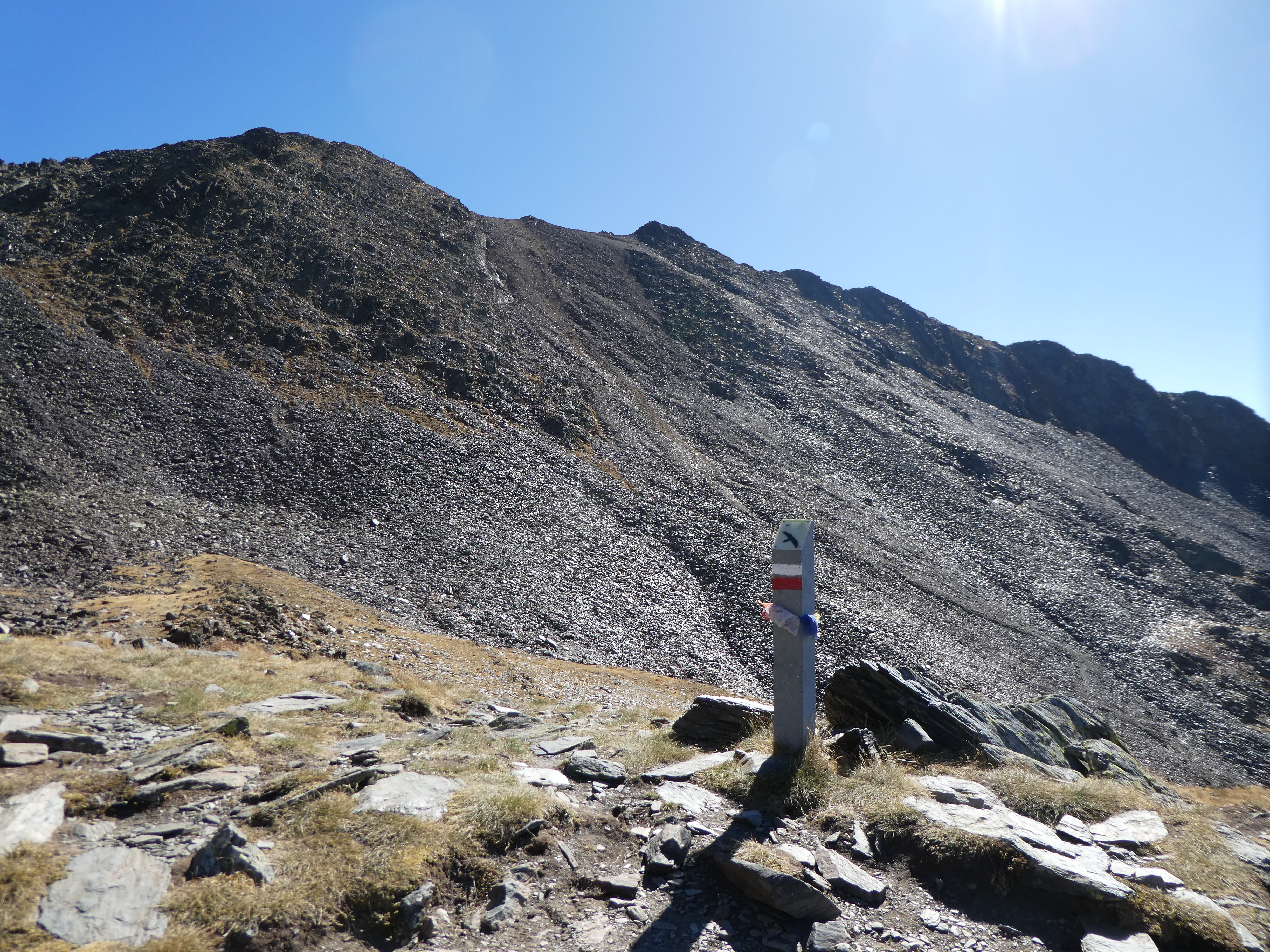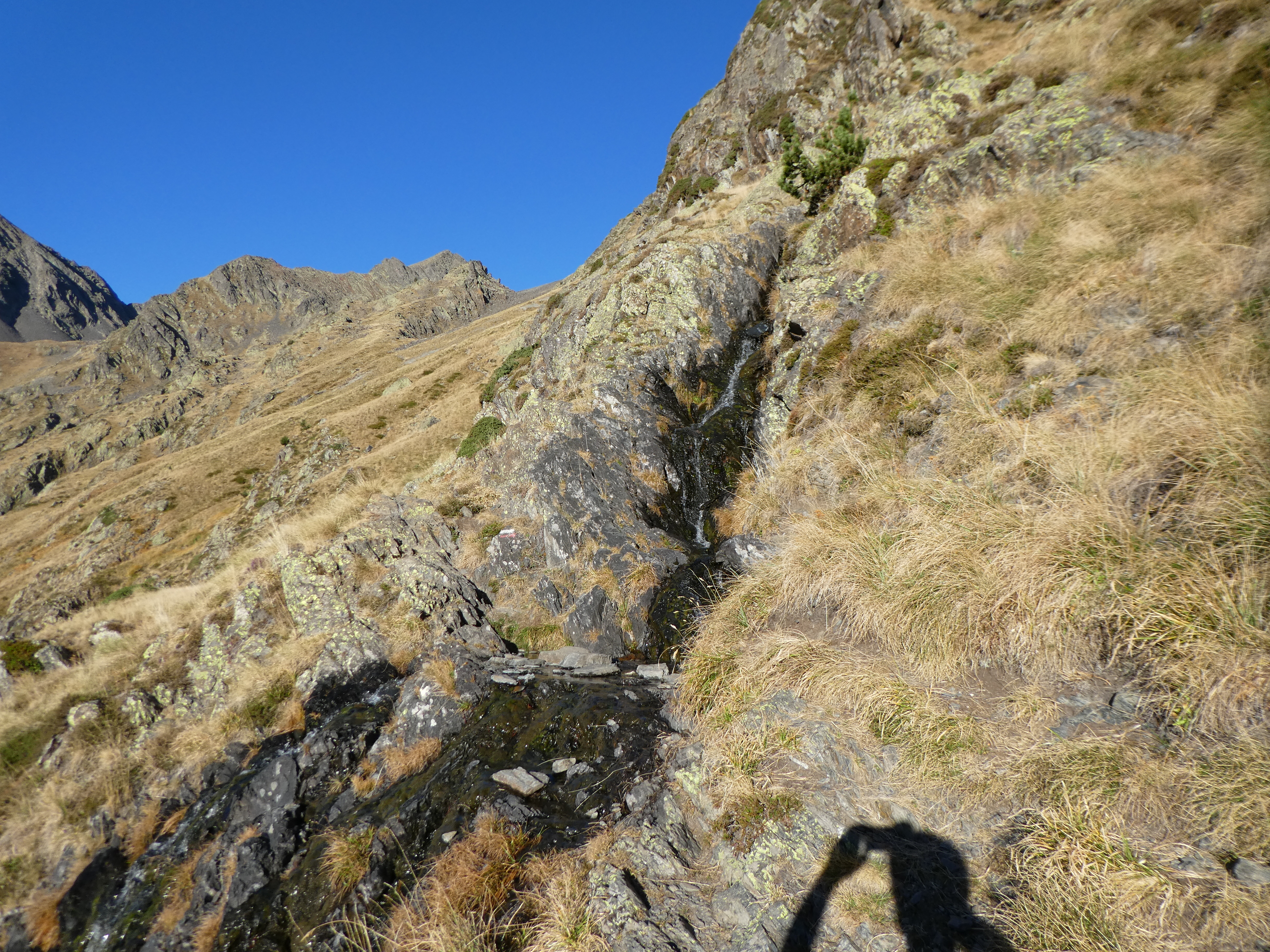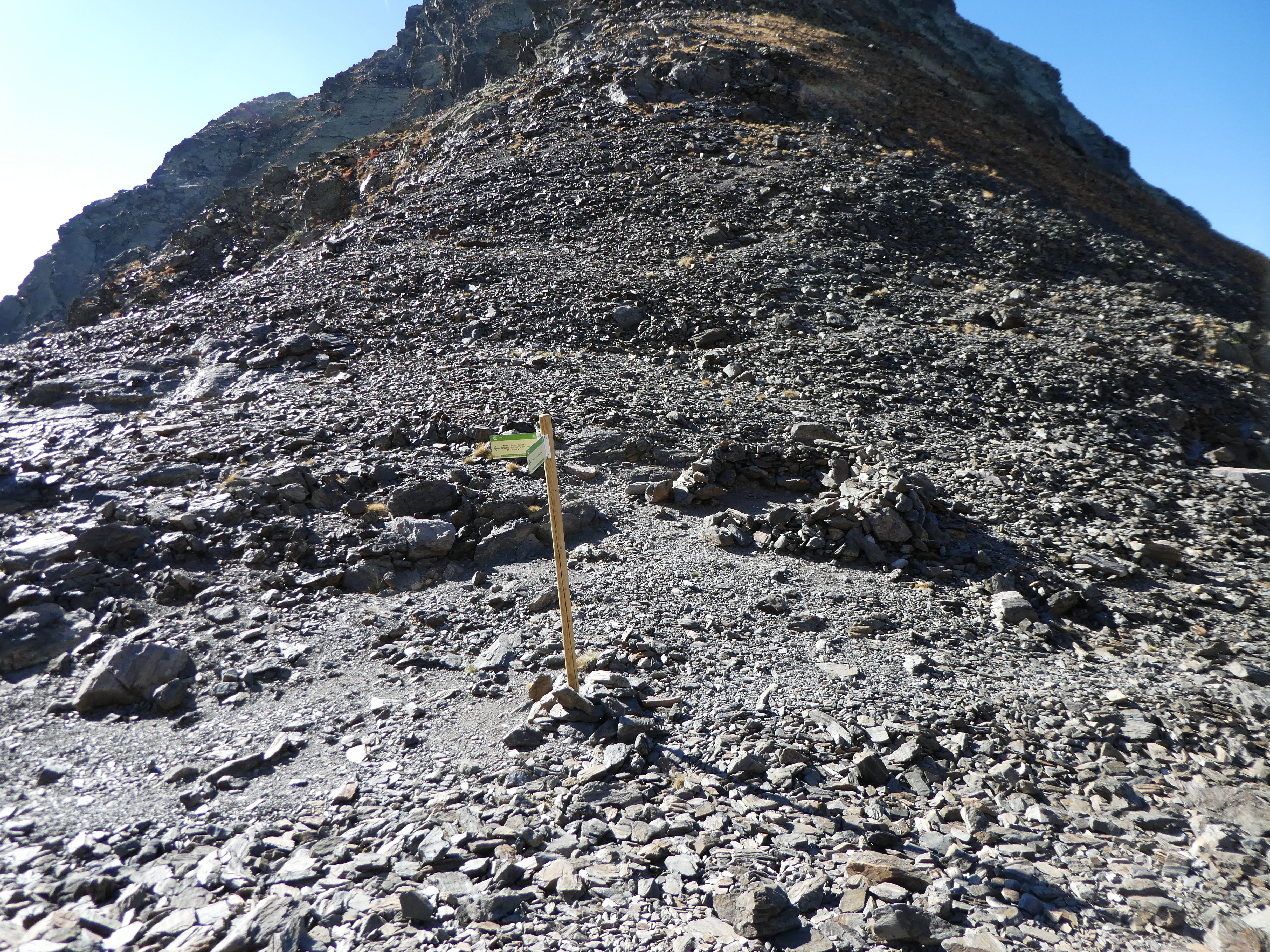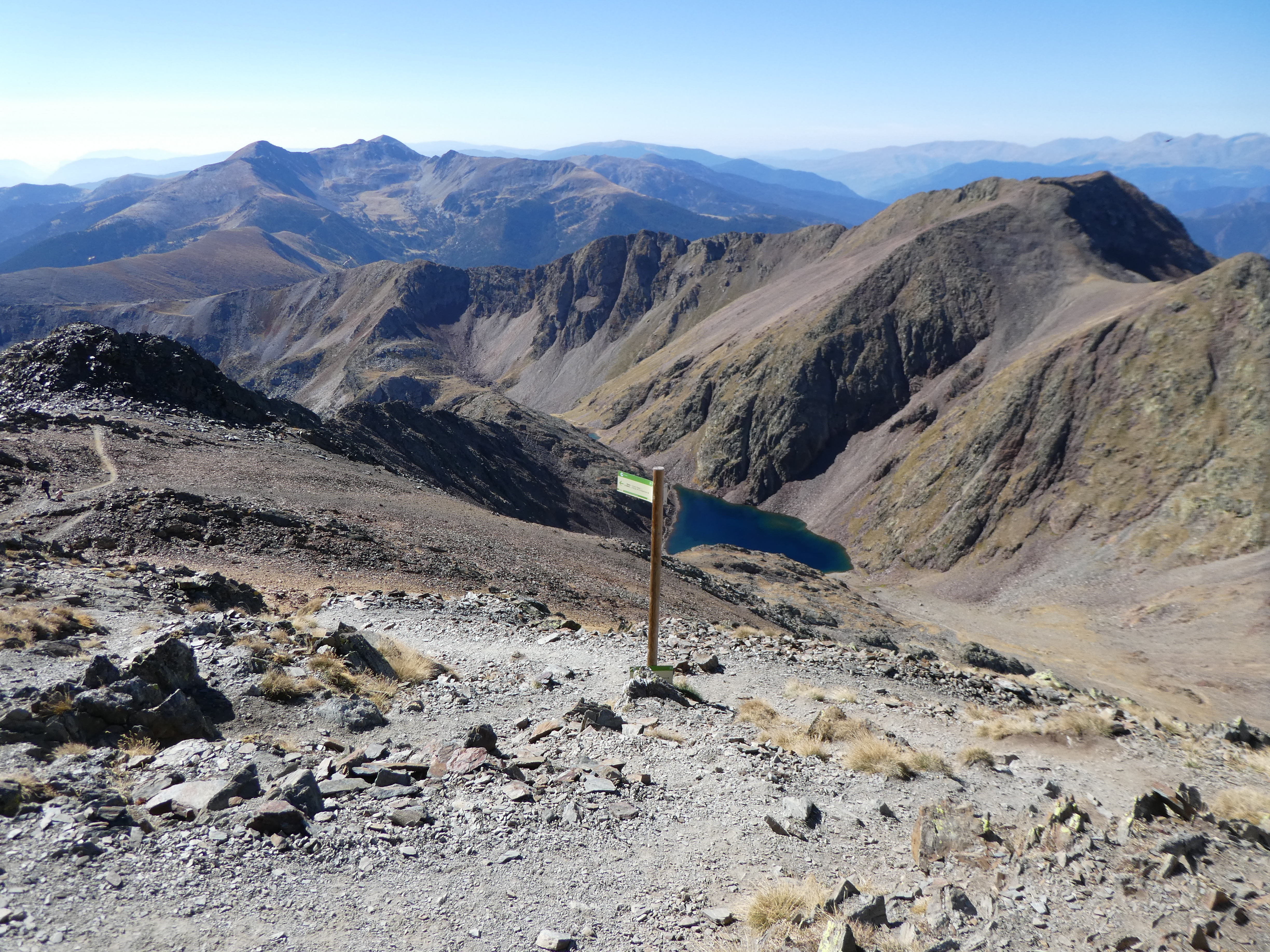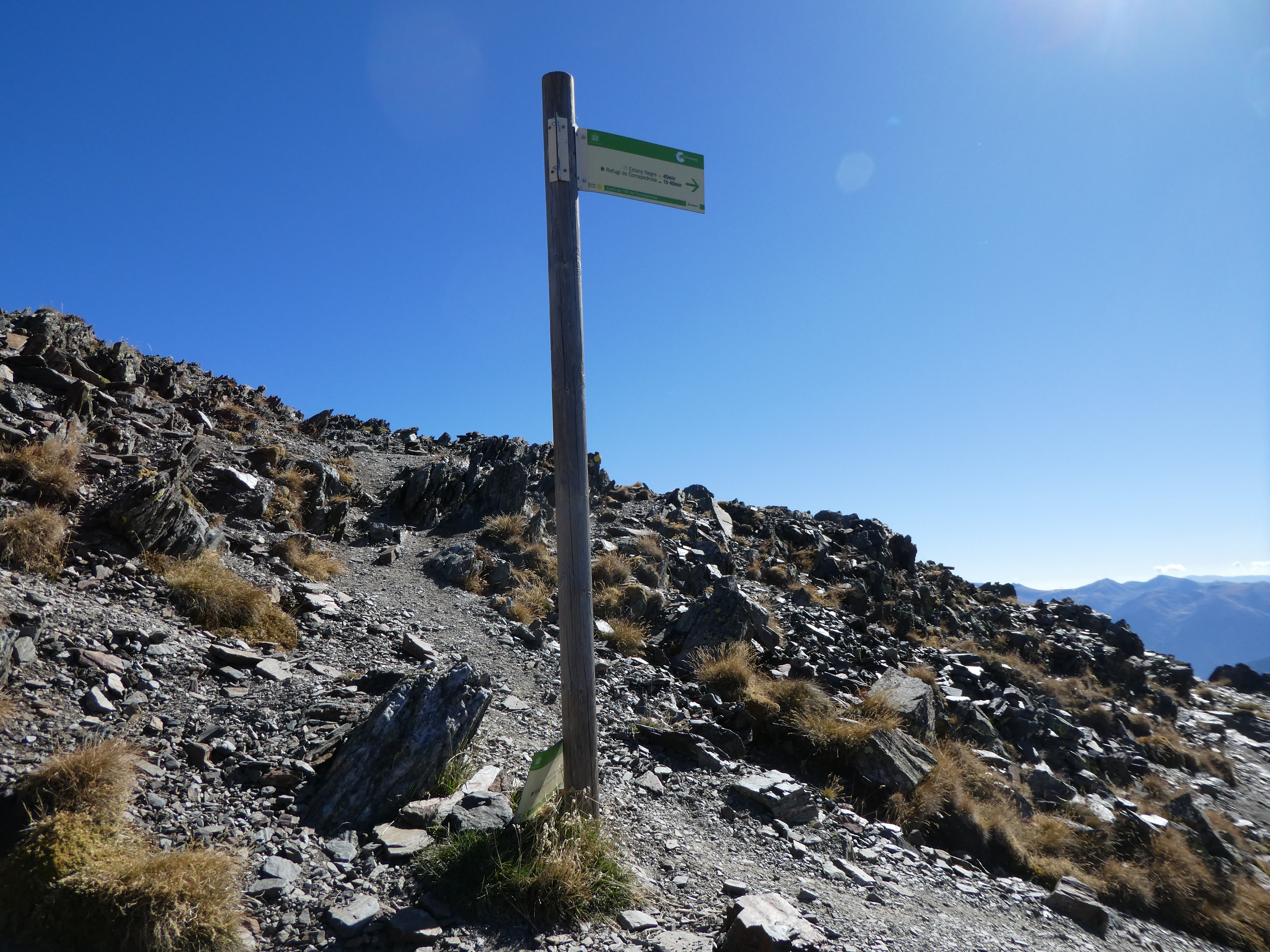 A ce croisement avec le GR11 (1000 mètres après avoir quitté le Pic de Coma Pedrosa), suivre ce dernier partant sur la gauche direction Refugi de Comapedrosa, balisé en rouge et blanc, et en jaune dorénavant