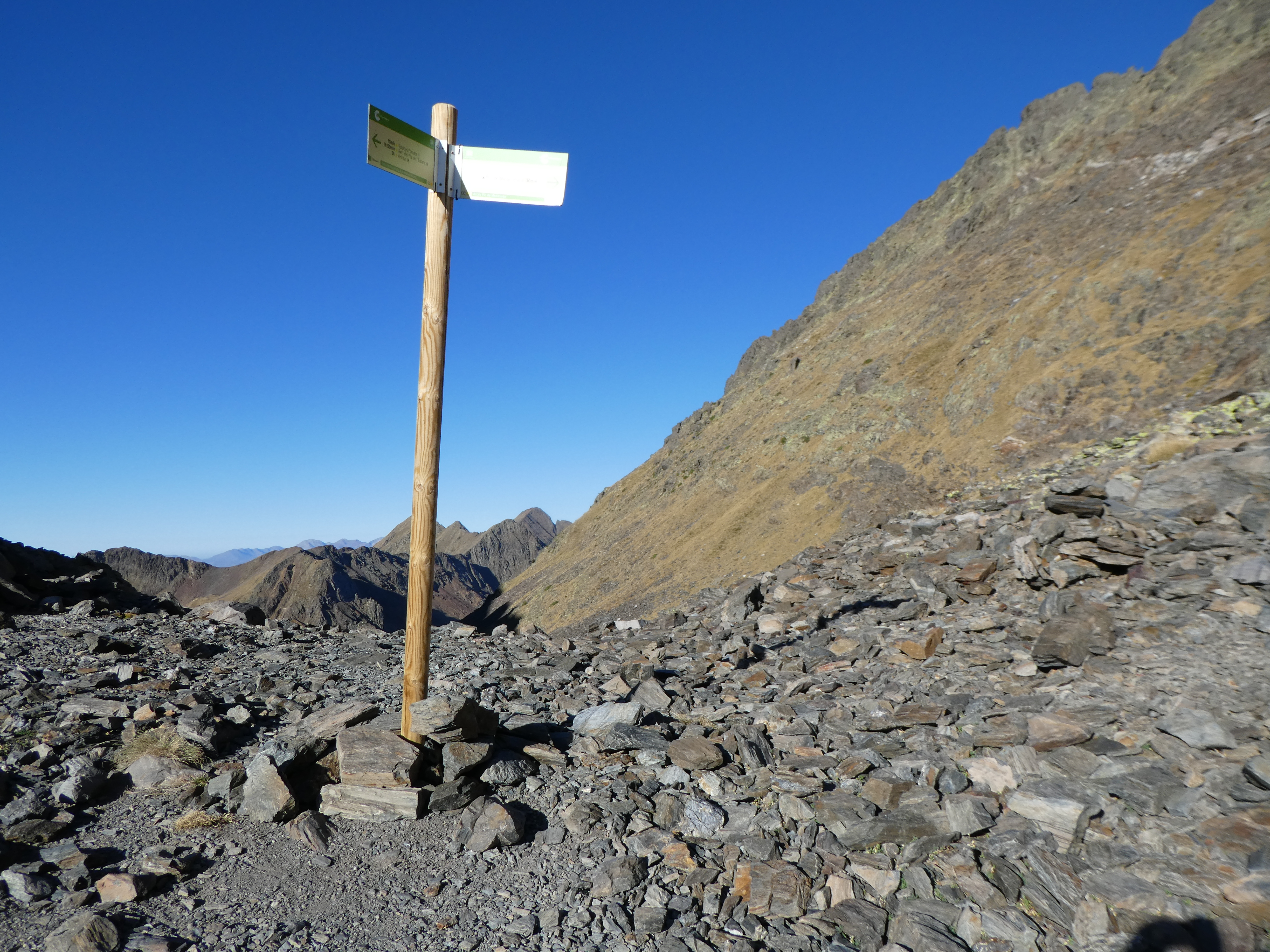 Collet de Comapedrosa (2244 m) : suivre le GR11 partant tout droit direction Arinsal, balisé en rouge et blanc, et en jaune (le chemin montant sur la droite mène directement au Refugi de Comapedrosa)