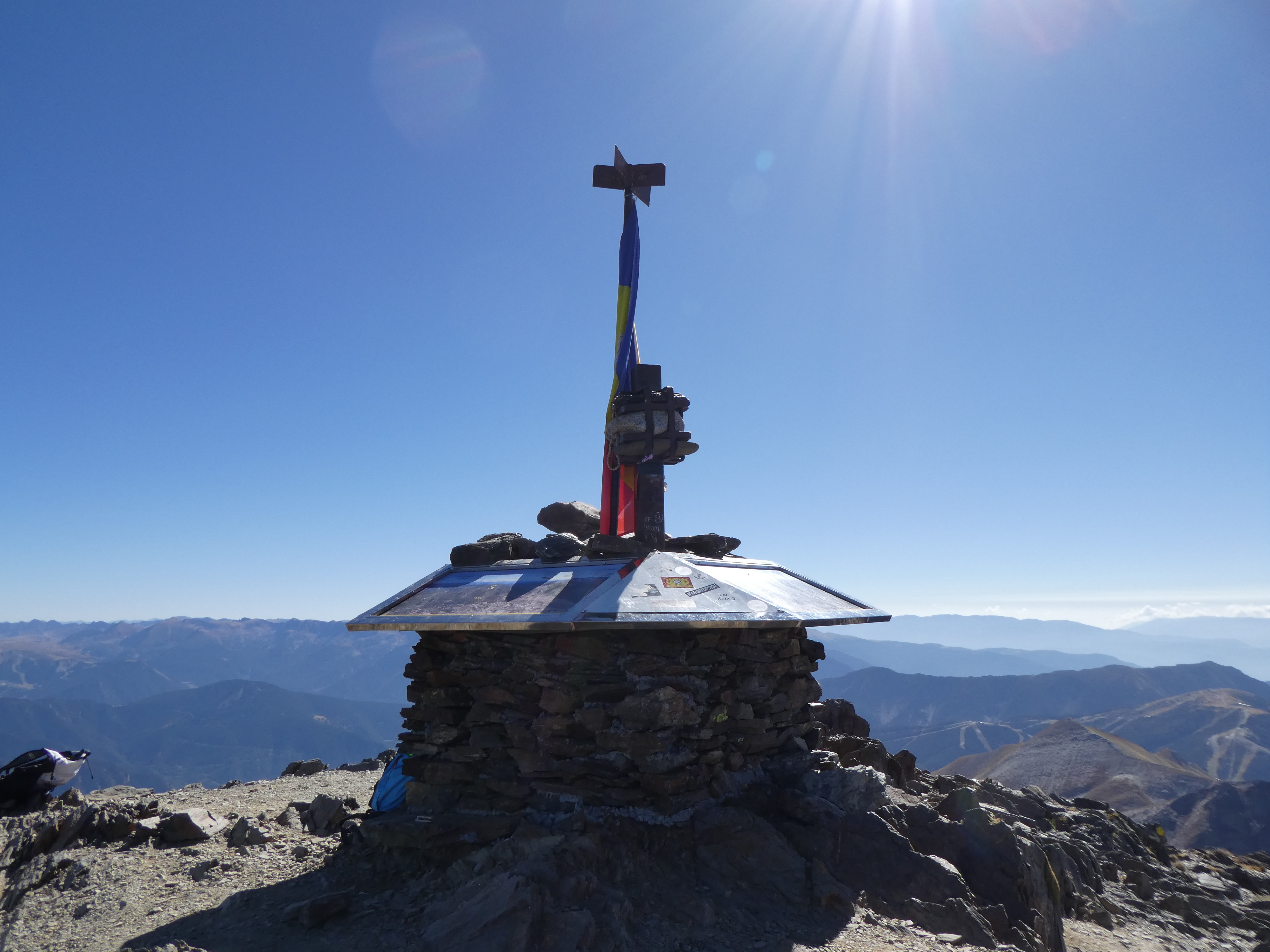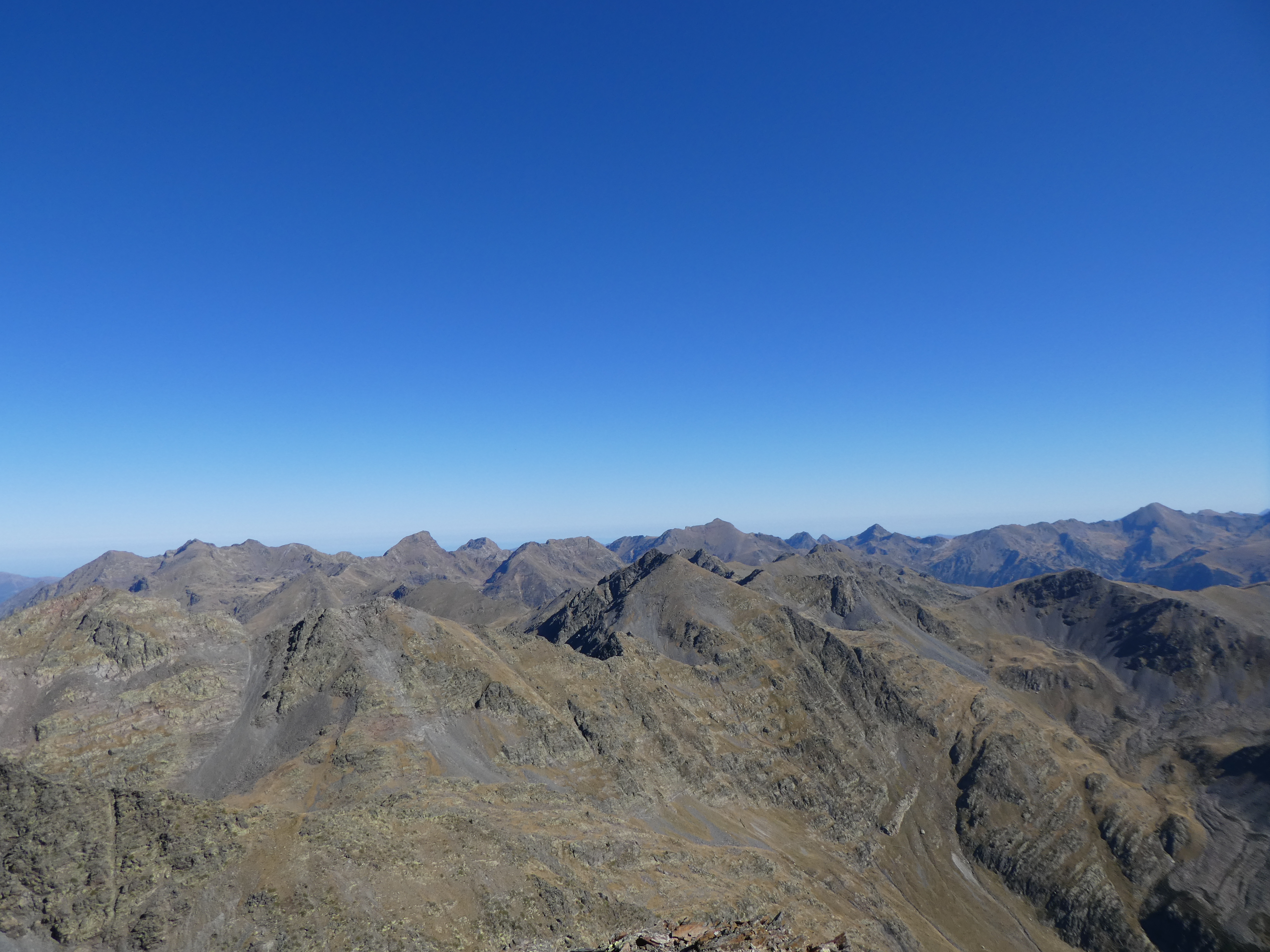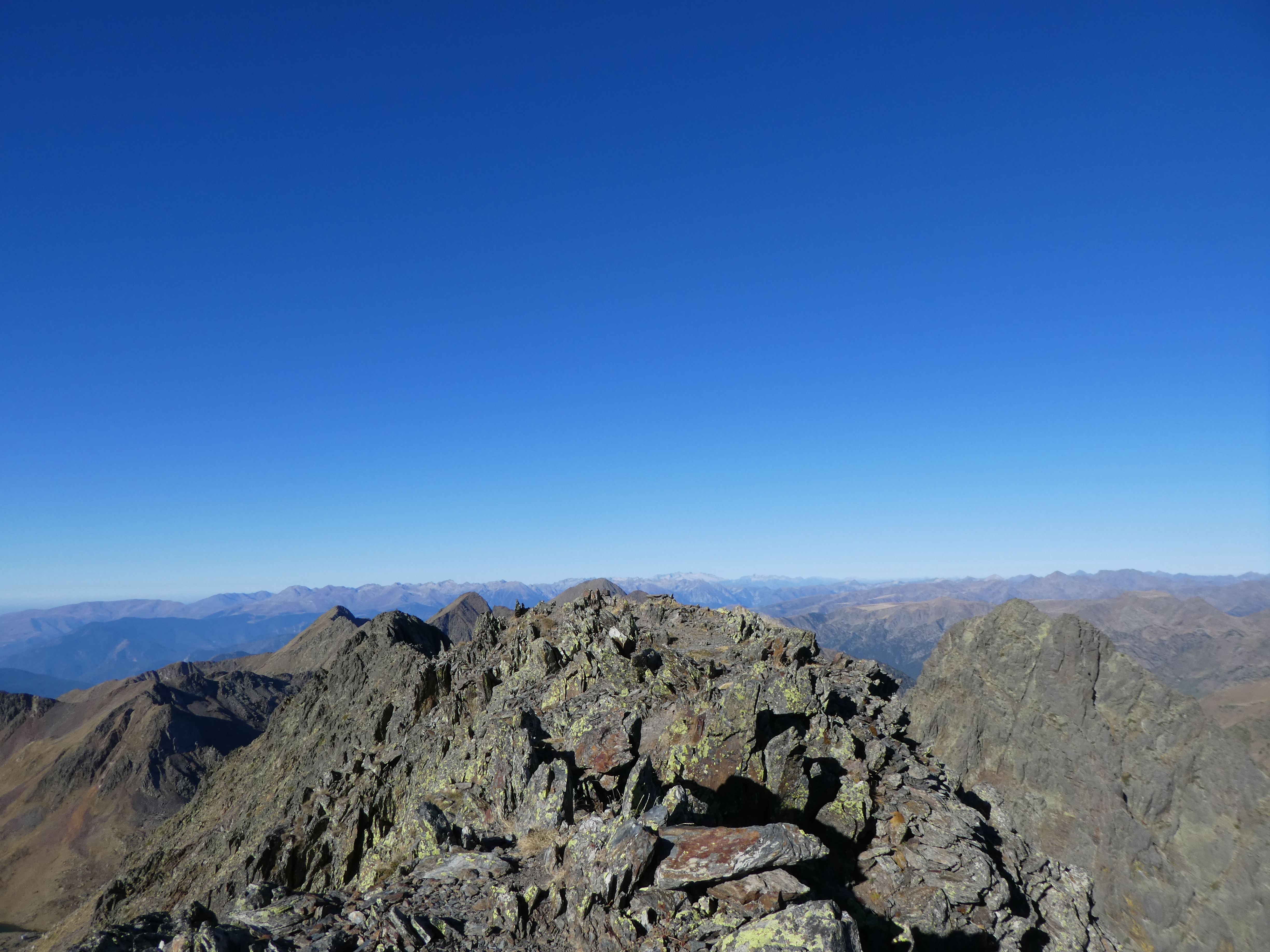 Arrivée au sommet du Pic de Coma Pedrosa ou Pic Alt de Comapedrosa (2942 m) : panorama semblable à celui du Pic de Medecorba avec vue plus étendue sur les sommets de l'Alt Urgell