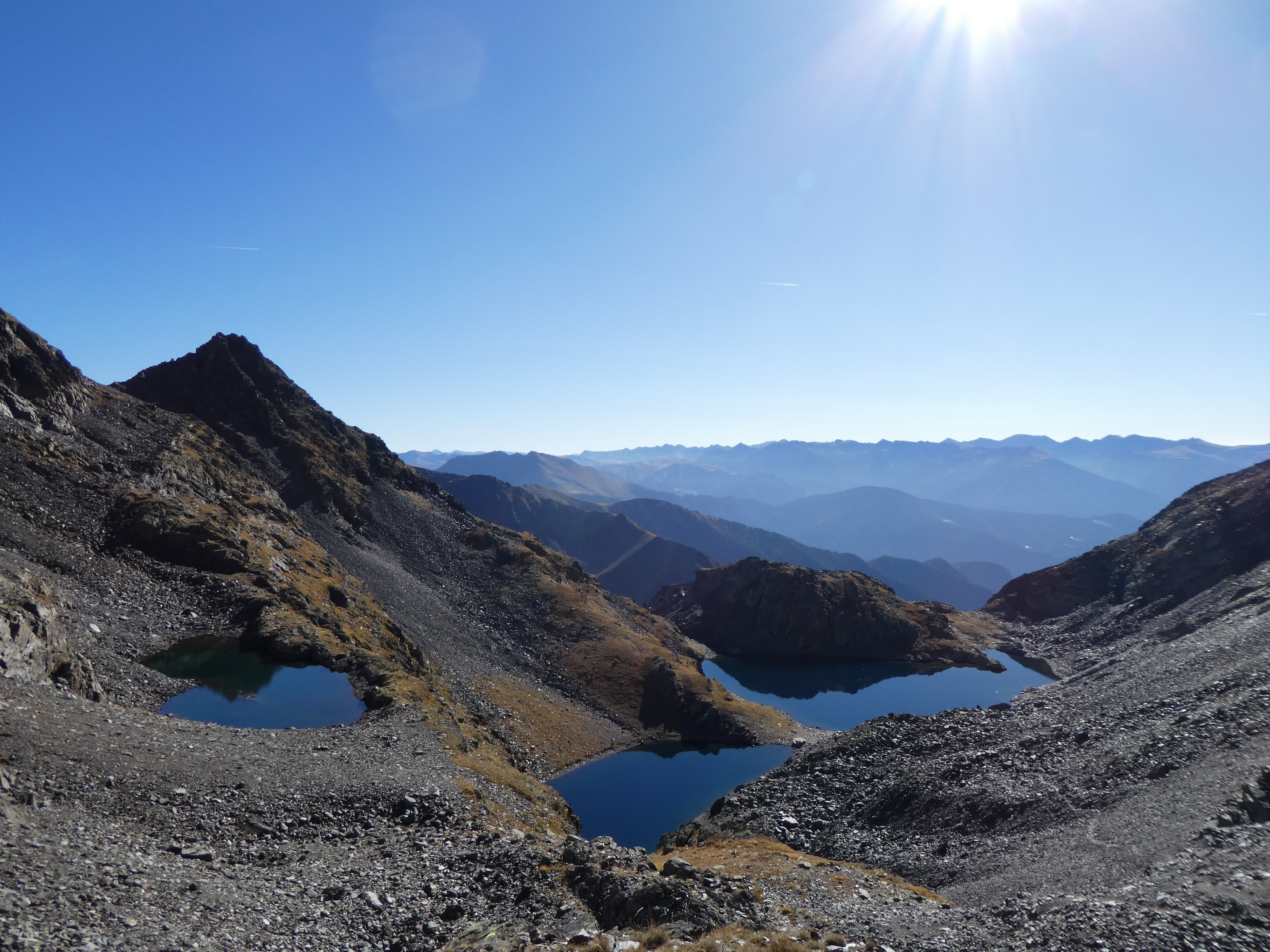 Zoom sur le Pic de la Clavera (2677 m) à gauche, le Mont du Petit Valier (2736 m) au centre et le Mont Valier (2838 m) à droite