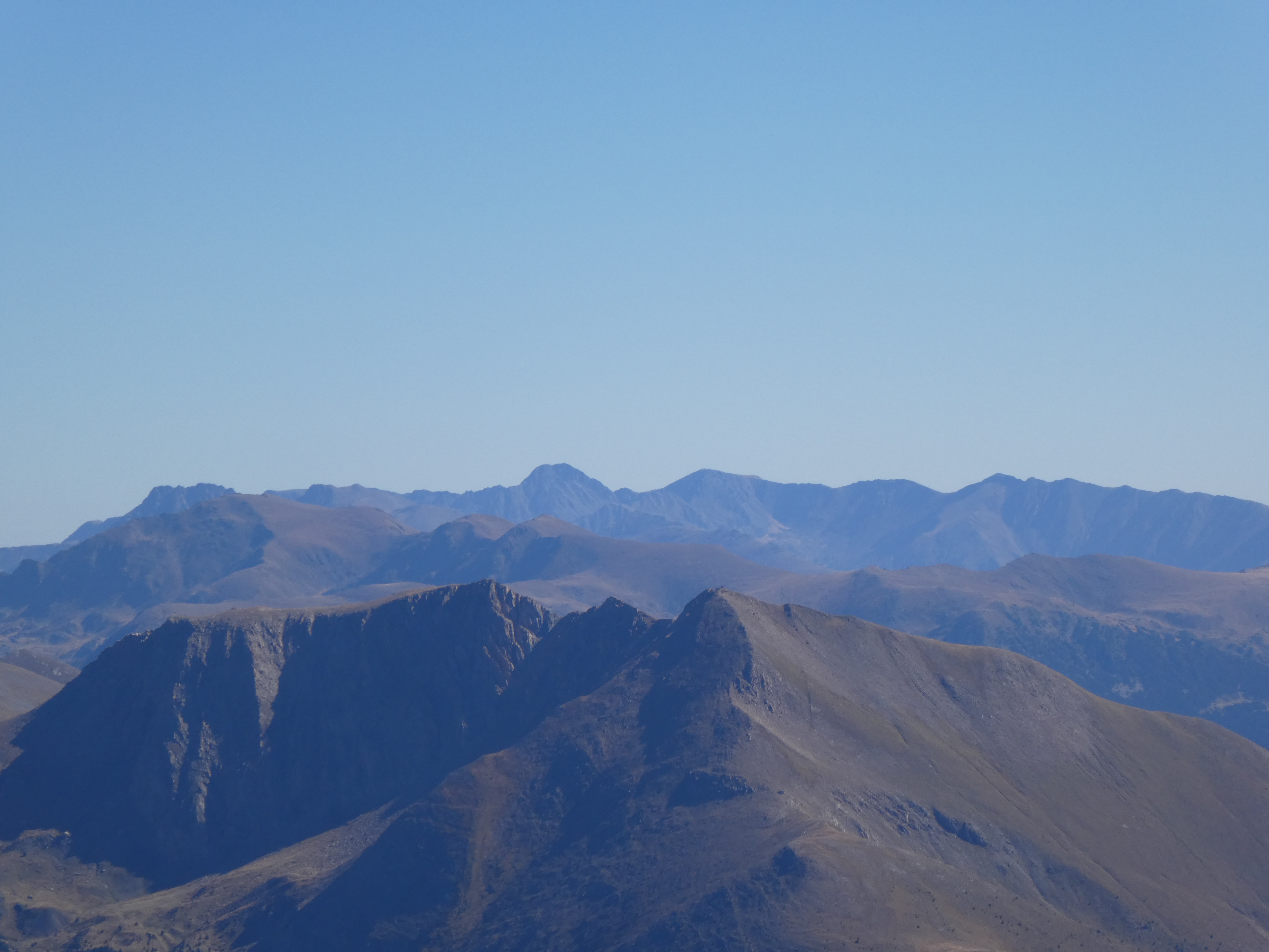 Zoom sur le Puig Redon (2677 m) et le Pic de Serra Gallinera (2663 m) à gauche, le Pic de la Dona (2702 m) au centre, le Pic dels Bacivers de Prats (2844 m) au centre-gauche, et le Bastiments (2881 m) et le Pic de l'Infern (2868 m) à droite en arrière-plan ... au deuxième-plan, on aperçoit le Pic de Font Freda (2738 m) à gauche, et le Pic de les Valletes (2791 m) et le Pic de la Vinyola (2814 m) au centre-droit