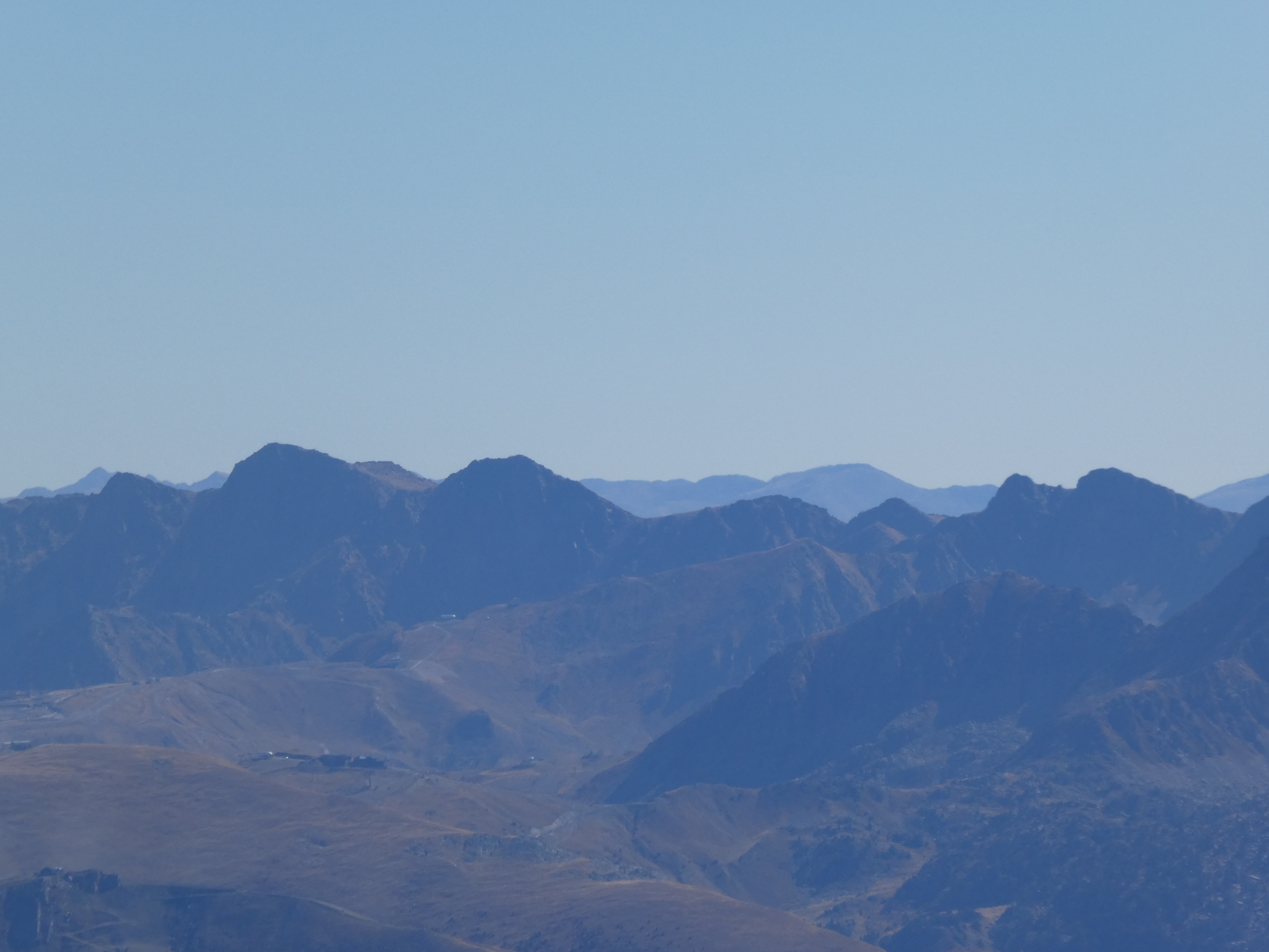 Zoom sur le Pic de Font Negra (2877 m) à gauche, le Puig de Finestrelles (2827 m) au centre-droit (au fond) et le Pic Negre d'Envalira (2827 m) à droite