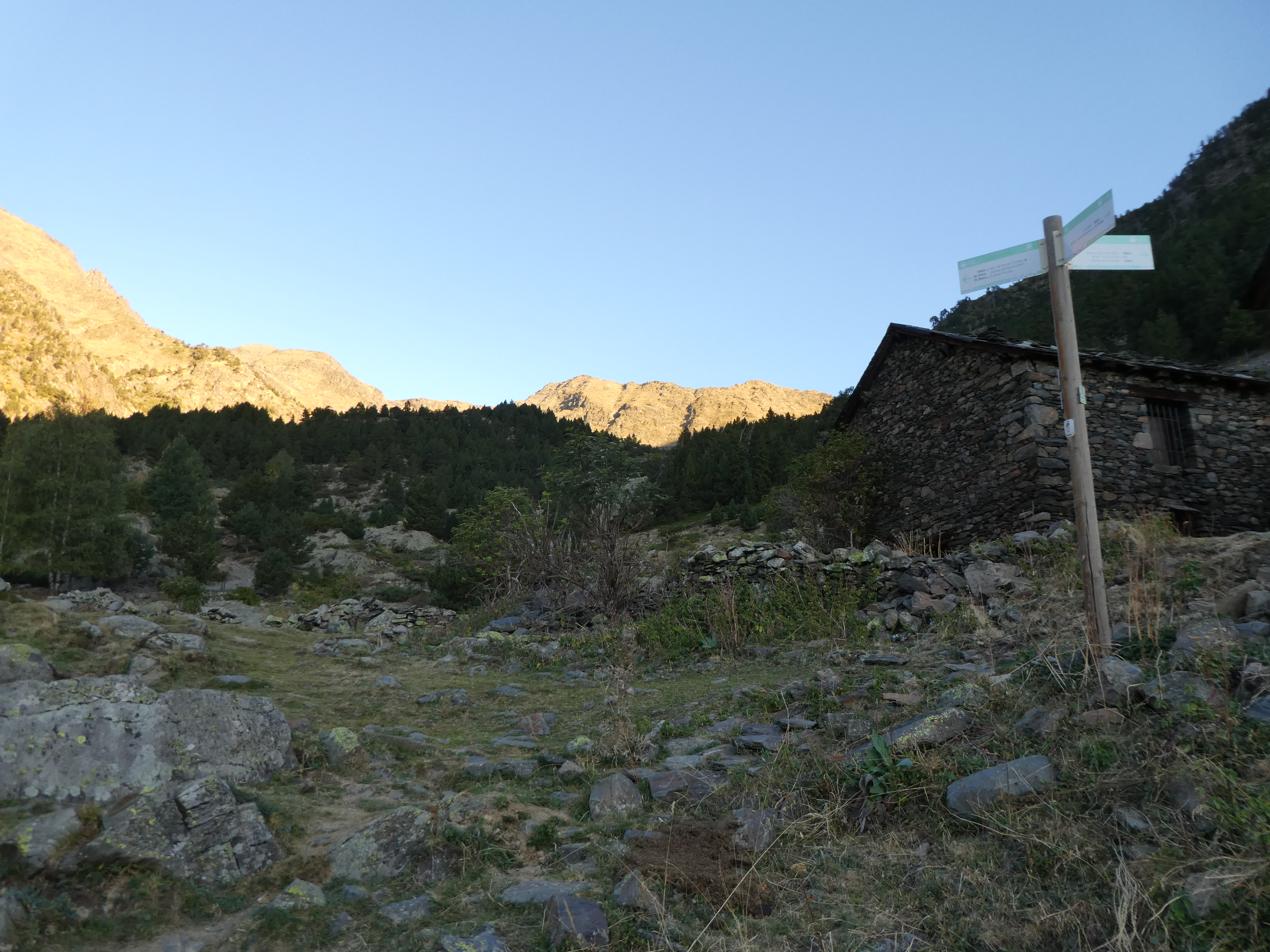 A ce croisement marqué par la présence d'un panneau directionnel situé au niveau de la Borda de la Coruvilla (200 mètres après le précédent), suivre le chemin partant sur la gauche direction Refugi del Pla de l'Estany, balisé en rouge et blanc, et en jaune