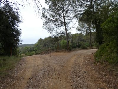 A ce croisement situé au niveau du Pi Centenari del Desert (500 mètres après le dédoublement de chemin), suivre le large chemin partant tout droit direction Espinavessa, balisé en balises VTT n°9 (ce croisement est situé juste après que le sentier ait atteint son point le plus bas)