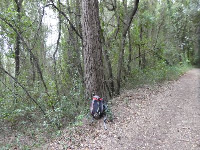 Vue sur le diamètre du tronc du pin centenaire ... et le sac à dos qui sert d'élément de comparaison !
