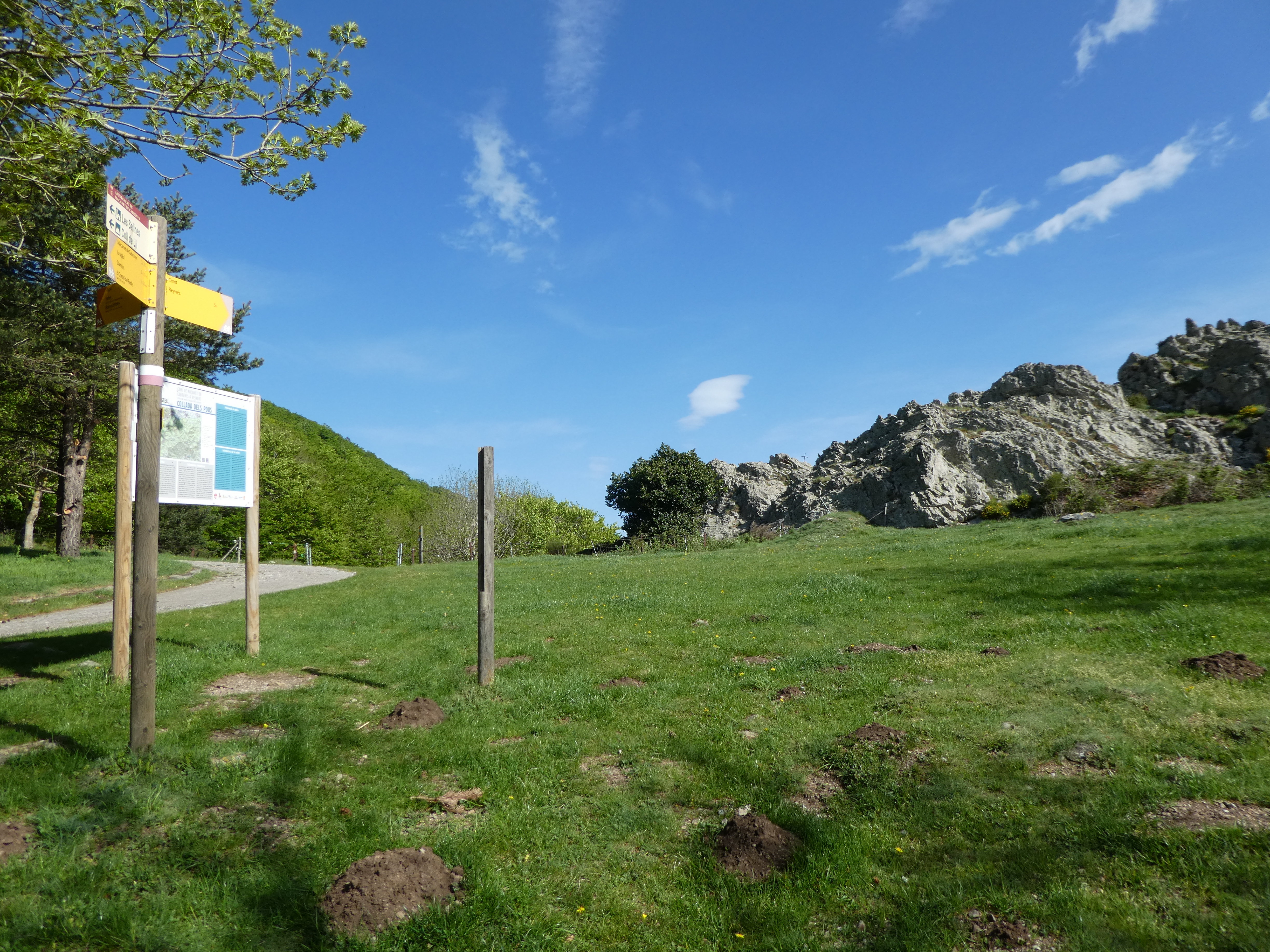 A ce croisement marqué par la présence d'un panneau directionnel (200 mètres après le précédent), suivre la rue partant sur la gauche puis le chemin partant sur la droite 25 mètres plus loin direction Maçanet de Cabrenys, balisé en rouge et blanc, et en jaune, et en vert et blanc