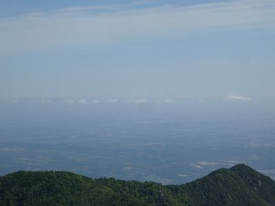 Zoom au loin sur le massif de Montseny avec le Turó de l'Home (1706 m) à gauche et le Matagalls (1697 m) à droite