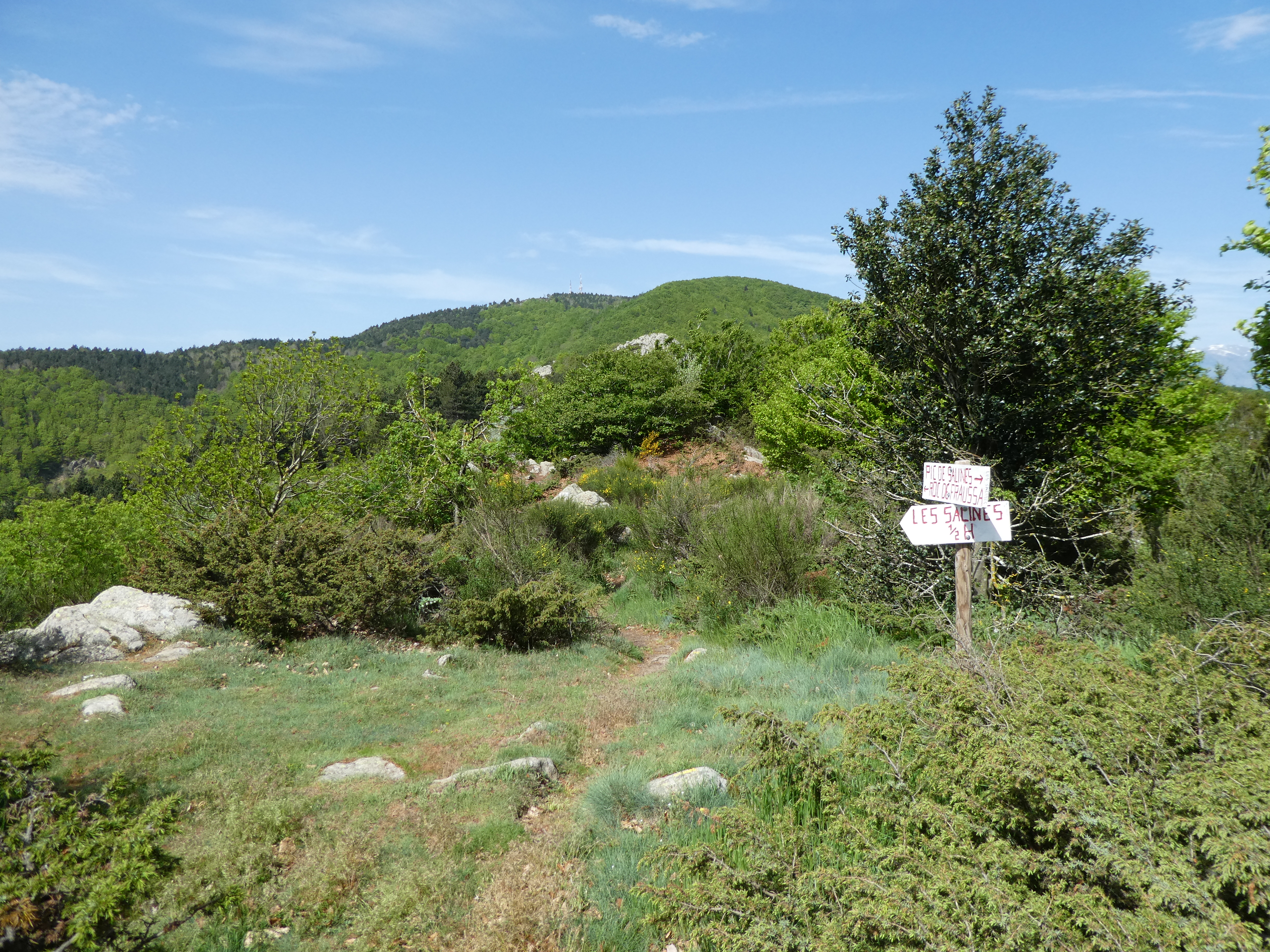 A ce croisement situé au niveau de la Font de les Salines et marqué par la présence d'un panneau directionnel (900 mètres après le Coll de les Cordes), suivre le chemin montant tout droit direction les Salines, balisé en rouge et blanc, et en jaune (le chemin partant sur la droite rejoint le Sentier de Fontfrède côté français)