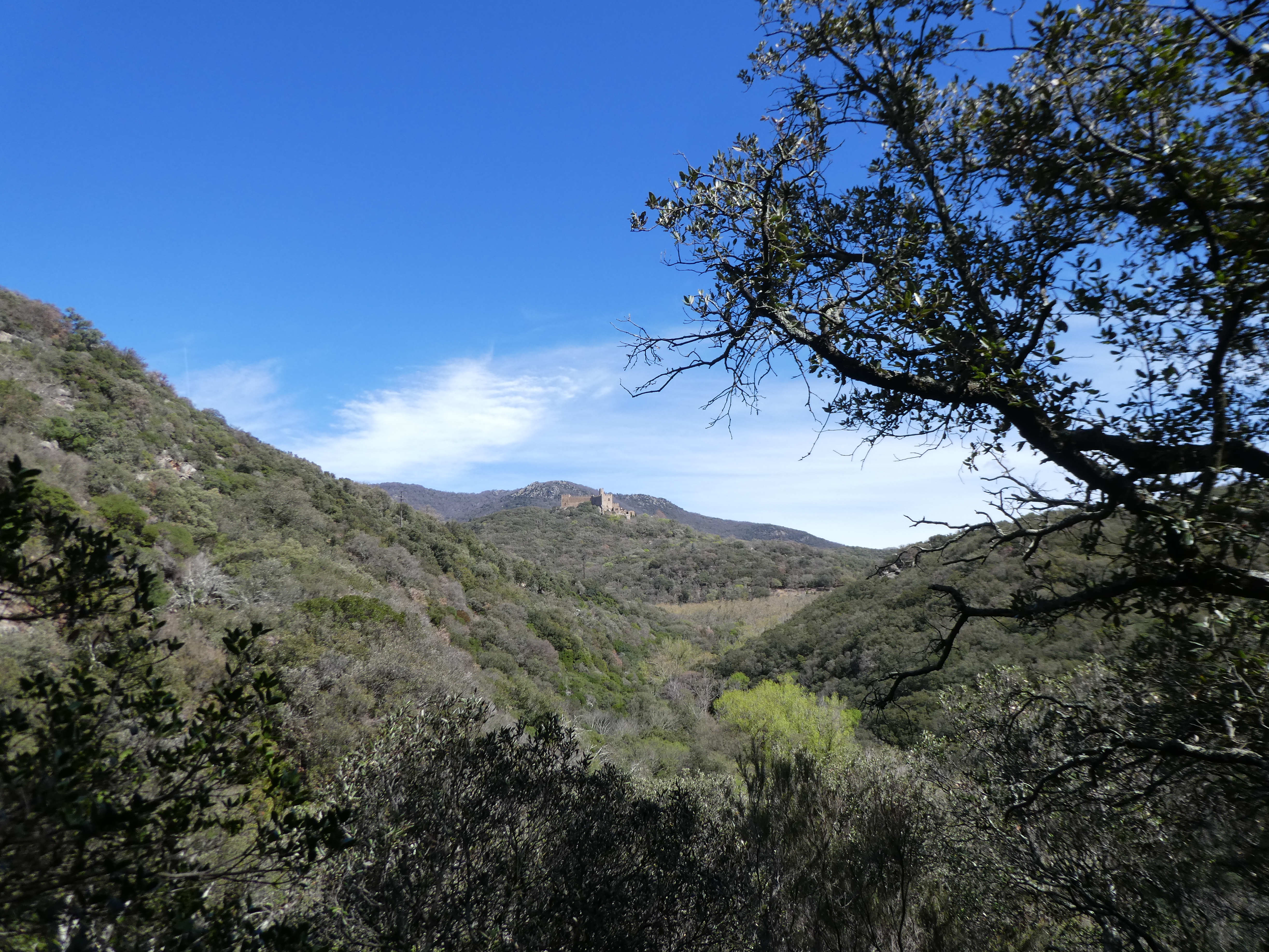 Vue au loin sur le Castell de Requesens perché sur sa colline