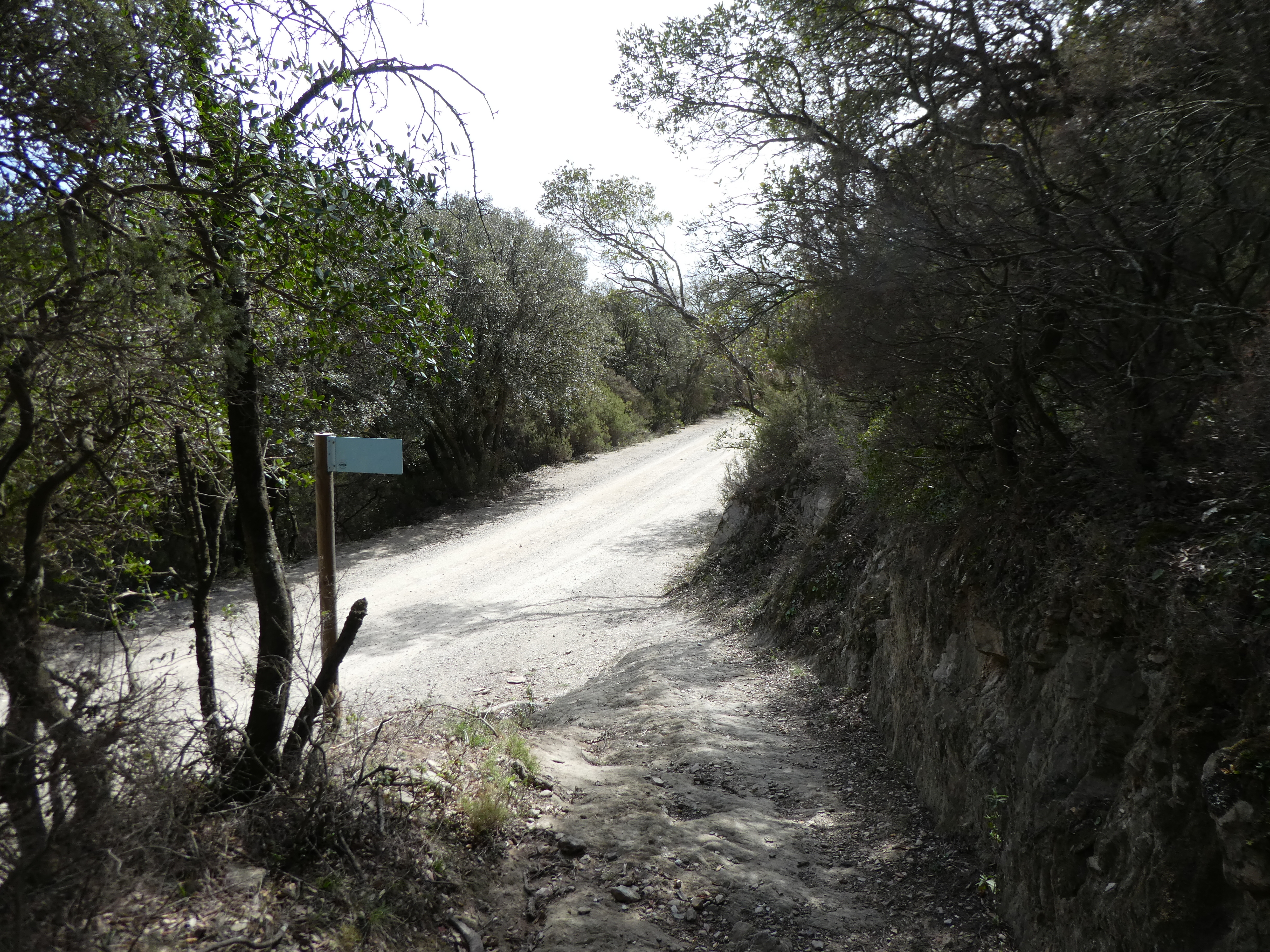 Dès que le sous-bois du Puig Pinyer est atteint (150 mètres après avoir quitté le sommet), tourner à droite pour rejoindre le sentier balisé venant du Coll Forcat direction Coll Forcat