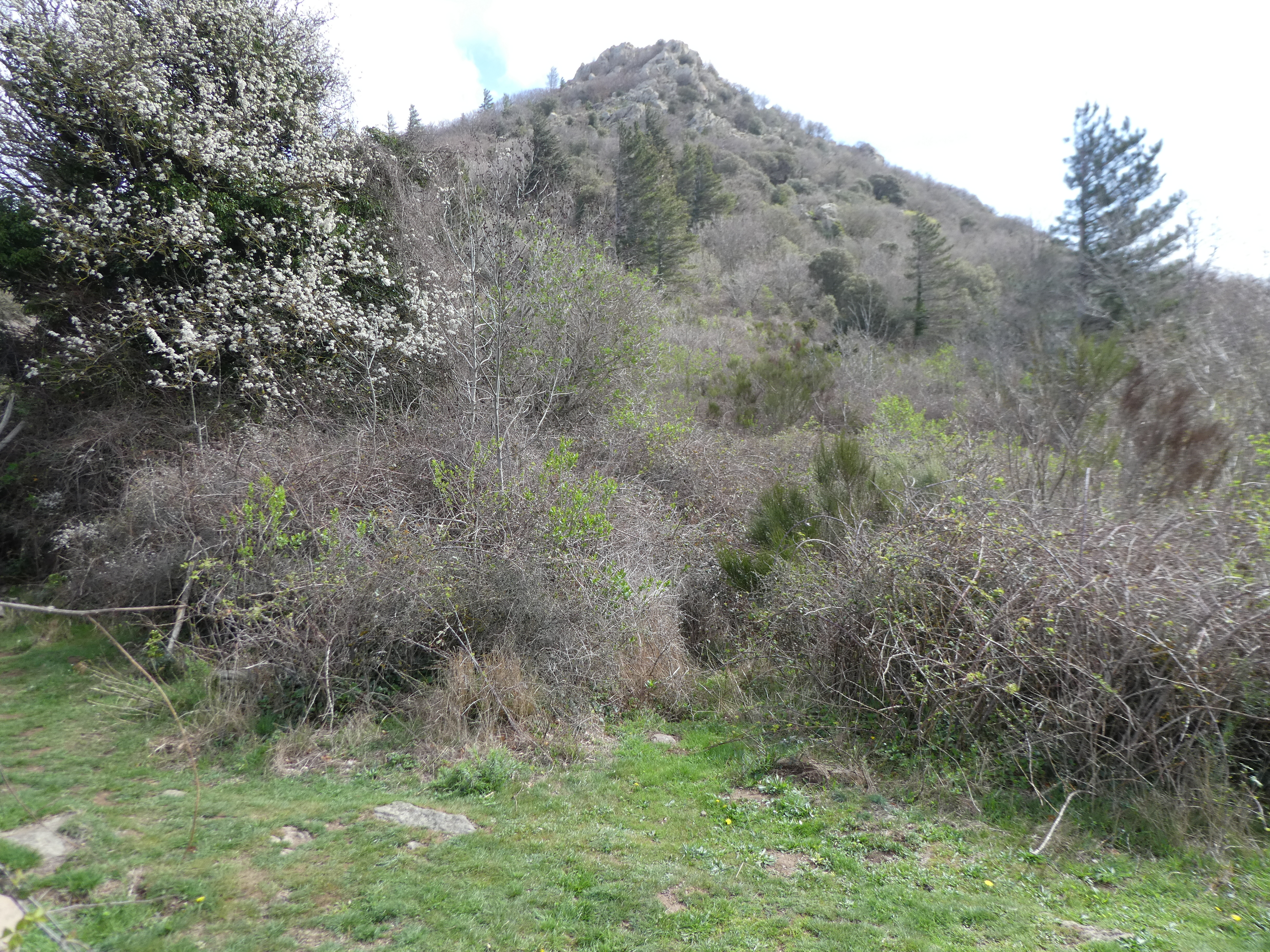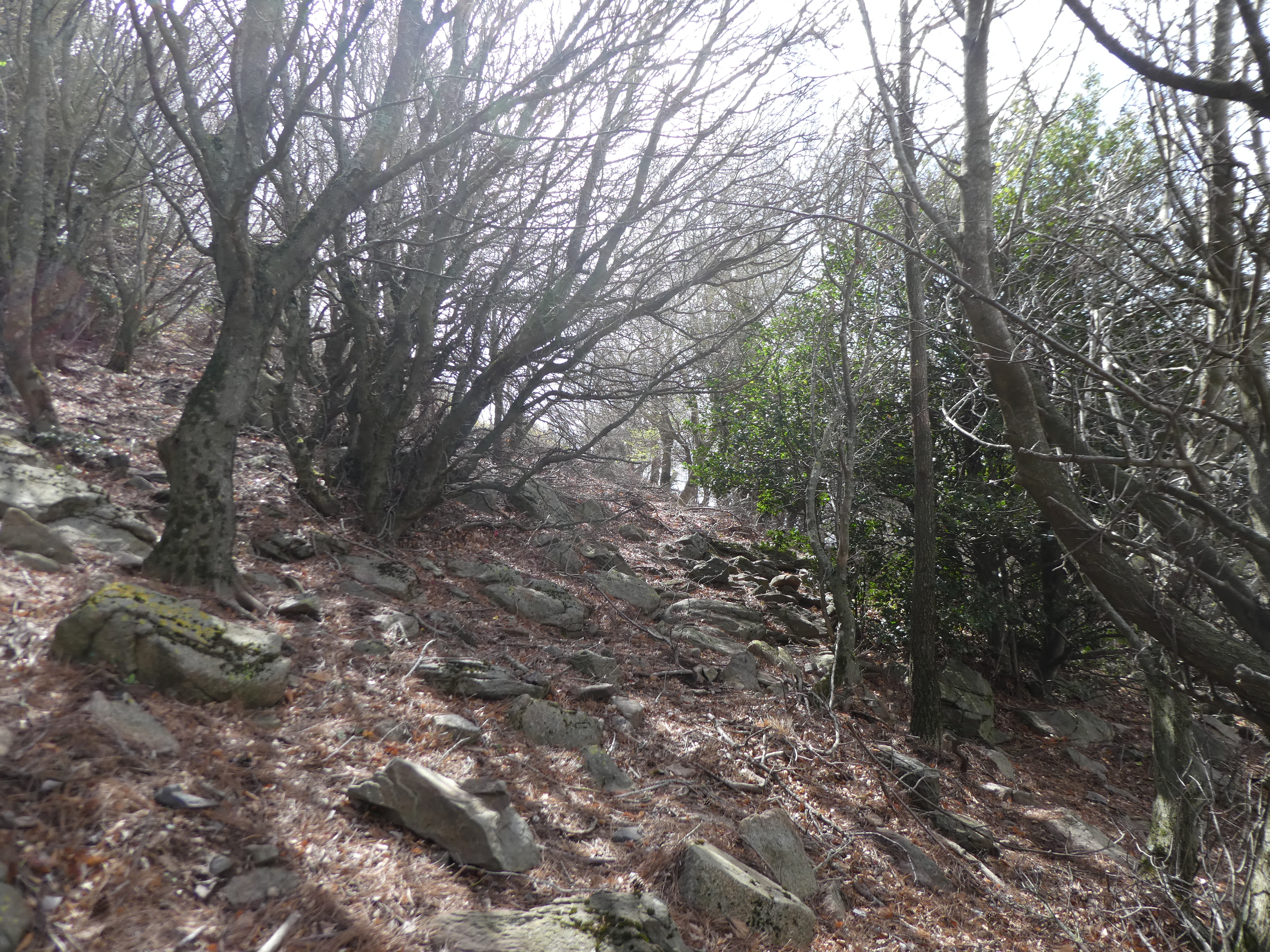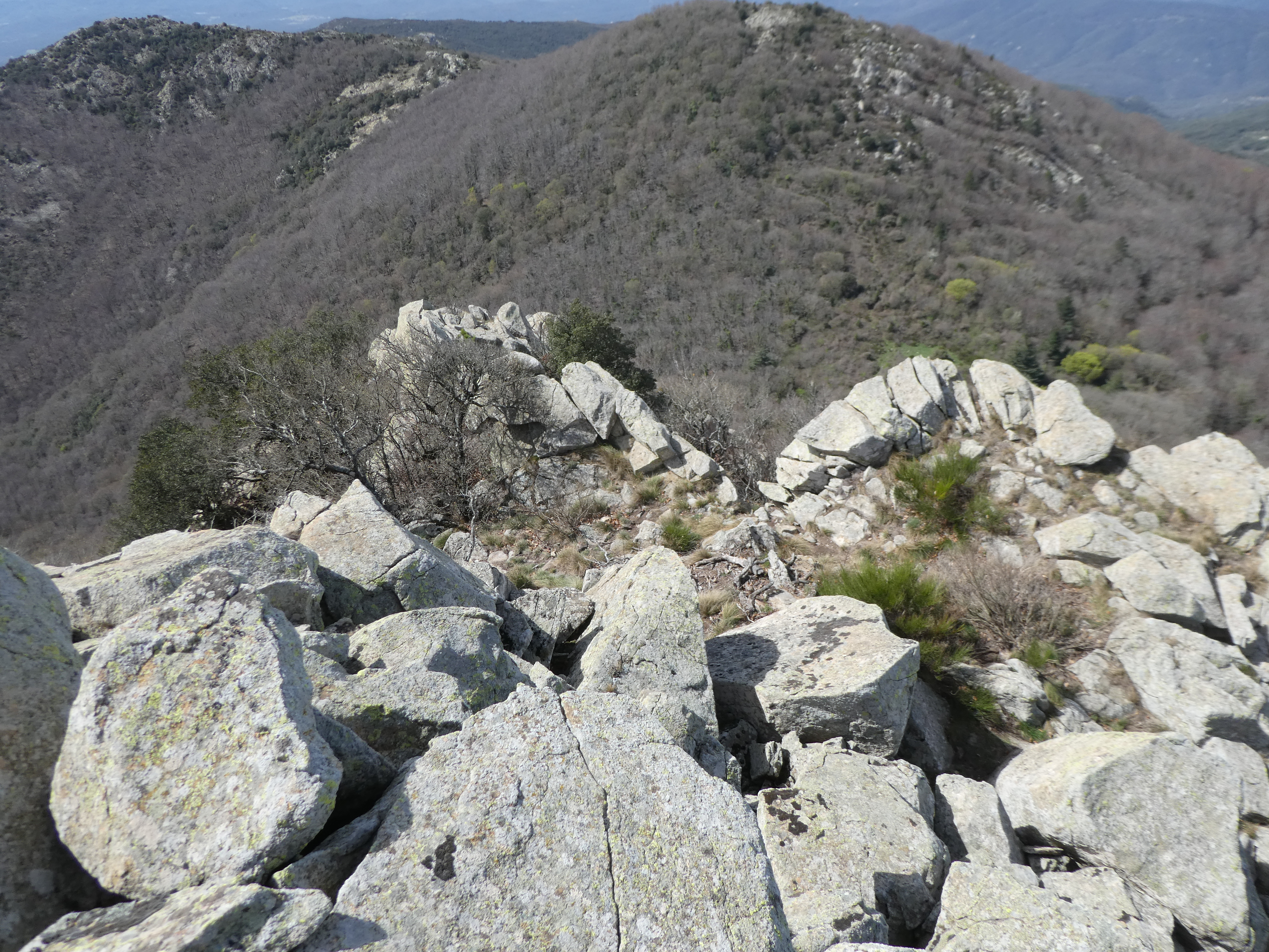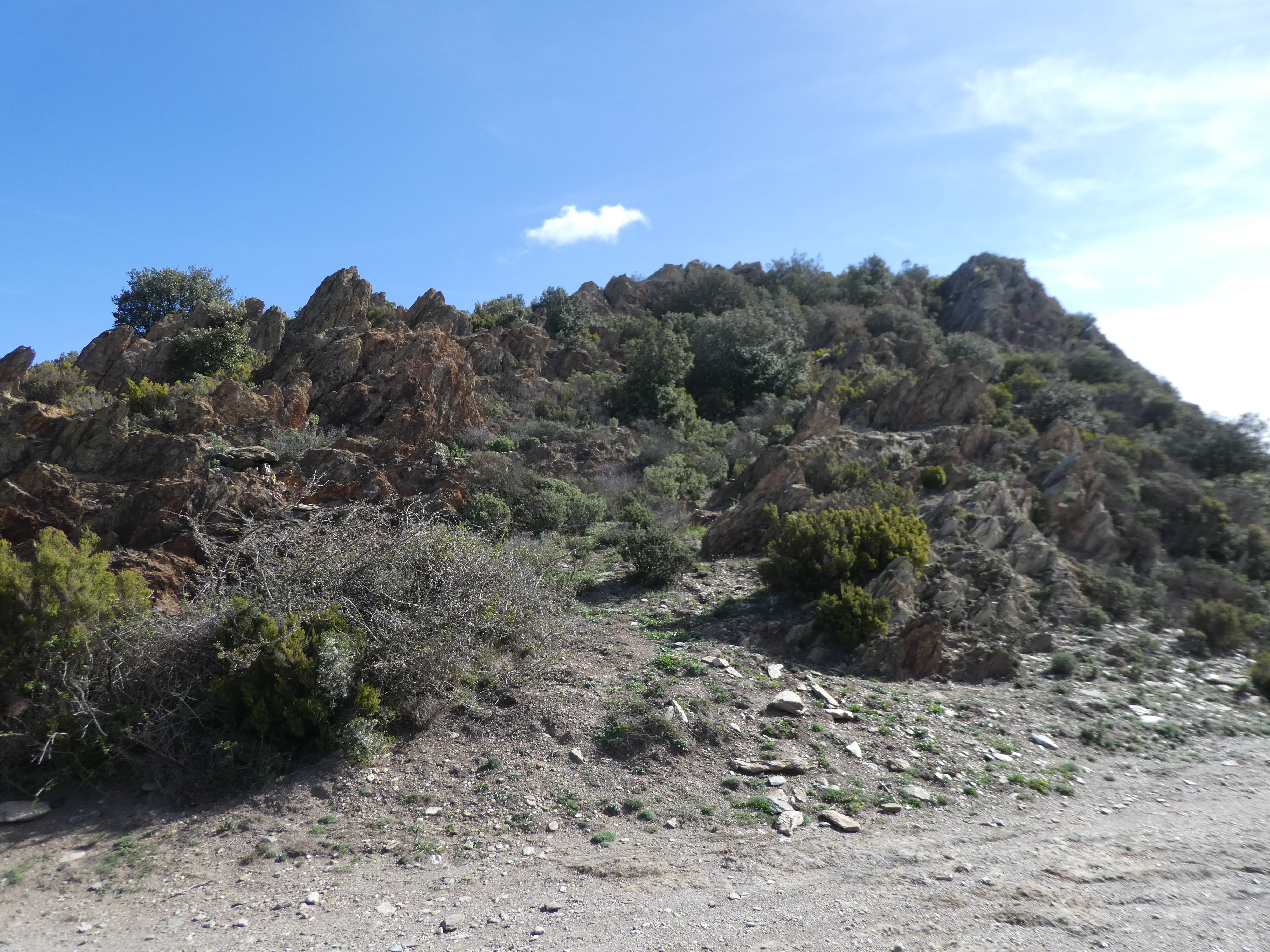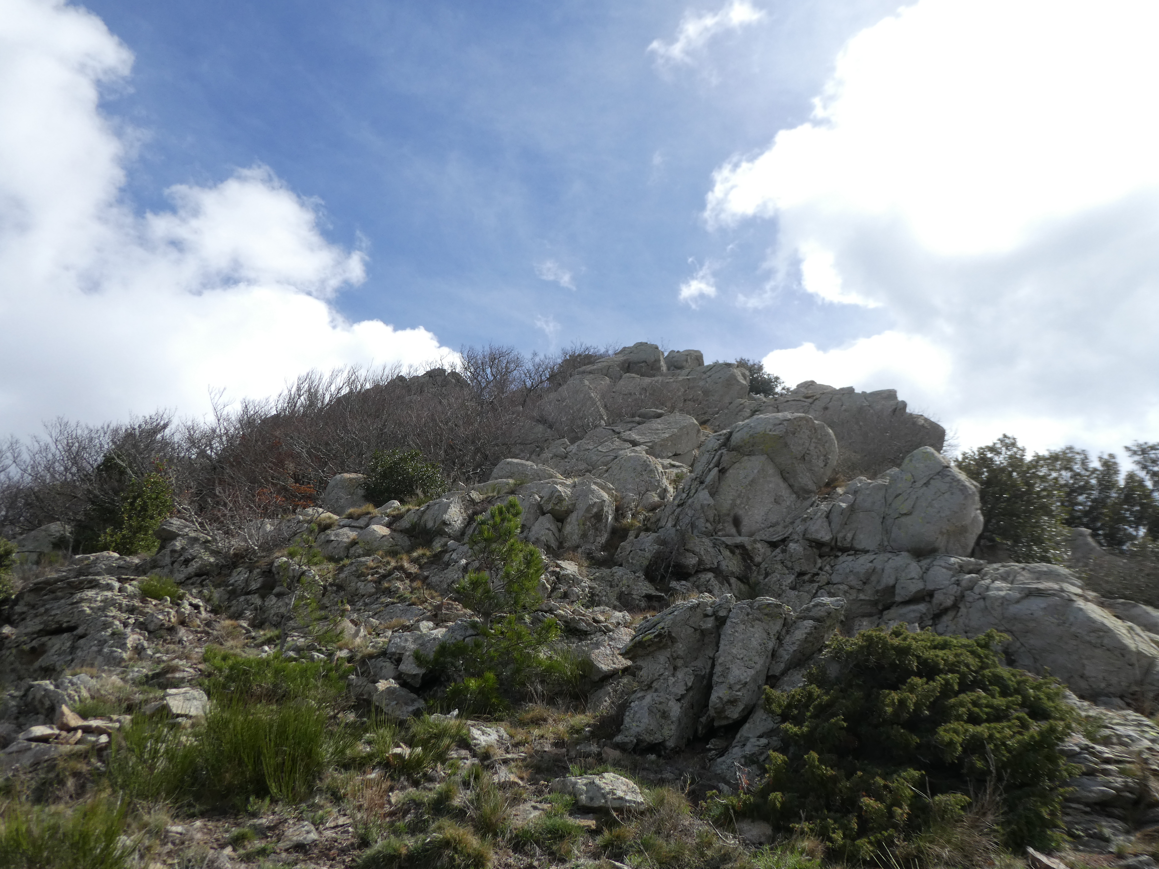 Dès que le sous-bois n'est plus pénétrable (100 mètres après le précédent pseudo-croisement), monter à vue sur la gauche pour atteindre les éboulis rocheux du sommet direction Puig Pinyer