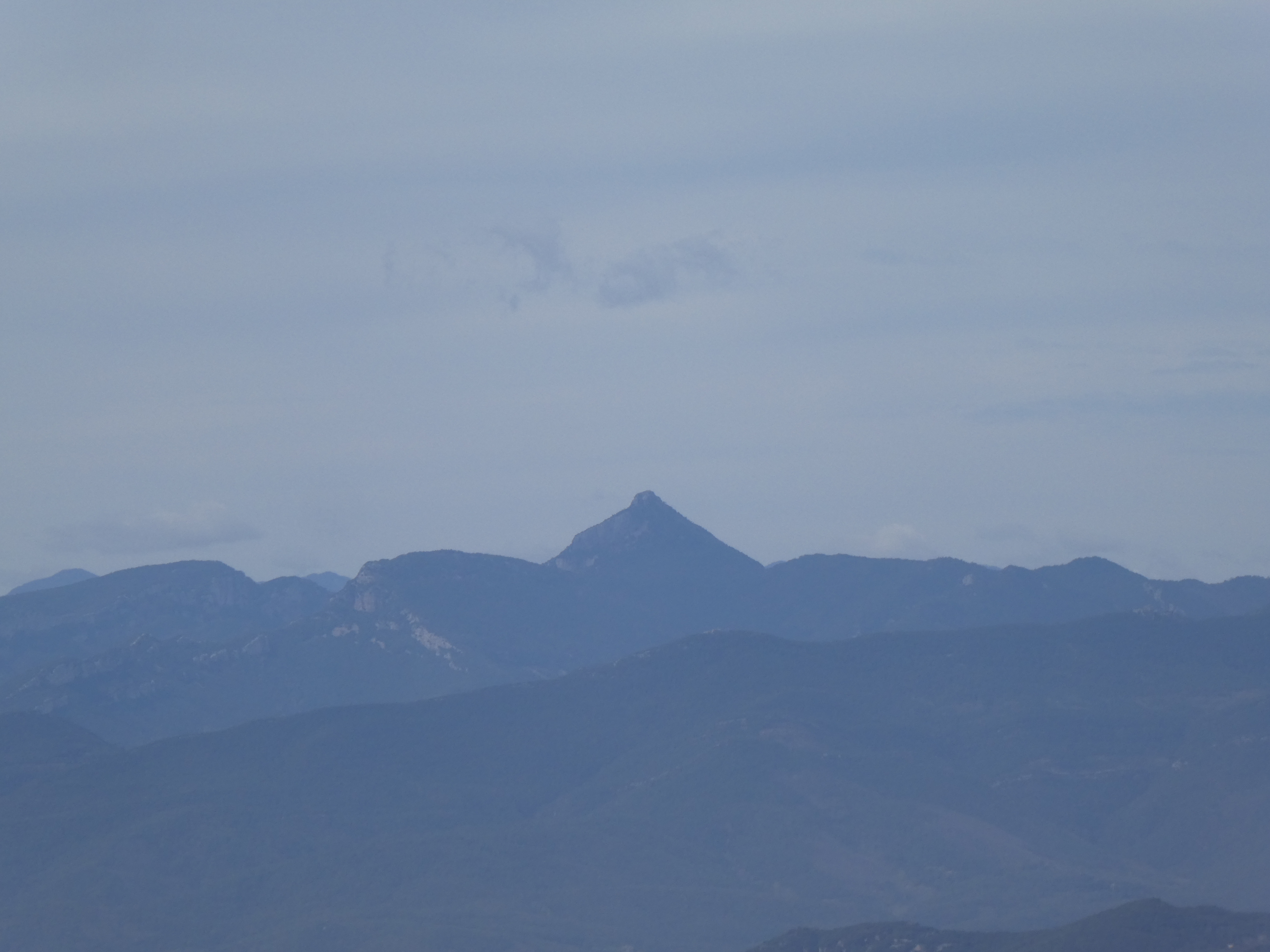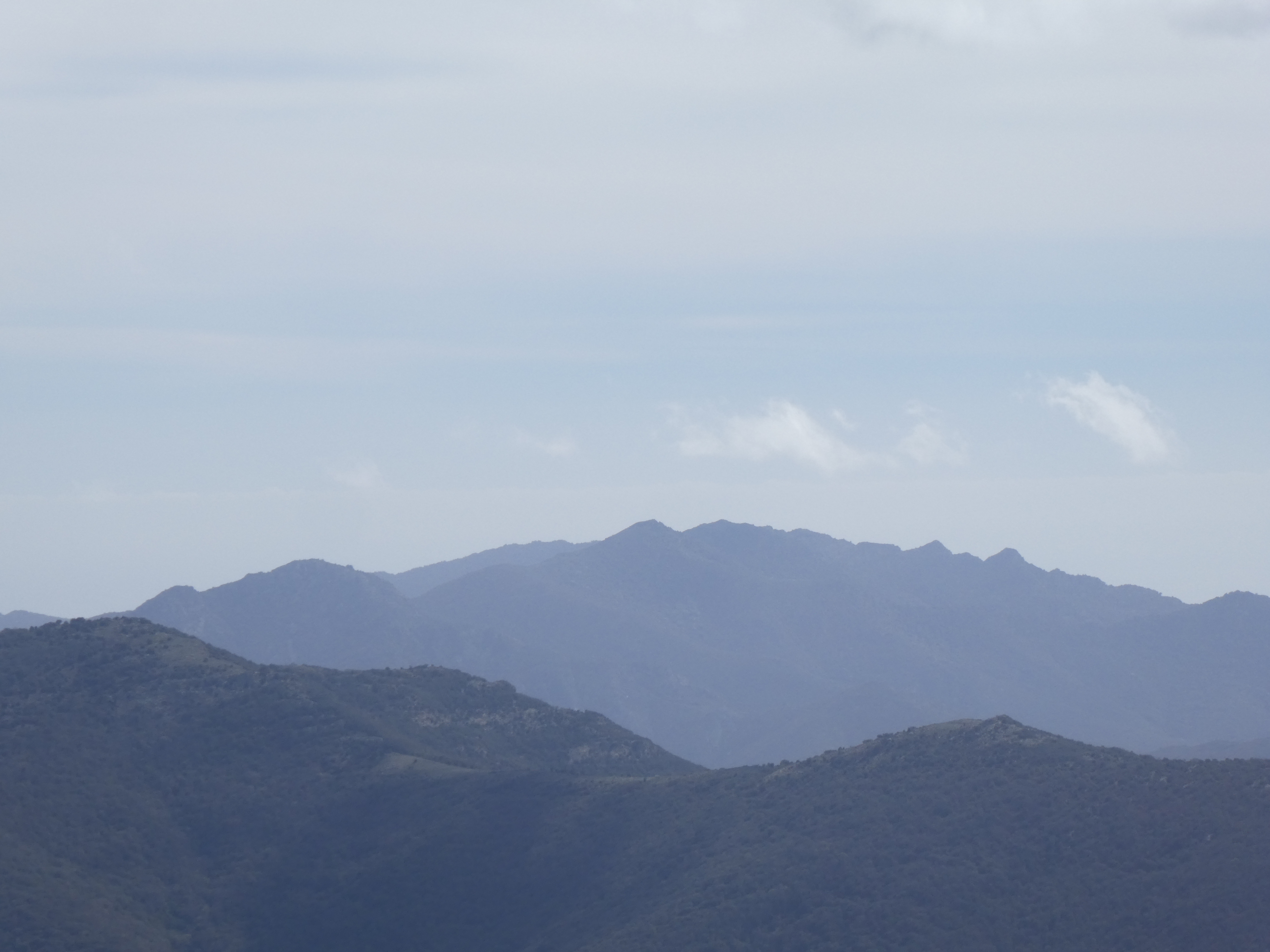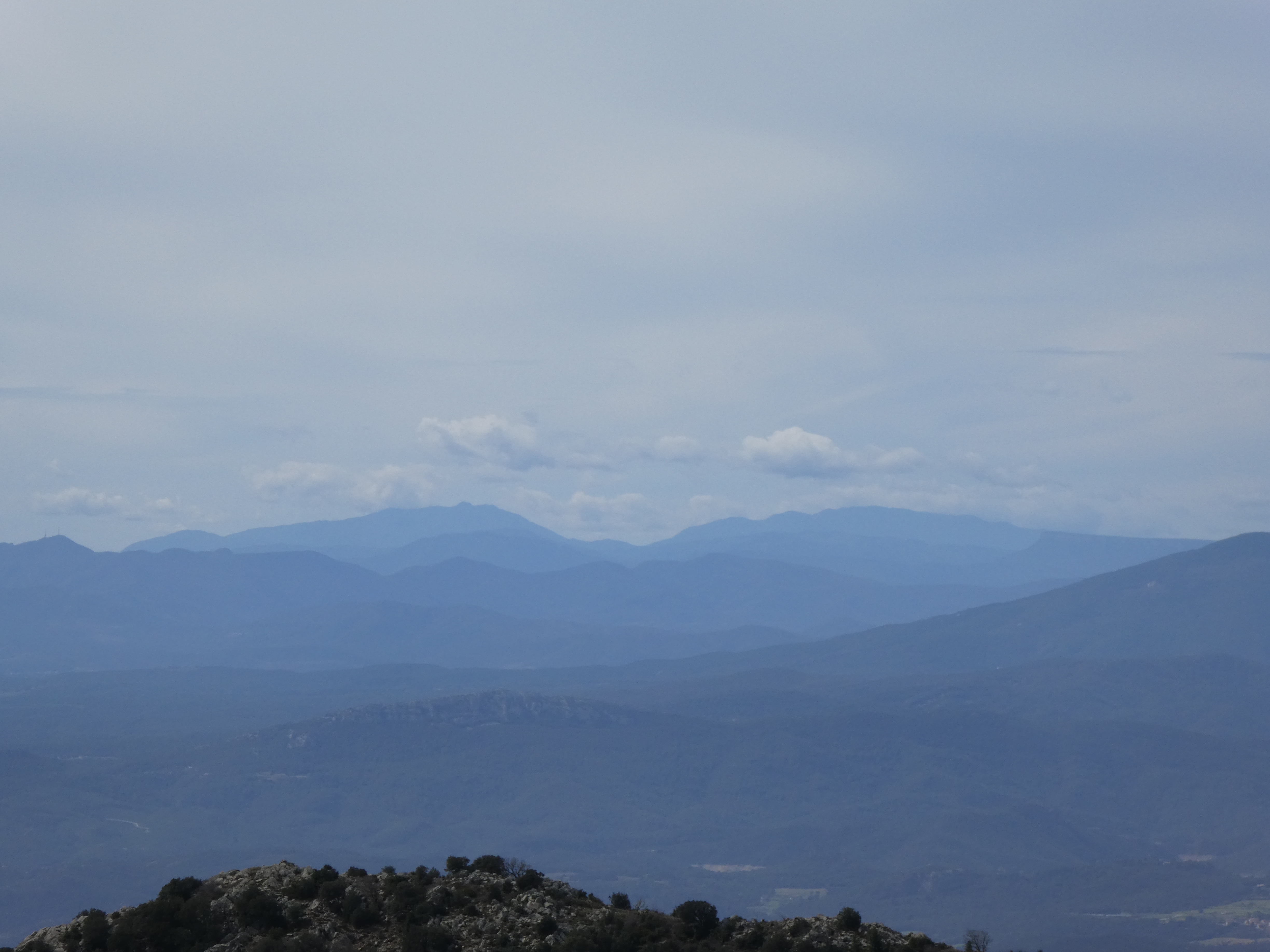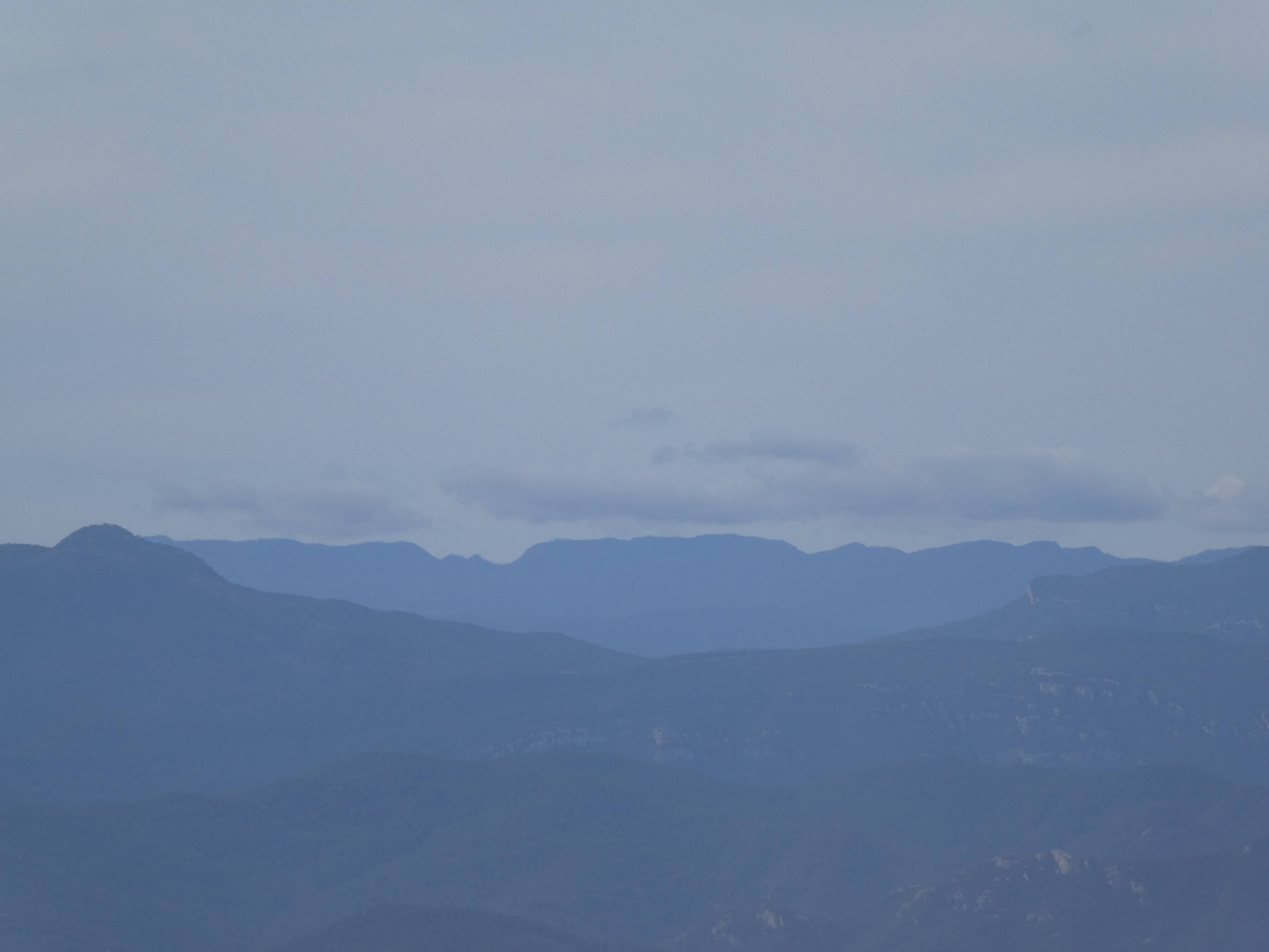 Zoom au loin sur le massif de Montseny avec les Agudes (1706 m) à gauche et Matagalls (1697 m) à droite