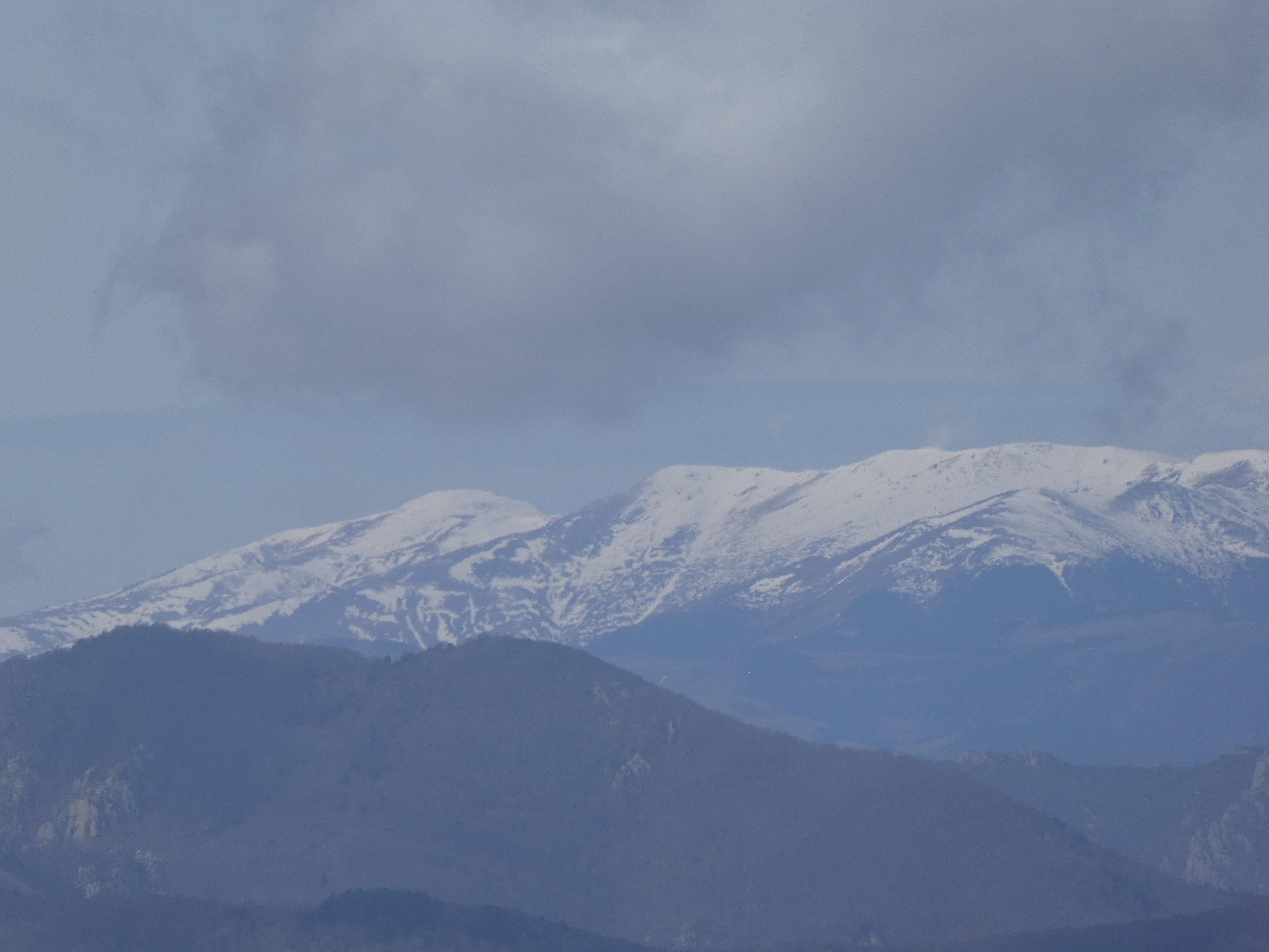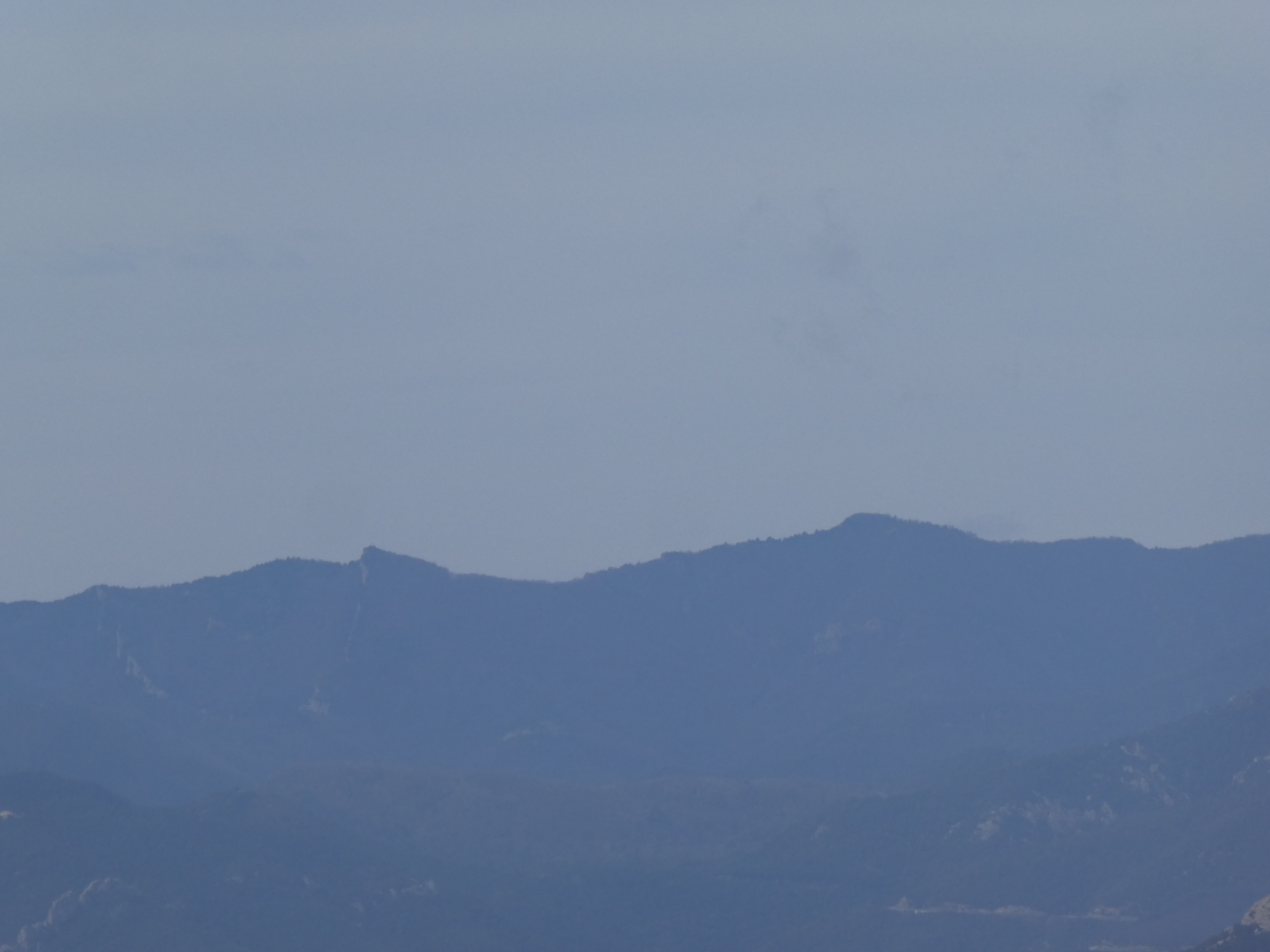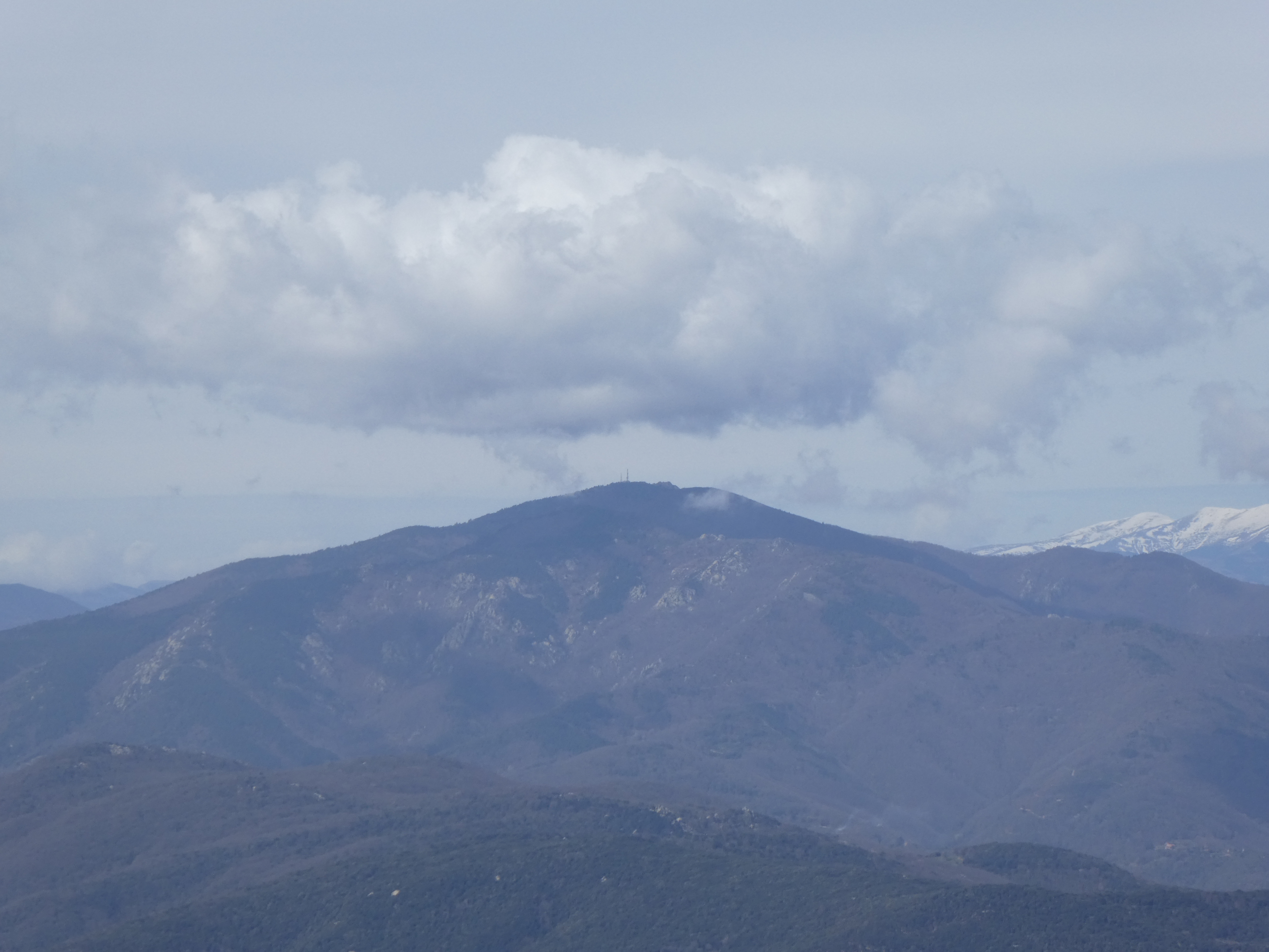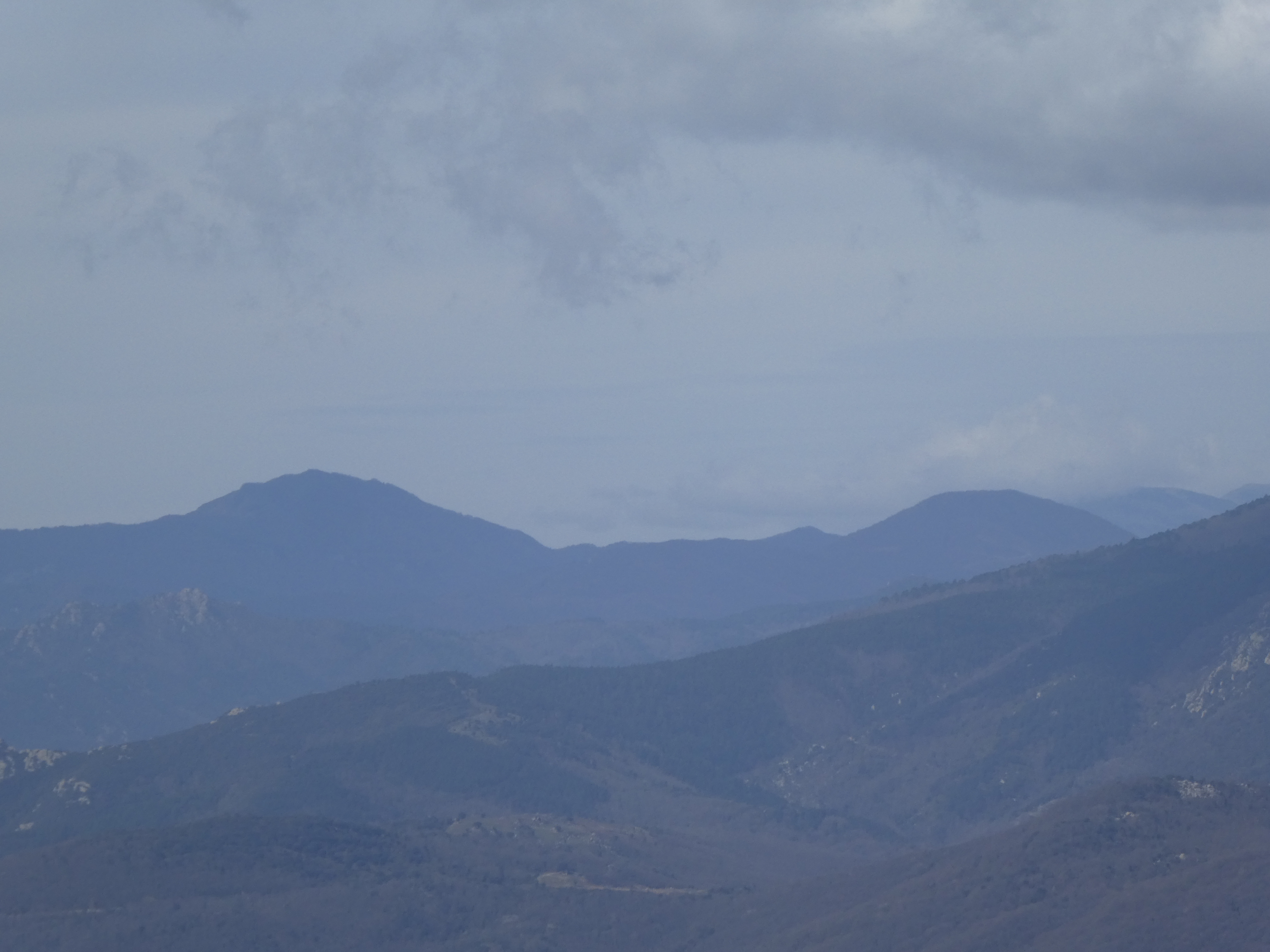 Zoom au loin sur le massif de Montseny avec les Agudes (1706 m) à gauche et Matagalls (1697 m) à droite