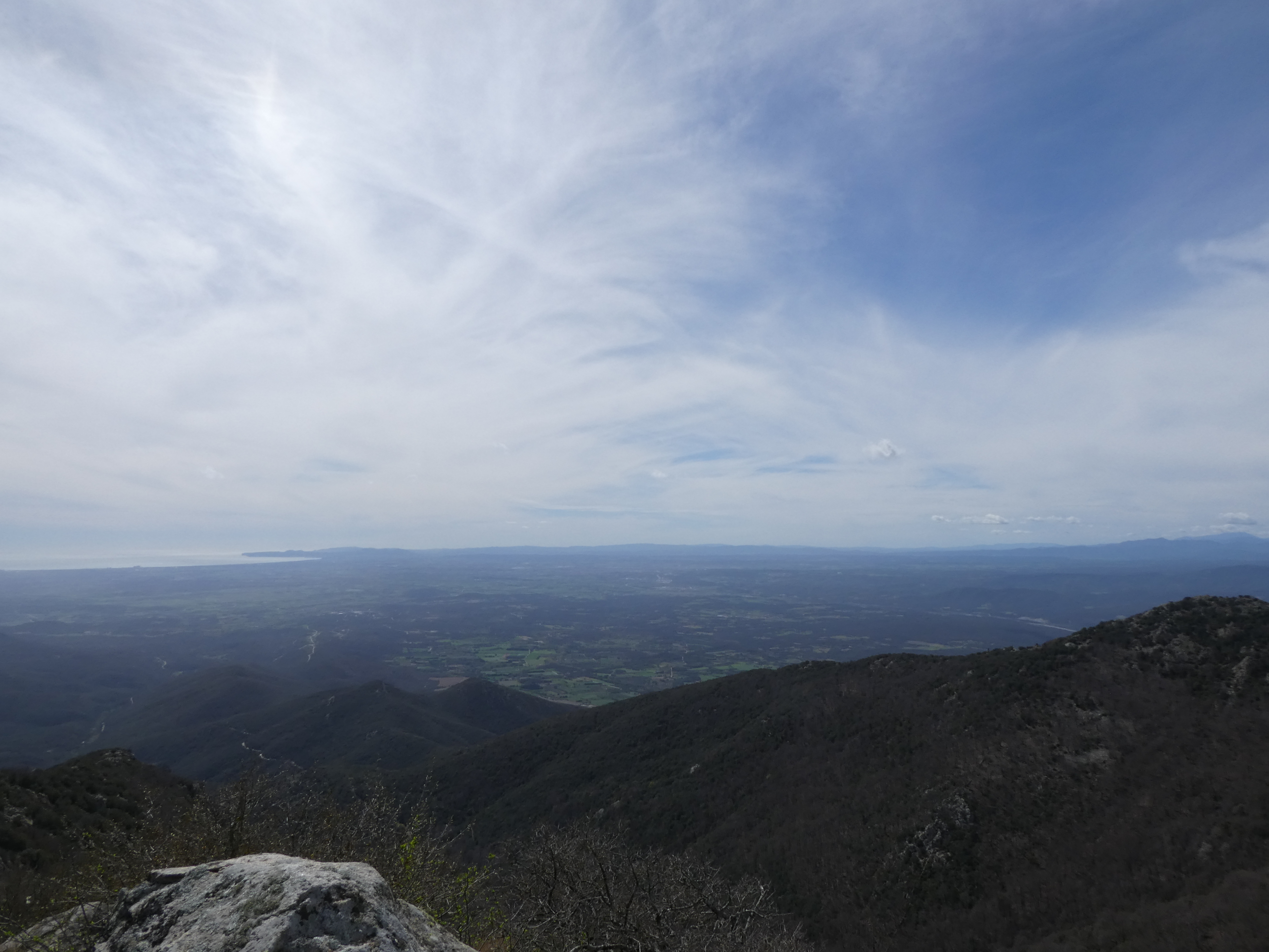 Arrivée au sommet du Puig Pinyer (952 m) : beau panorama sur les sommets des Albères, du Parc Natural de Cap de Creus, de l'Empordà, de la Garrotxa, du Haut-Vallespir ainsi que sur la plaine de l'Empordà, la baie de Roses et la Vallée du Tech